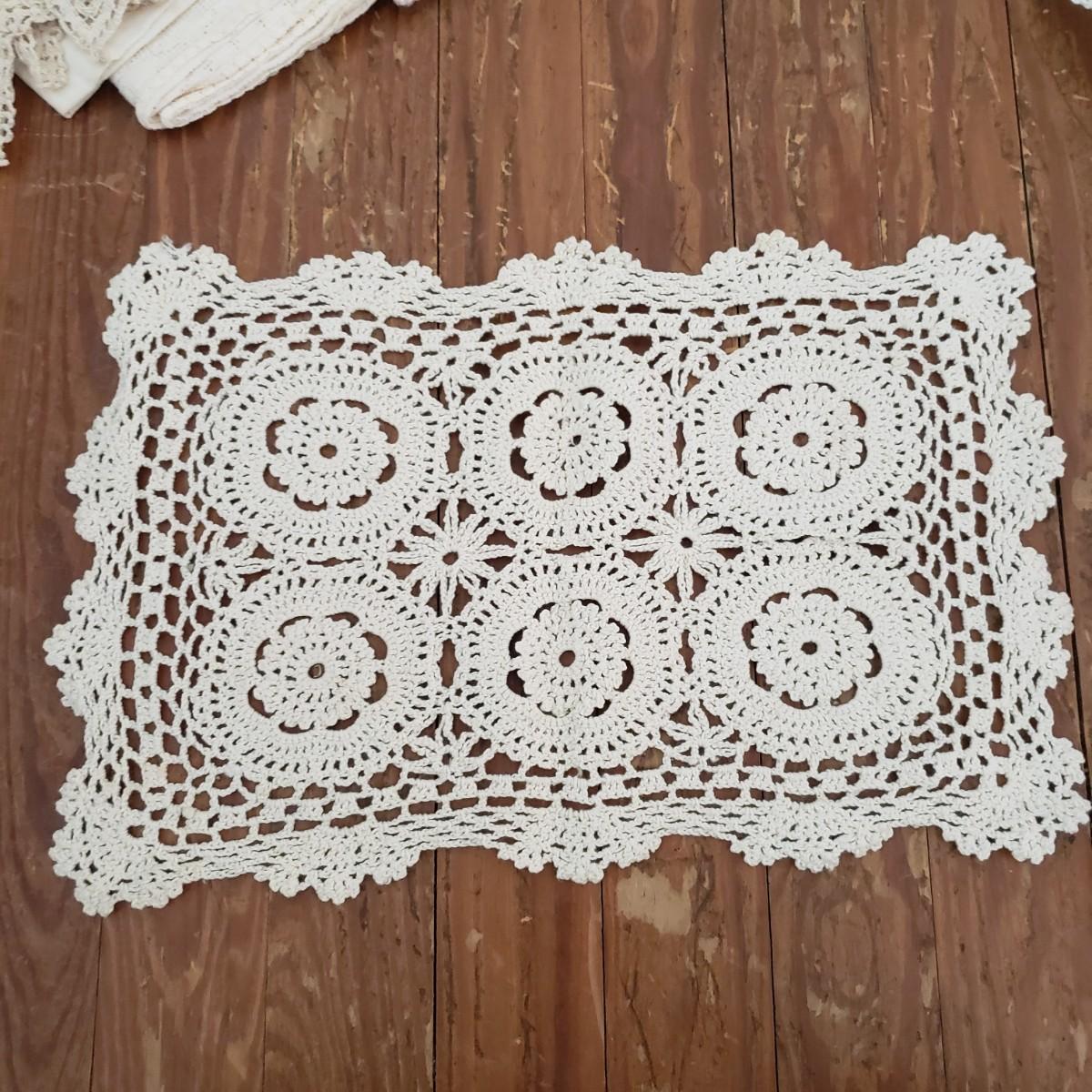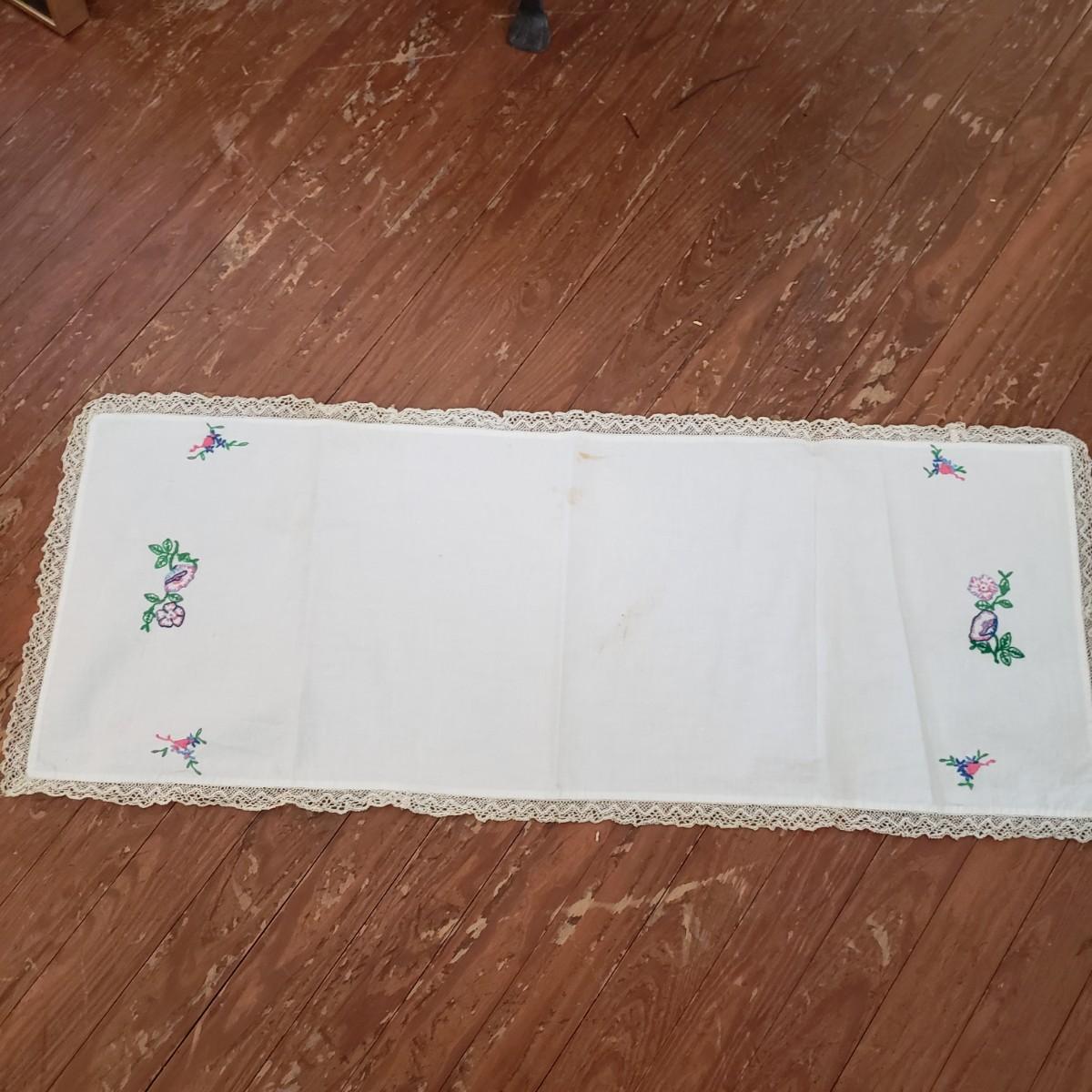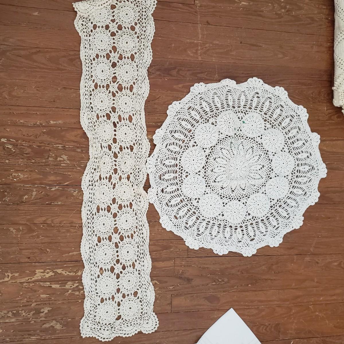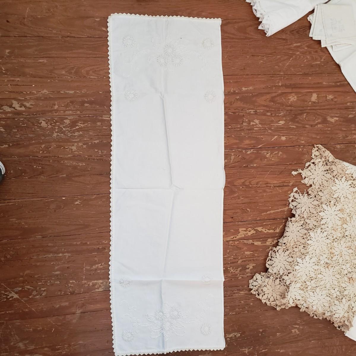This vintage linen lot has such sweet pieces to adorn your home! The white runner with colorful embroidery measures 35" x 15". The white circular battenburg table cloth measures 68". There are multiple runners and square table cloths with matching napkins. The rectangular all floral crocheted table cloth measures 53" x 38". Finally is the gorgeous twin sized (88" x 58") bed spread. It has edging around three sides and decorative five squares in the middle. Some overall wear due to age. Please see photos for details.