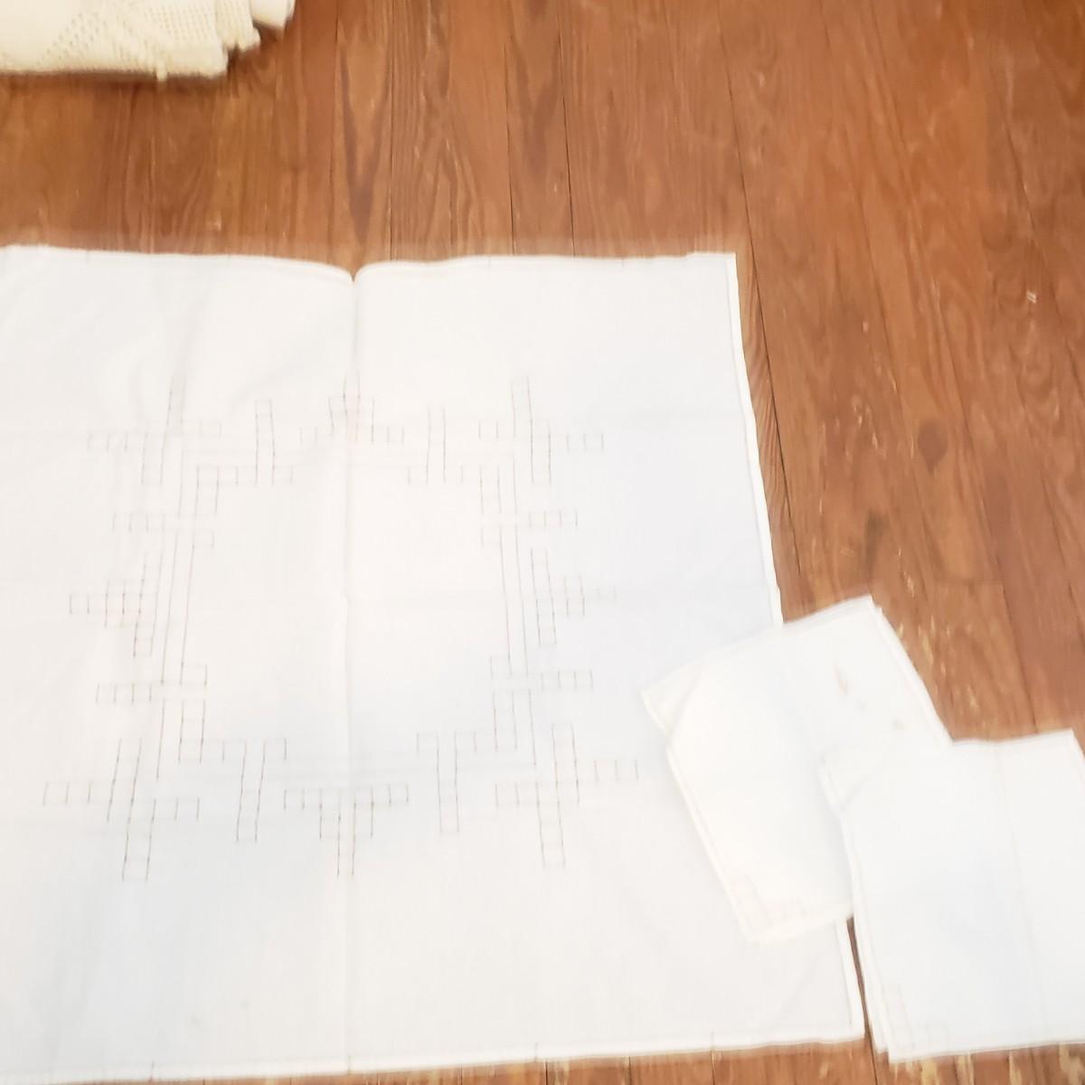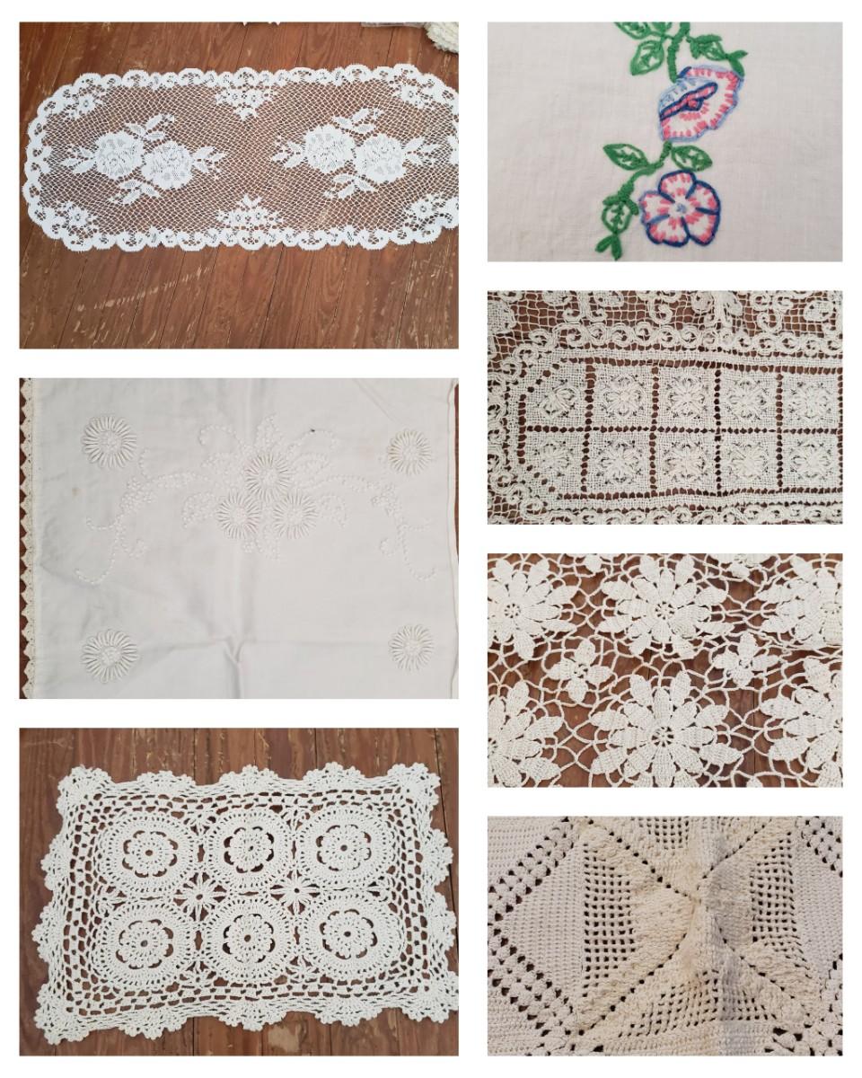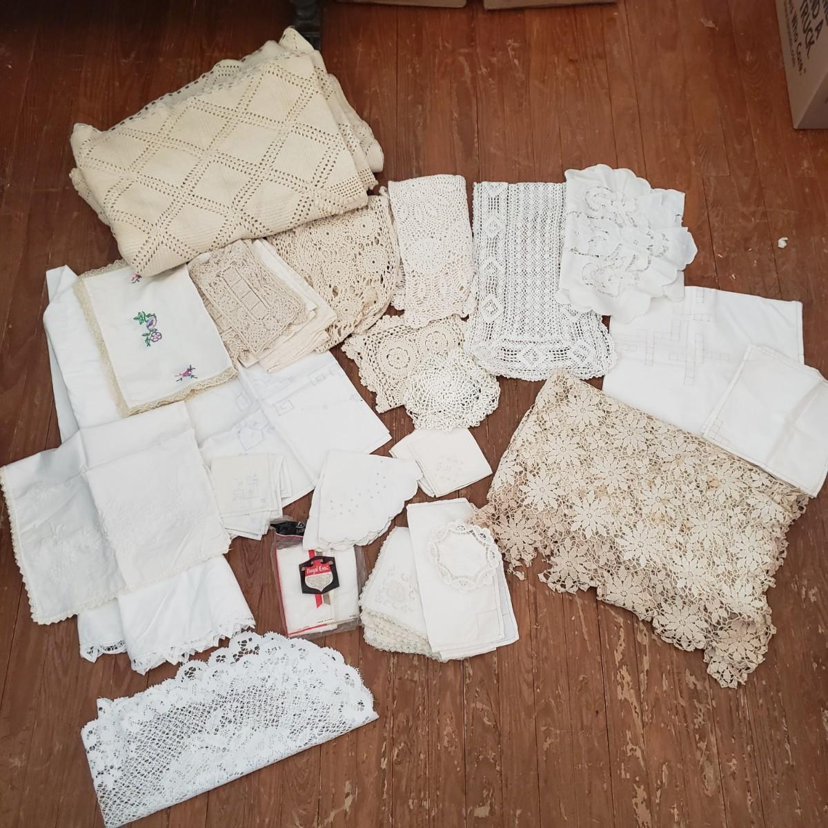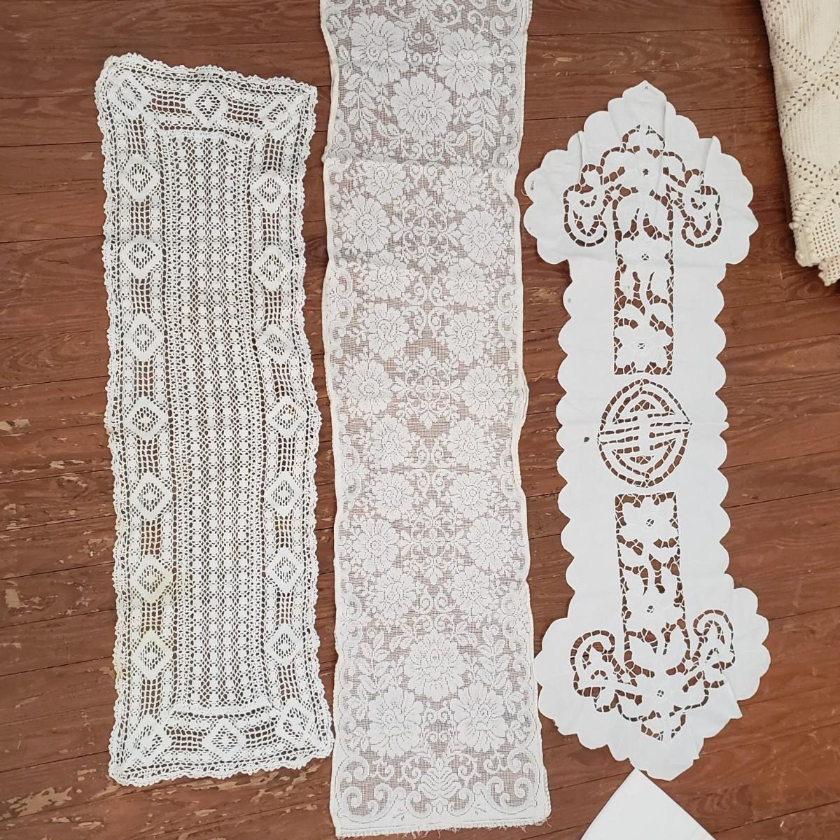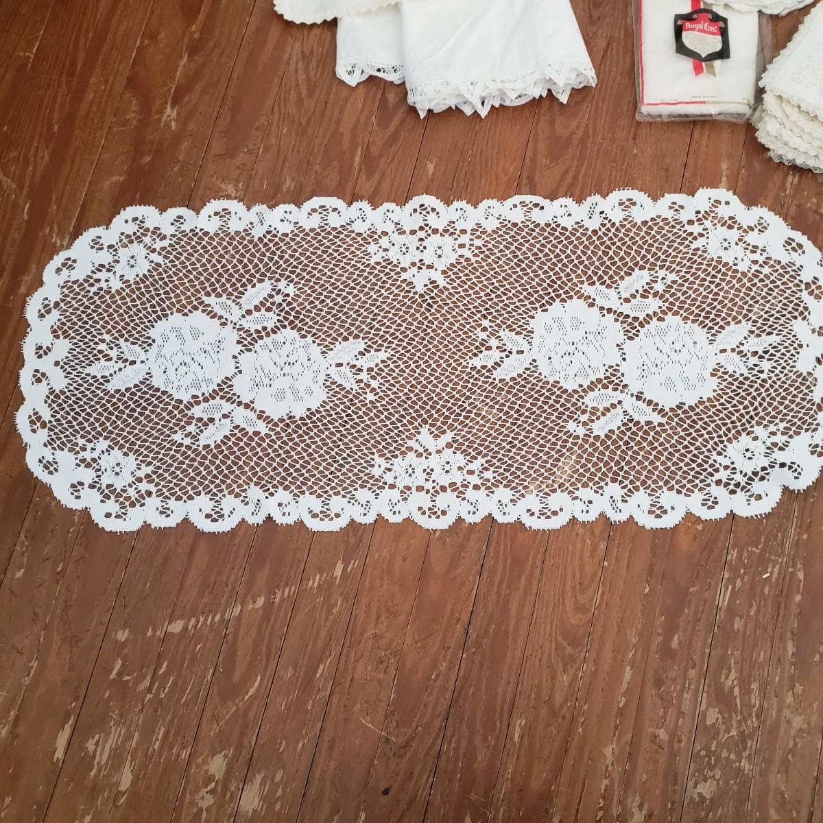 This vintage linen lot has such sweet pieces to adorn your home! The white runner with colorful embroidery measures 35" x 15". The white circular battenburg table cloth measures 68". There are multiple runners and square table cloths with matching napkins. The rectangular all floral crocheted table cloth measures 53" x 38". Finally is the gorgeous twin sized (88" x 58") bed spread. It has edging around three sides and decorative five squares in the middle. Some overall wear due to age. Please see photos for details.