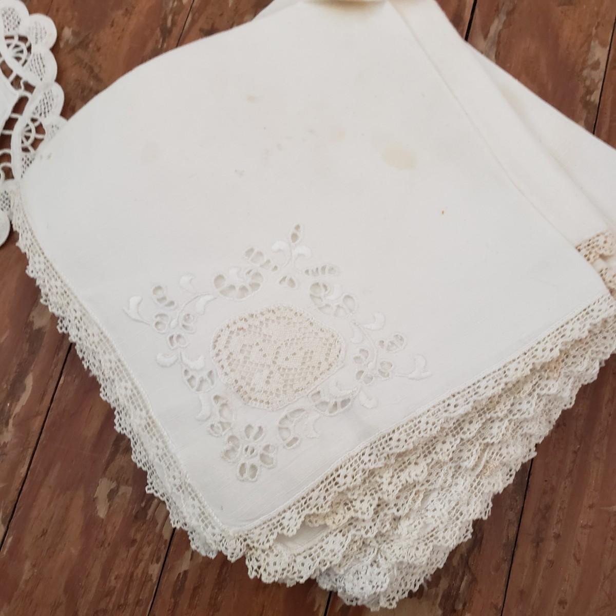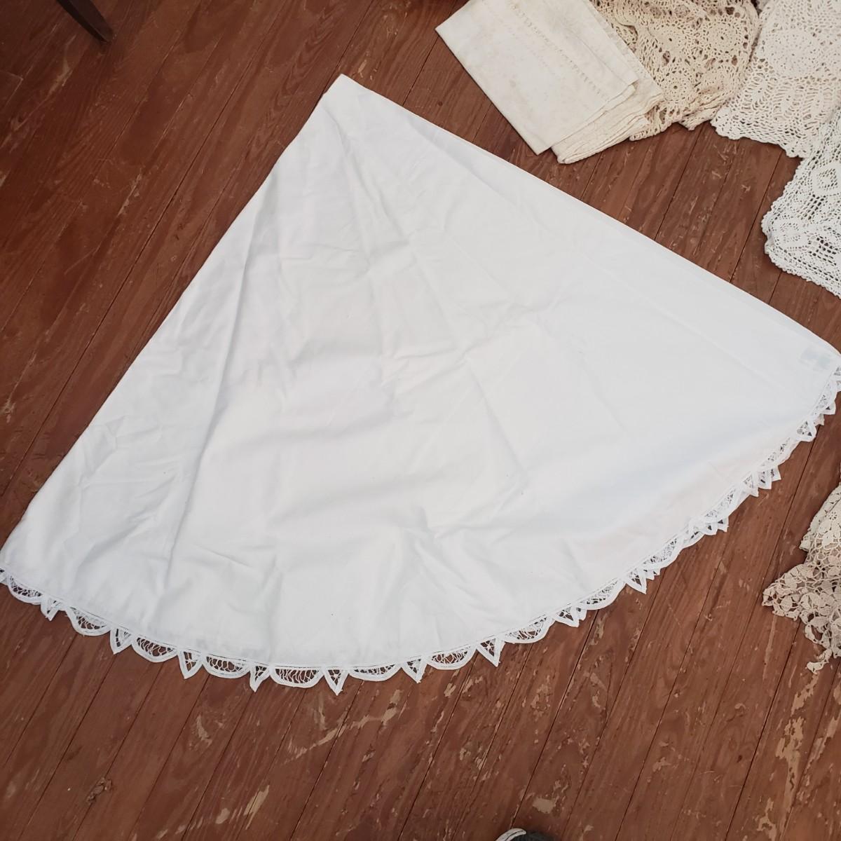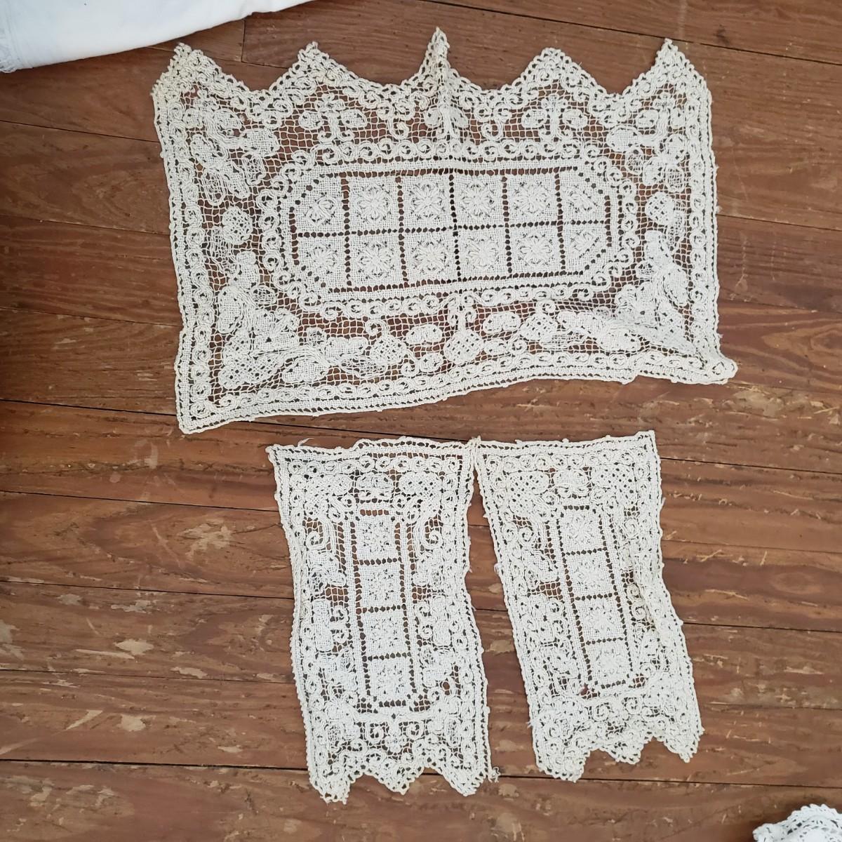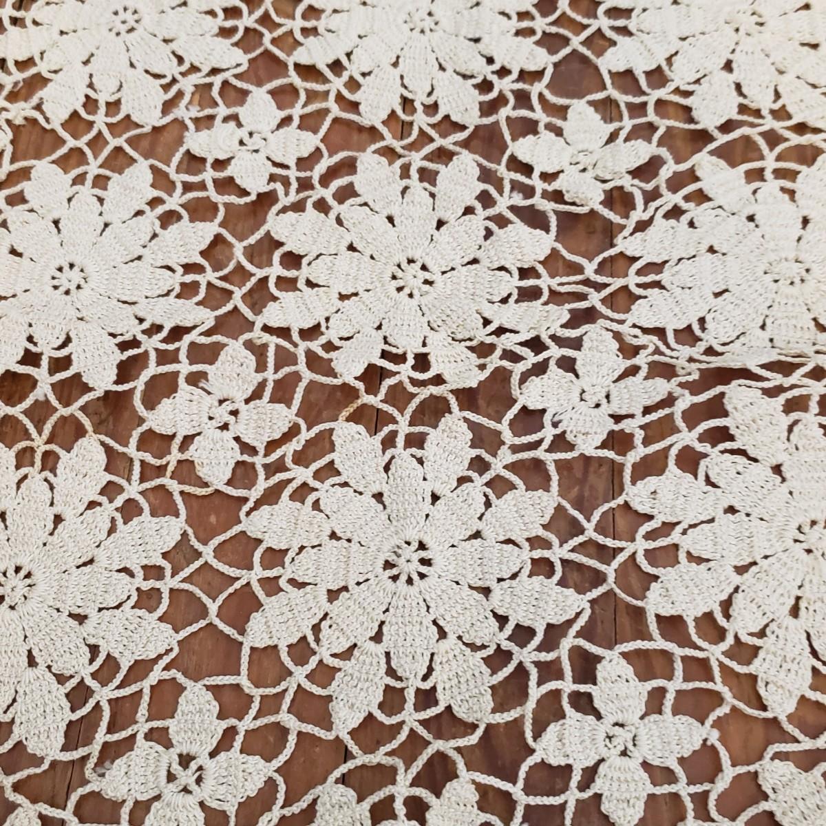 This vintage linen lot has such sweet pieces to adorn your home! The white runner with colorful embroidery measures 35" x 15". The white circular battenburg table cloth measures 68". There are multiple runners and square table cloths with matching napkins. The rectangular all floral crocheted table cloth measures 53" x 38". Finally is the gorgeous twin sized (88" x 58") bed spread. It has edging around three sides and decorative five squares in the middle. Some overall wear due to age. Please see photos for details.