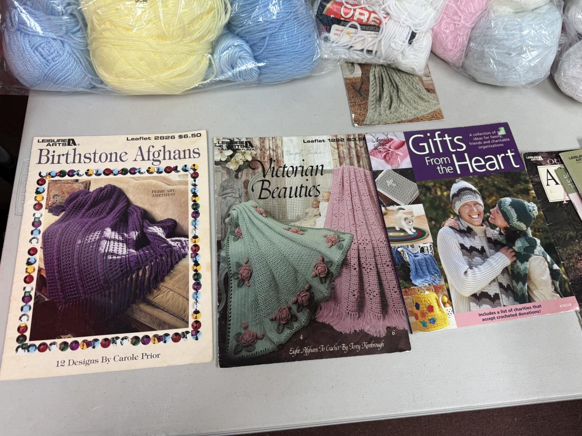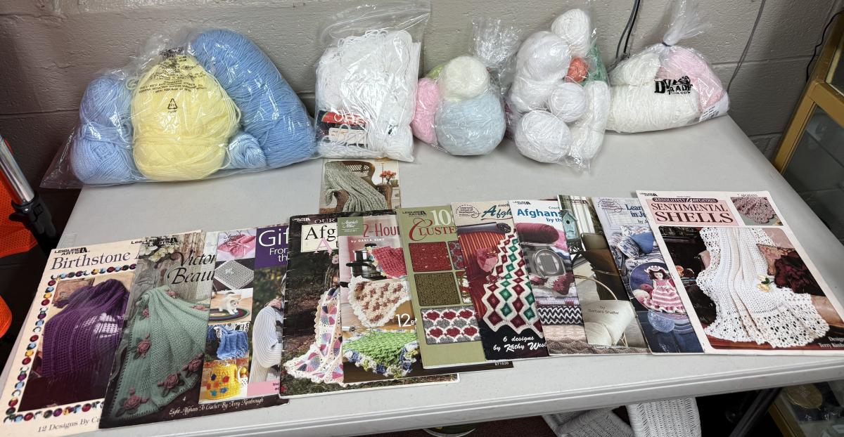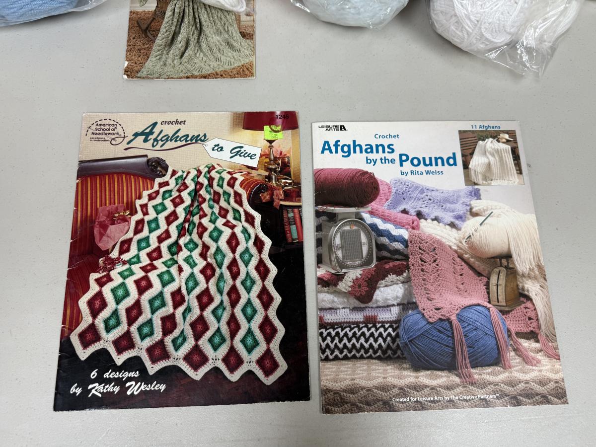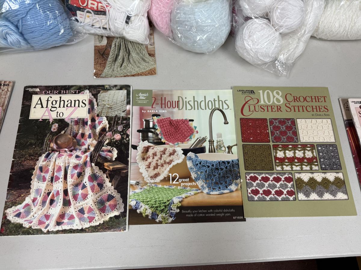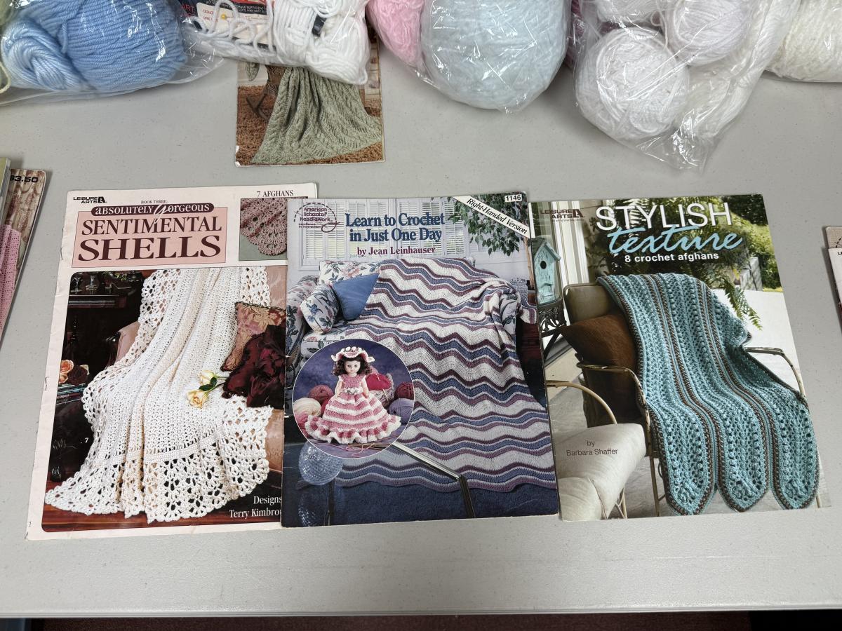 12 books, 5 bags of yarn