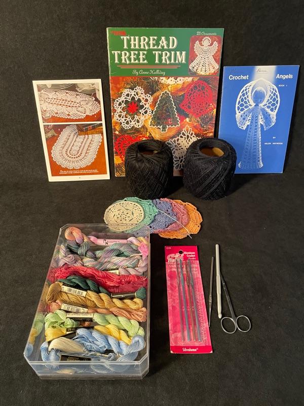 spools and skeins of crochet cotton, crochet hooks, scissor, three pattern books
