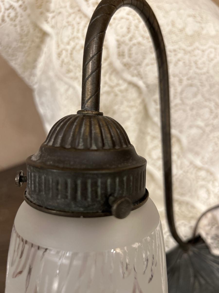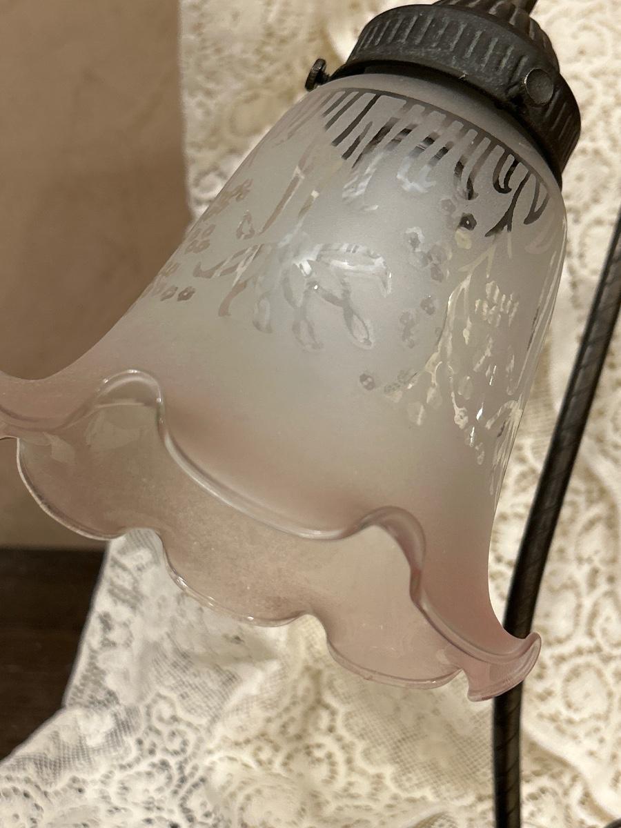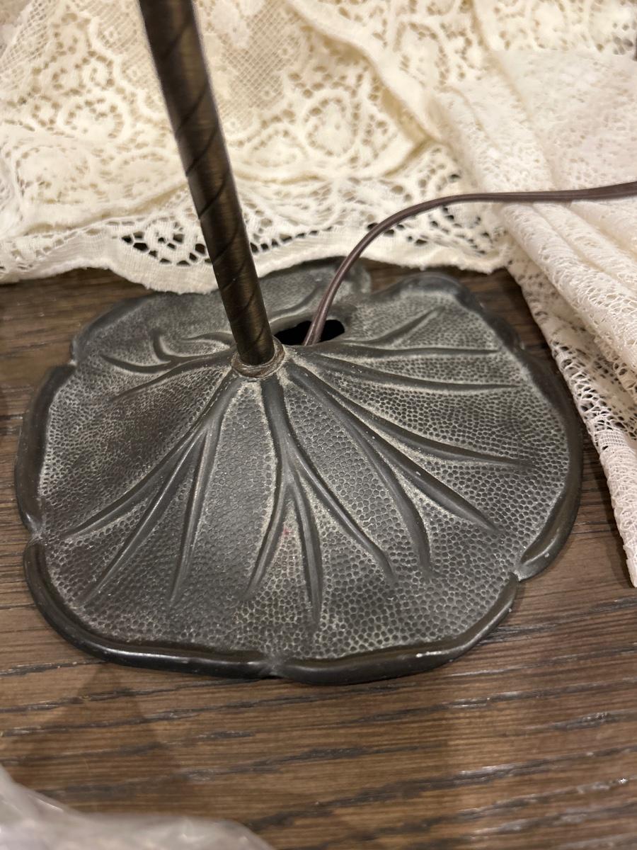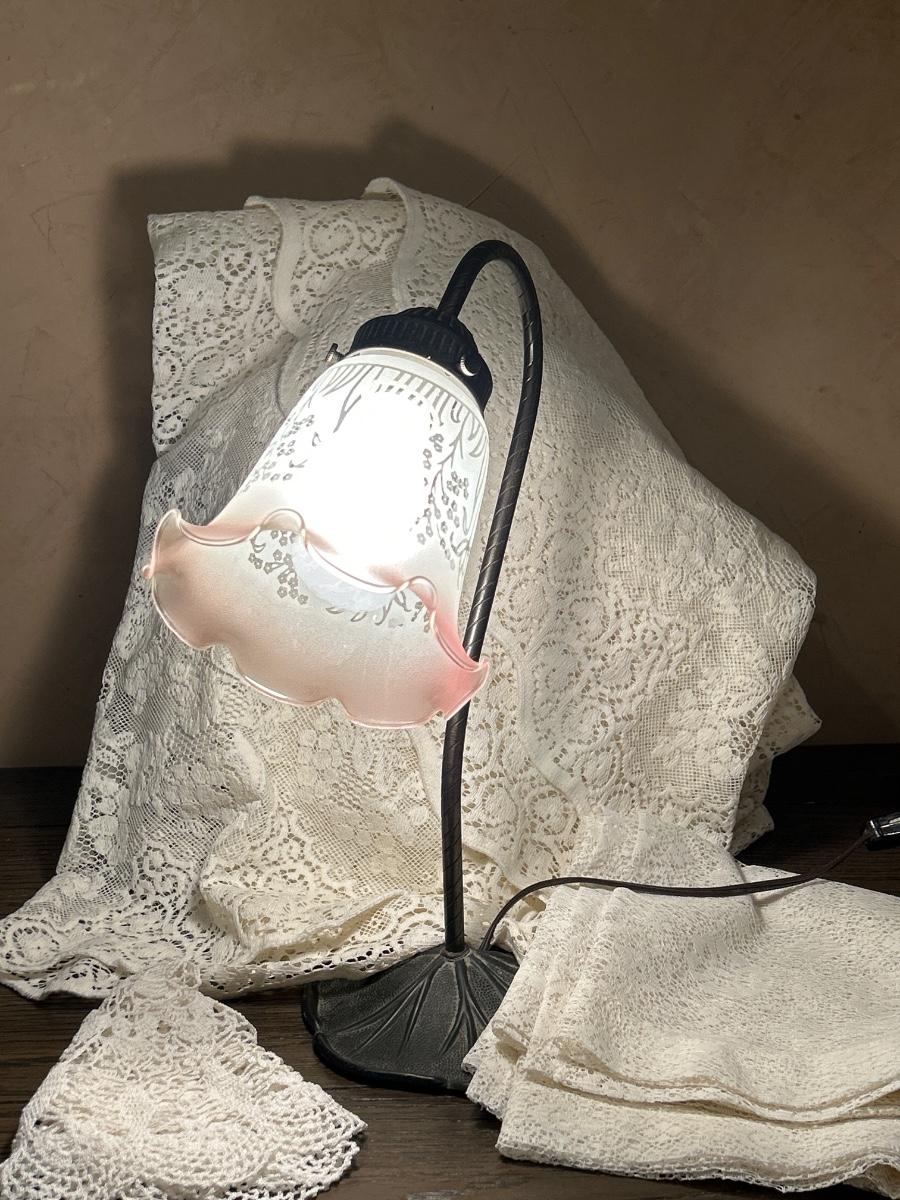 Vintage lily pad base goose neck pink frosted glass shade, possibly from the 30’s. Large table cloth is for a round, 1 runner I believe & larger doily.