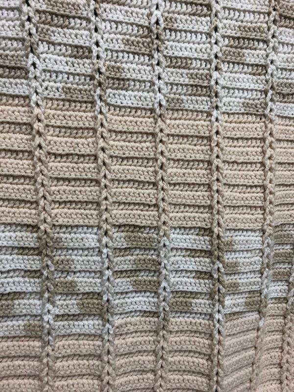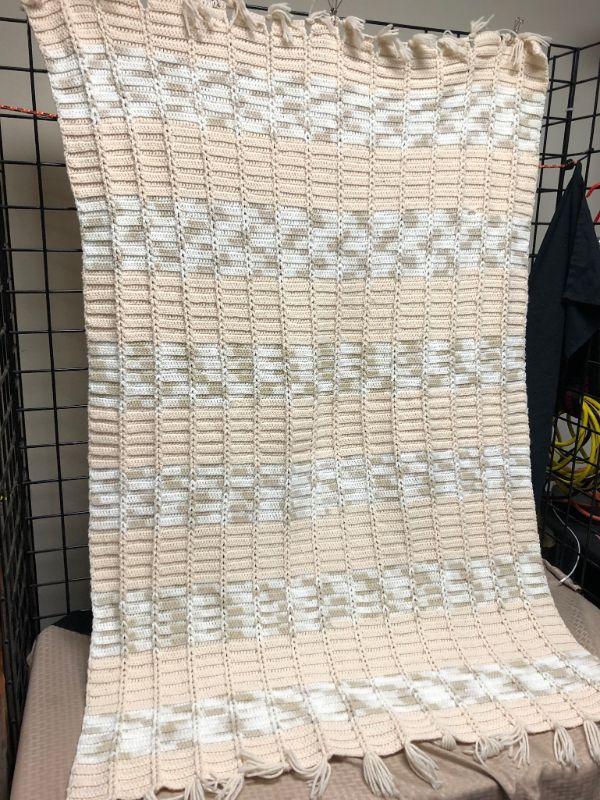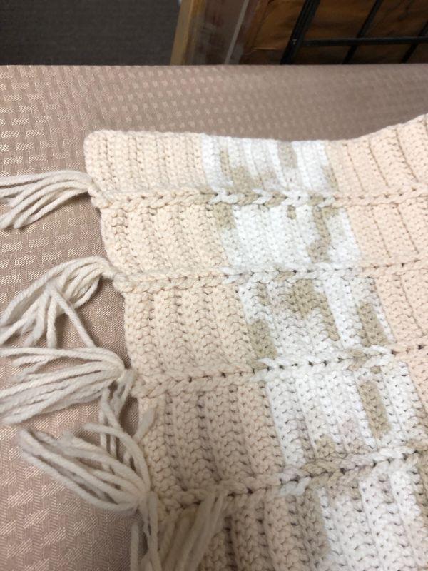 Striped crochet throw blanket. Fringed edges. Good Condition, No holes.