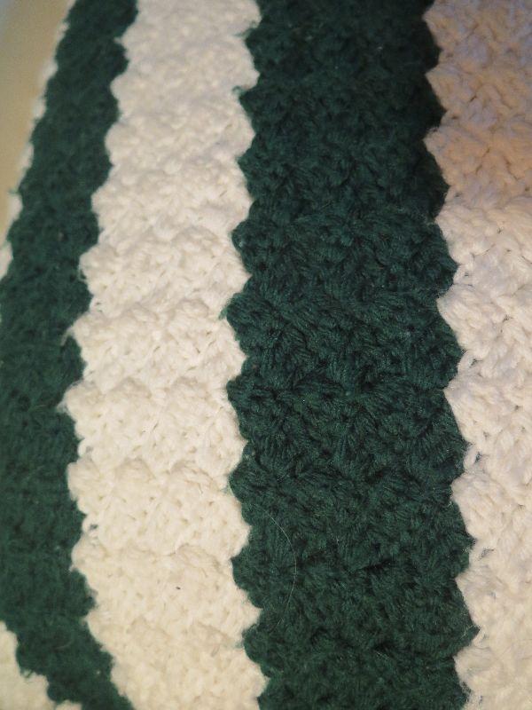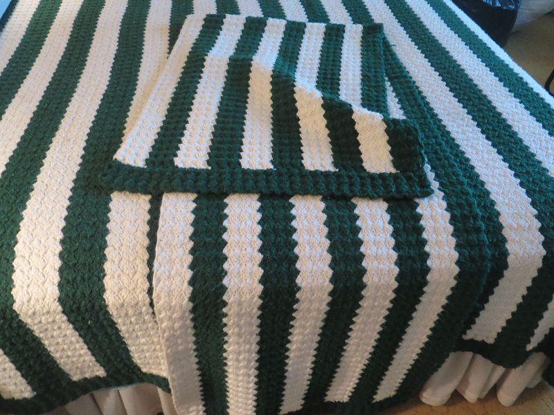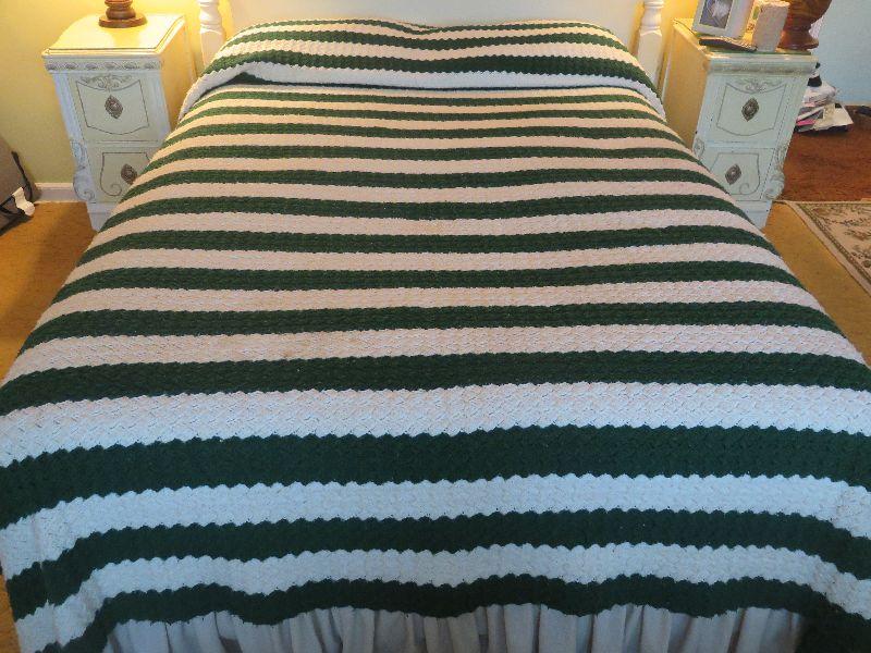 Hand-crafted blanket is dark green and white stripes, and fits this full sized bed, but I believe would also fit a Queen. A separate piece covers the pillows. Likely made 40-50 years ago. Please review all photos and read Terms and Conditions before placing a bid. Pick up is Wednesday, November 20 from 4-7pm and Saturday, November 23 from 9am-2pm in Mantua, New Jersey. All sales are final. All sales are as is, where is. Please bring all boxes, tools, and muscle needed to remove your items. Any photo props are not included. All measurements are approximate. Items come from dog-friendly home.