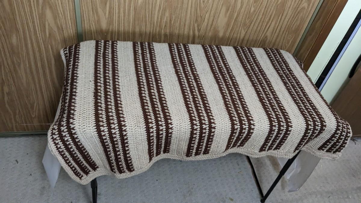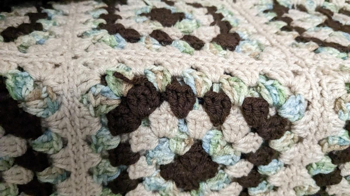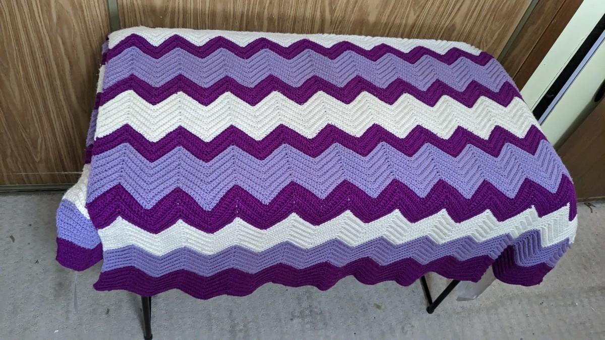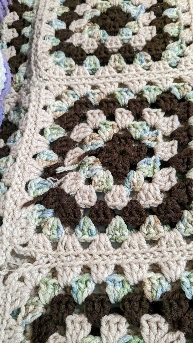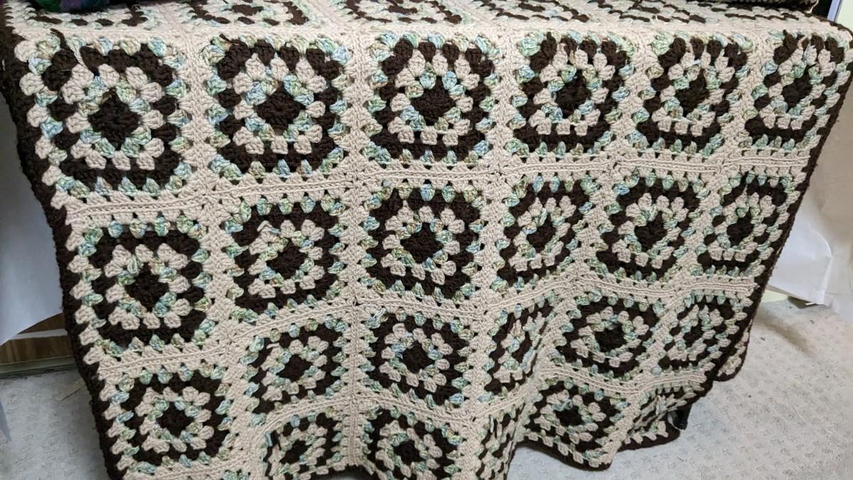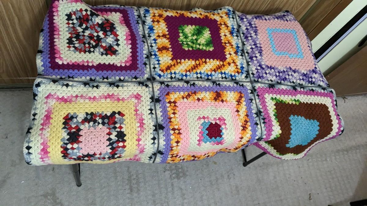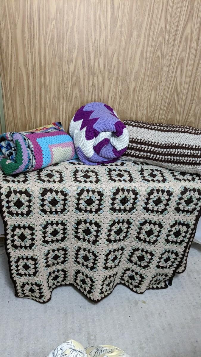 4ea, varied sizes from full to lap throw. That rainbow oversized granny square is a real find. No stains noted, please see photos for throw with frays. bdrm2