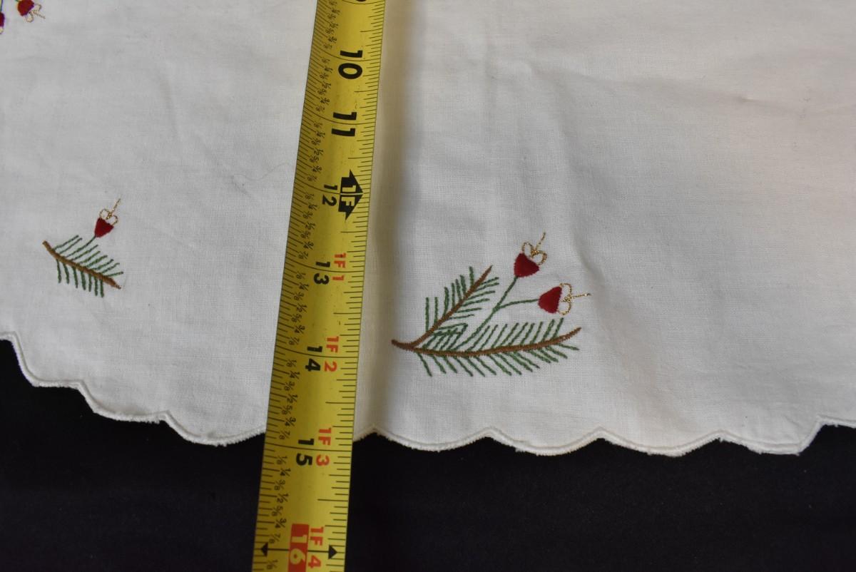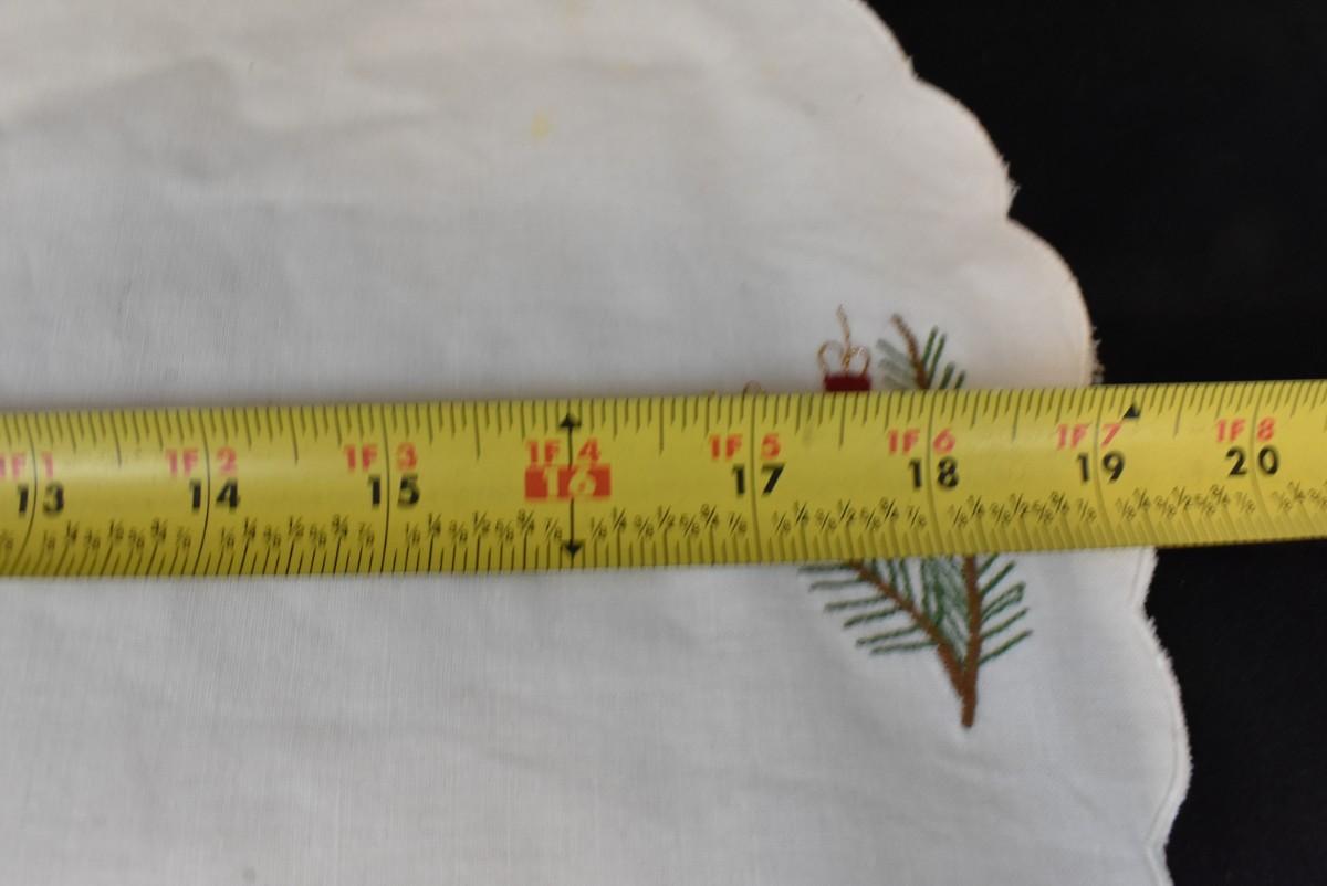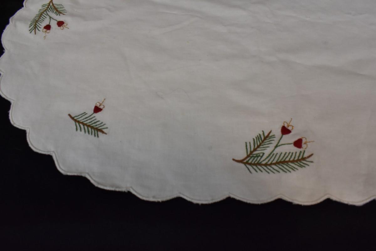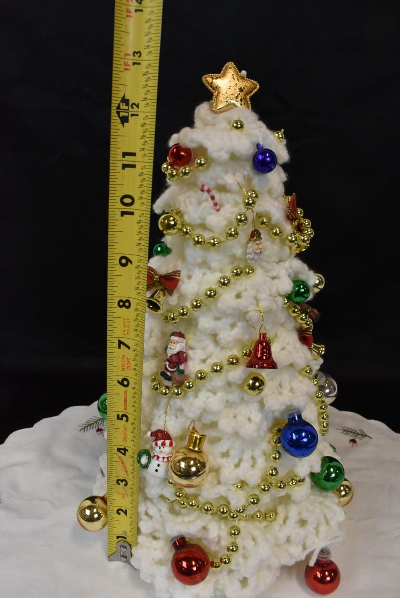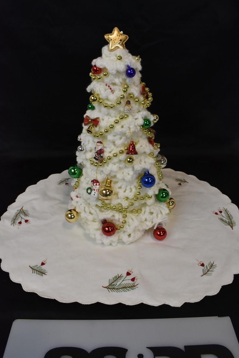 Crocheted Christmas Tree, White with Ornaments & Embroidered mat - Vintage