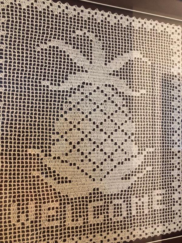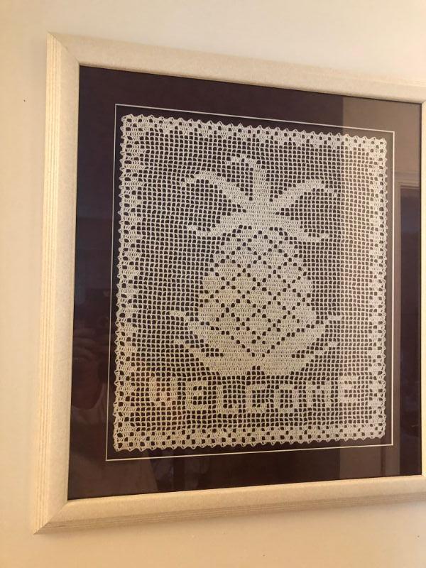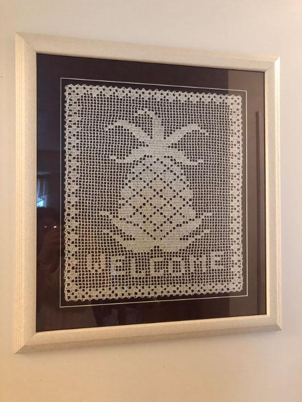 Crocheted Pineapple Doily Matted and Framed. Frame is 23" square. **Please read Terms and Conditions before placing a bid. Pick up is Thursday, August 15, 2019 from 4pm to 7pm or Sunday, August 18 from 11am-2pm in Mullica Hill. All sales are final. All sales are as is, where is. Please review all photos. Any props included in photos are not included in listing. All measurements are approximate.