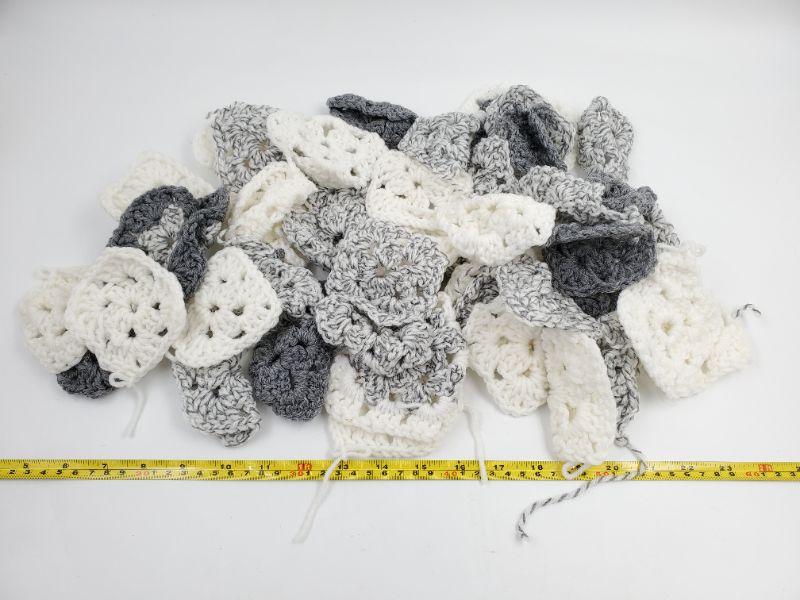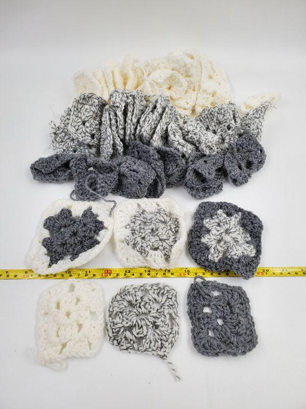 Crocheted squares, grays and white...