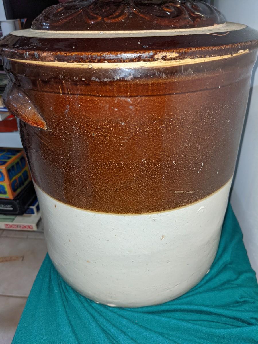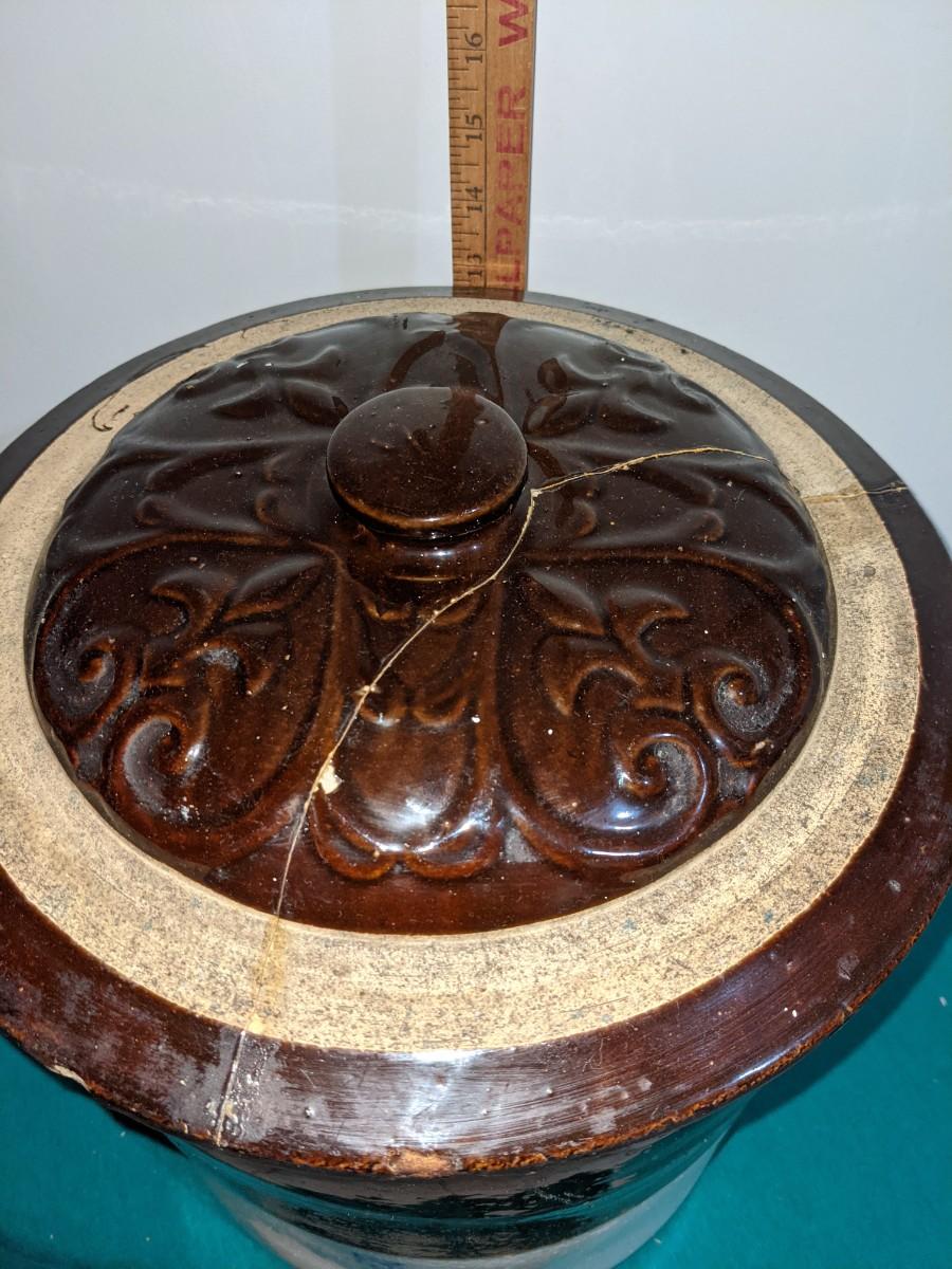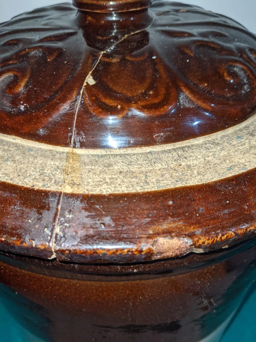 No cracks in the crock. The lid has been glued and repaired, as pictured.