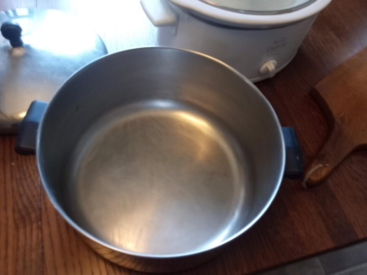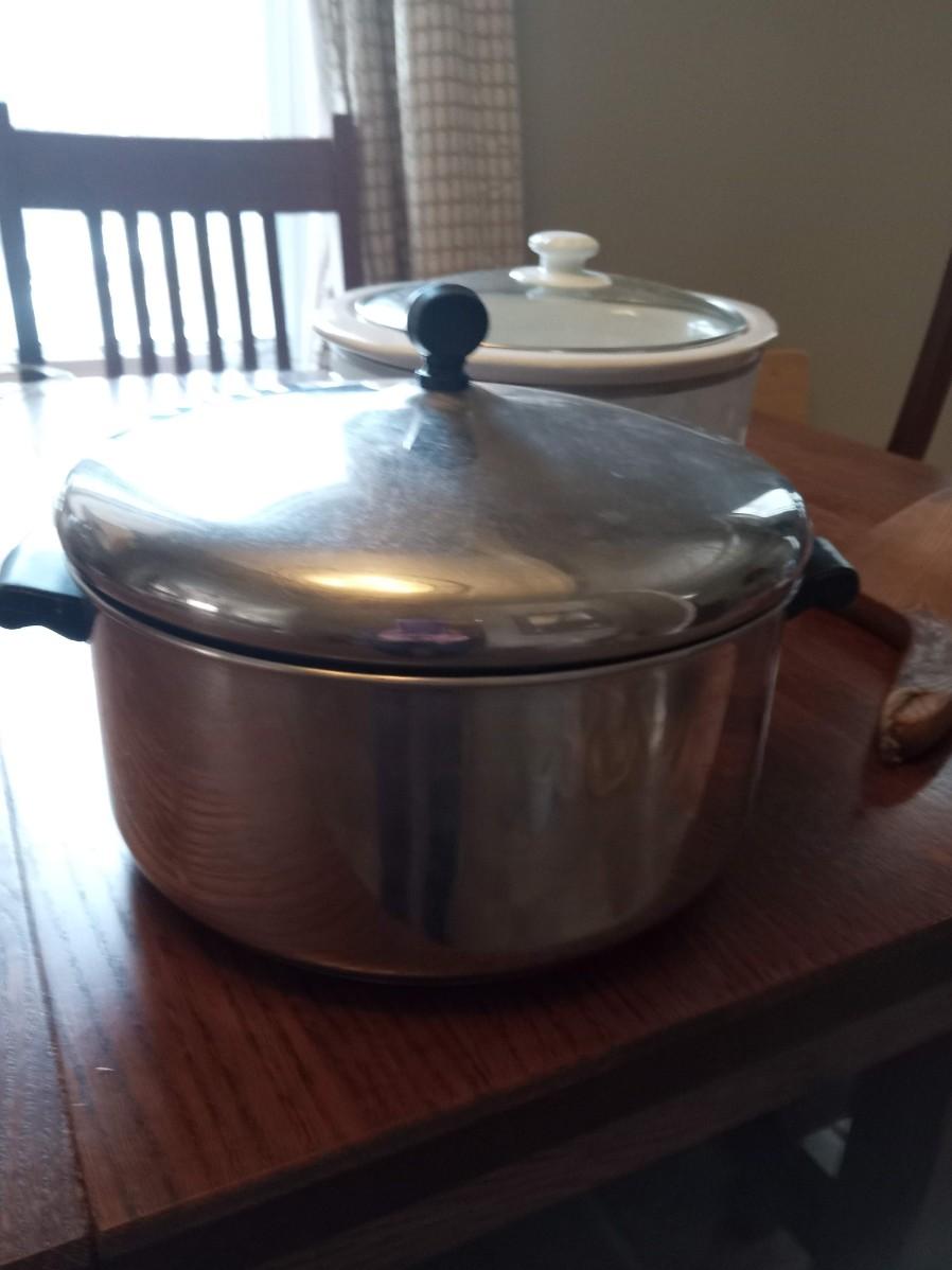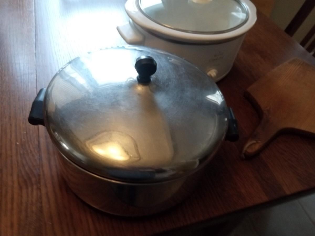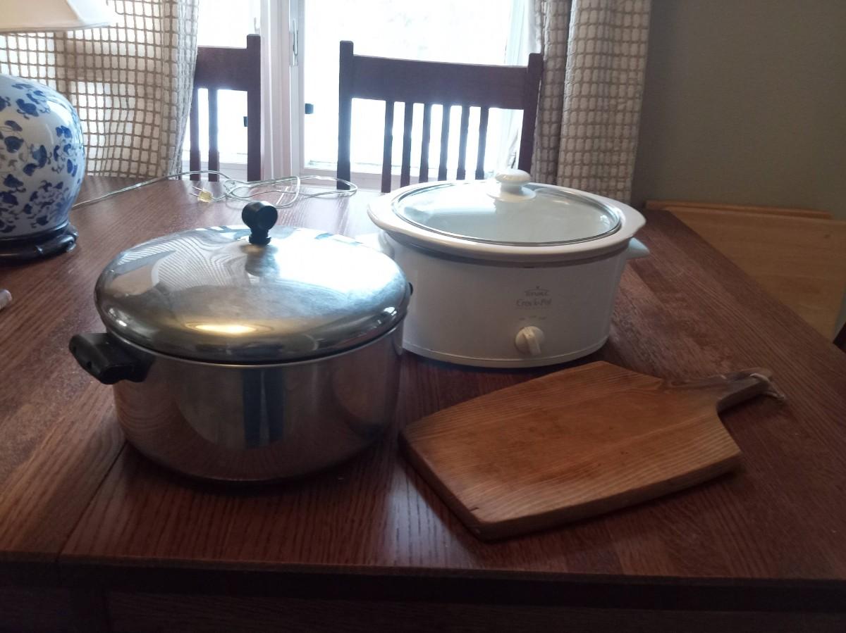 CROCK POT, LARGE POT AND WOODEN CUTTING BOARD