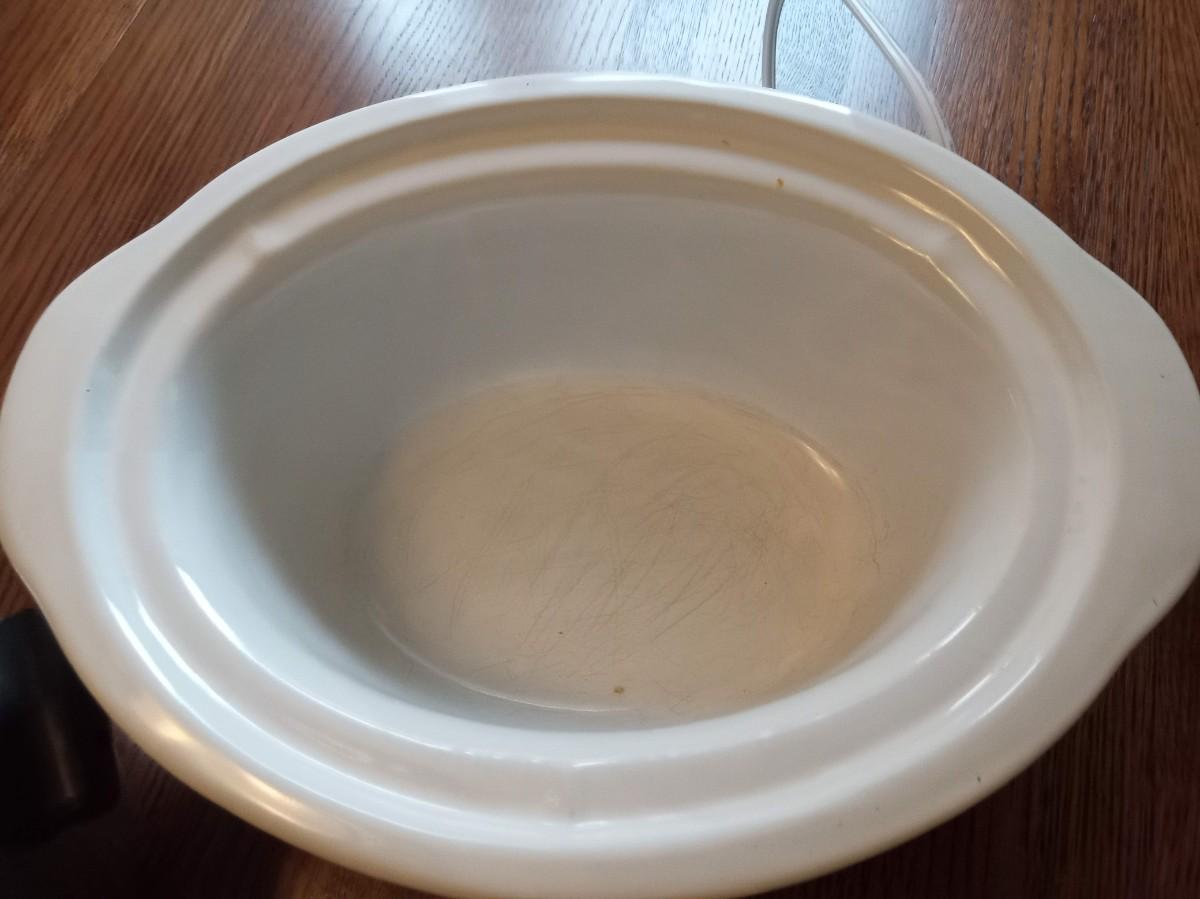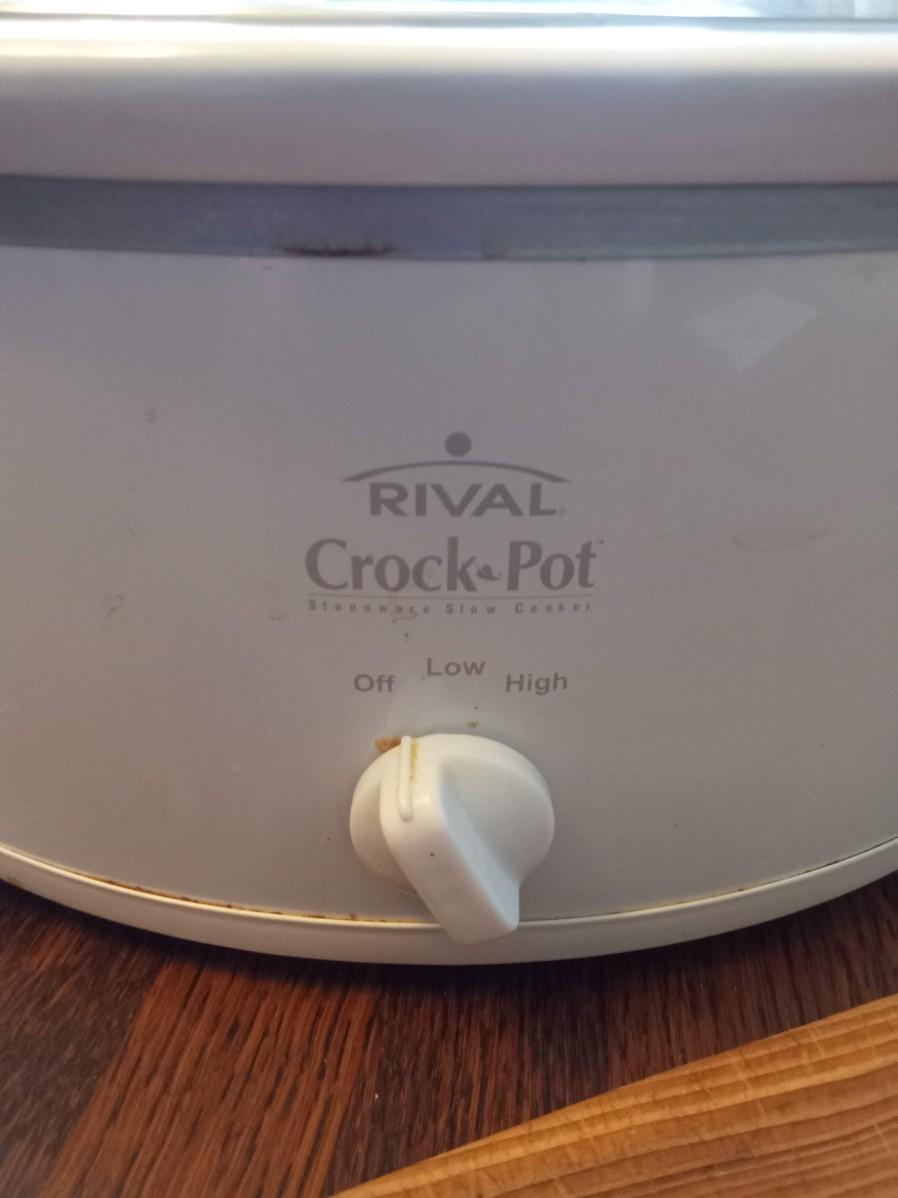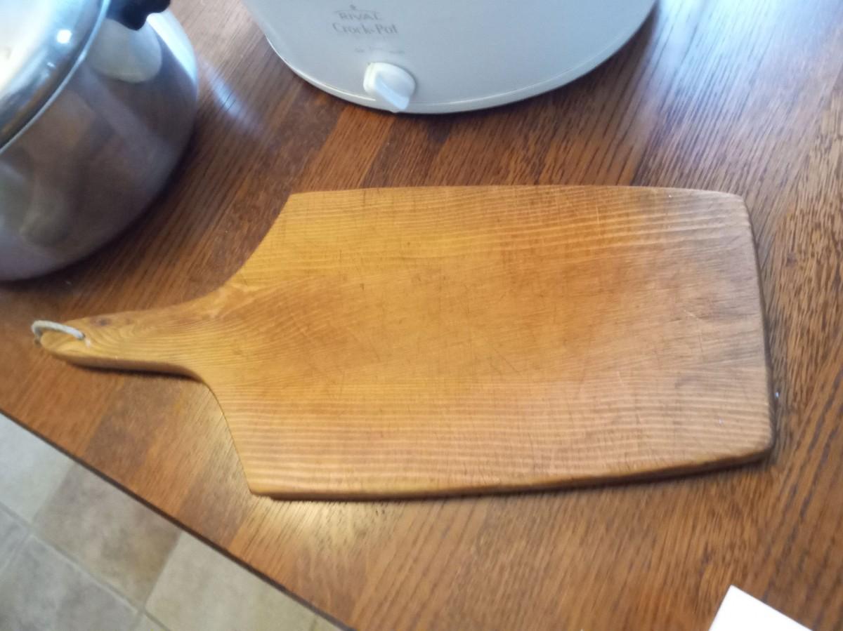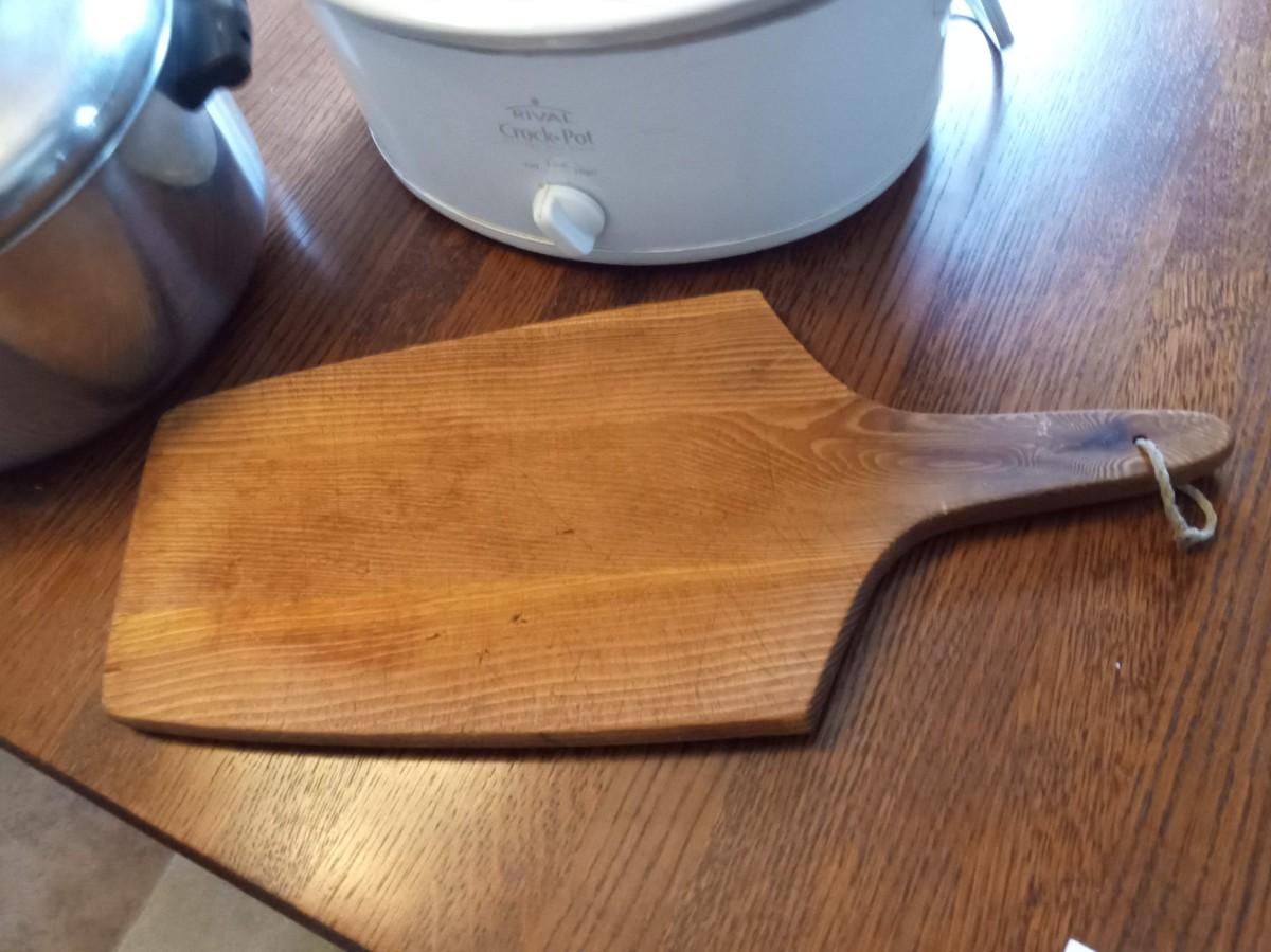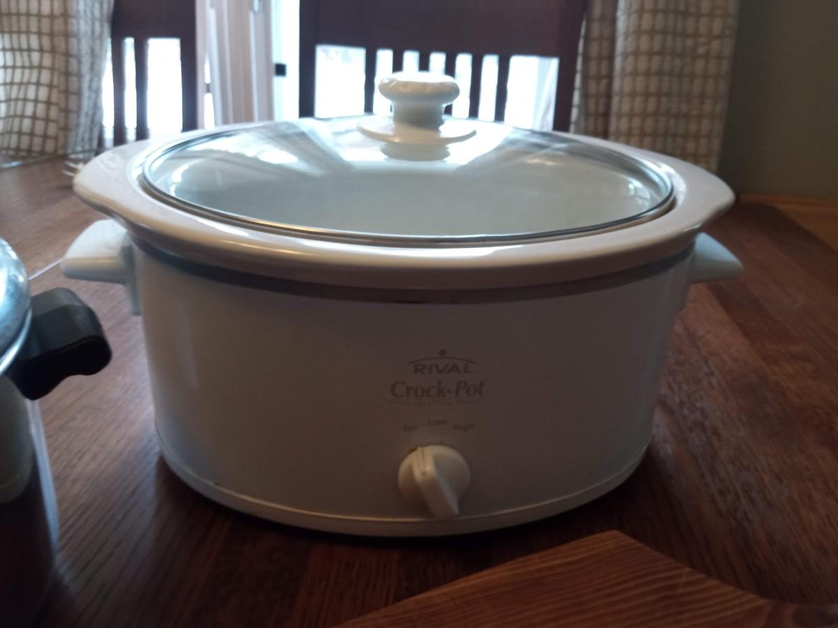 CROCK POT, LARGE POT AND WOODEN CUTTING BOARD