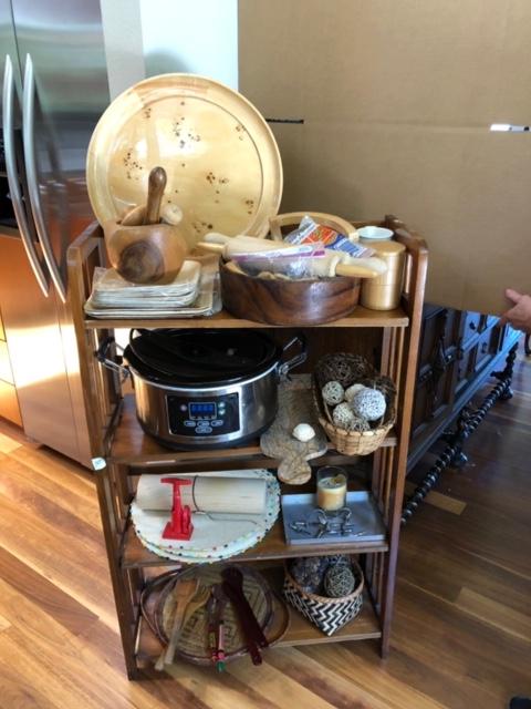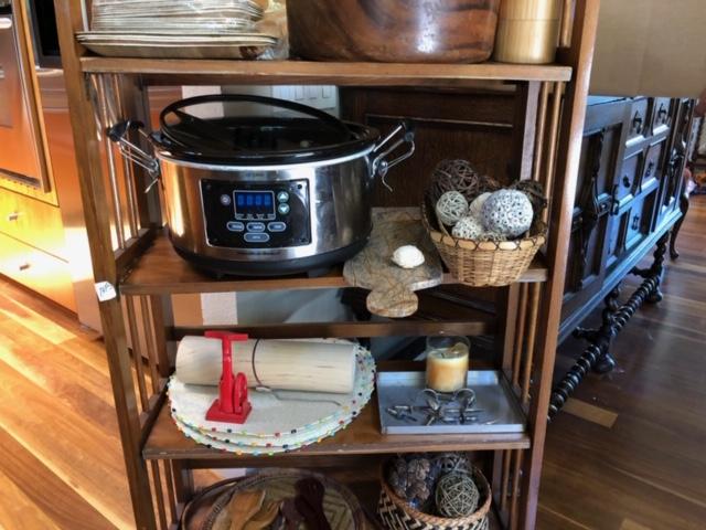82. Crock Pot, Stone Cutting Board, Wooden Utensils, Wooden Morten, Plates