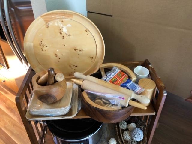 Crock Pot, Stone Cutting Board, Wooden Utensils, Wooden Morten, Plates