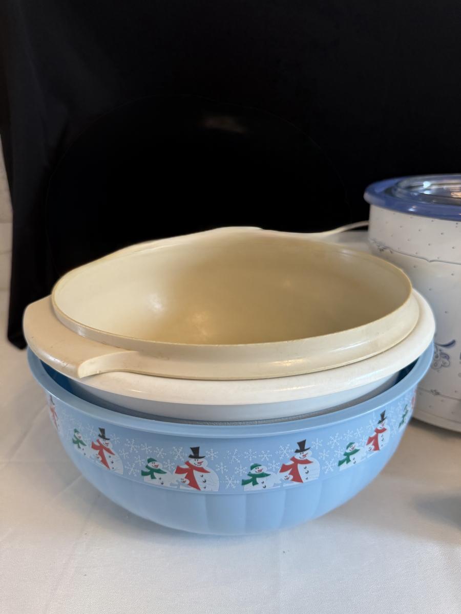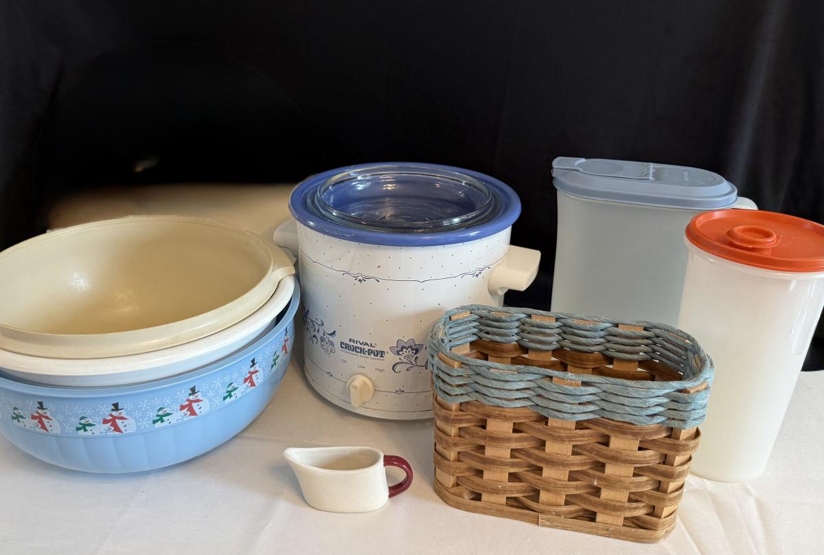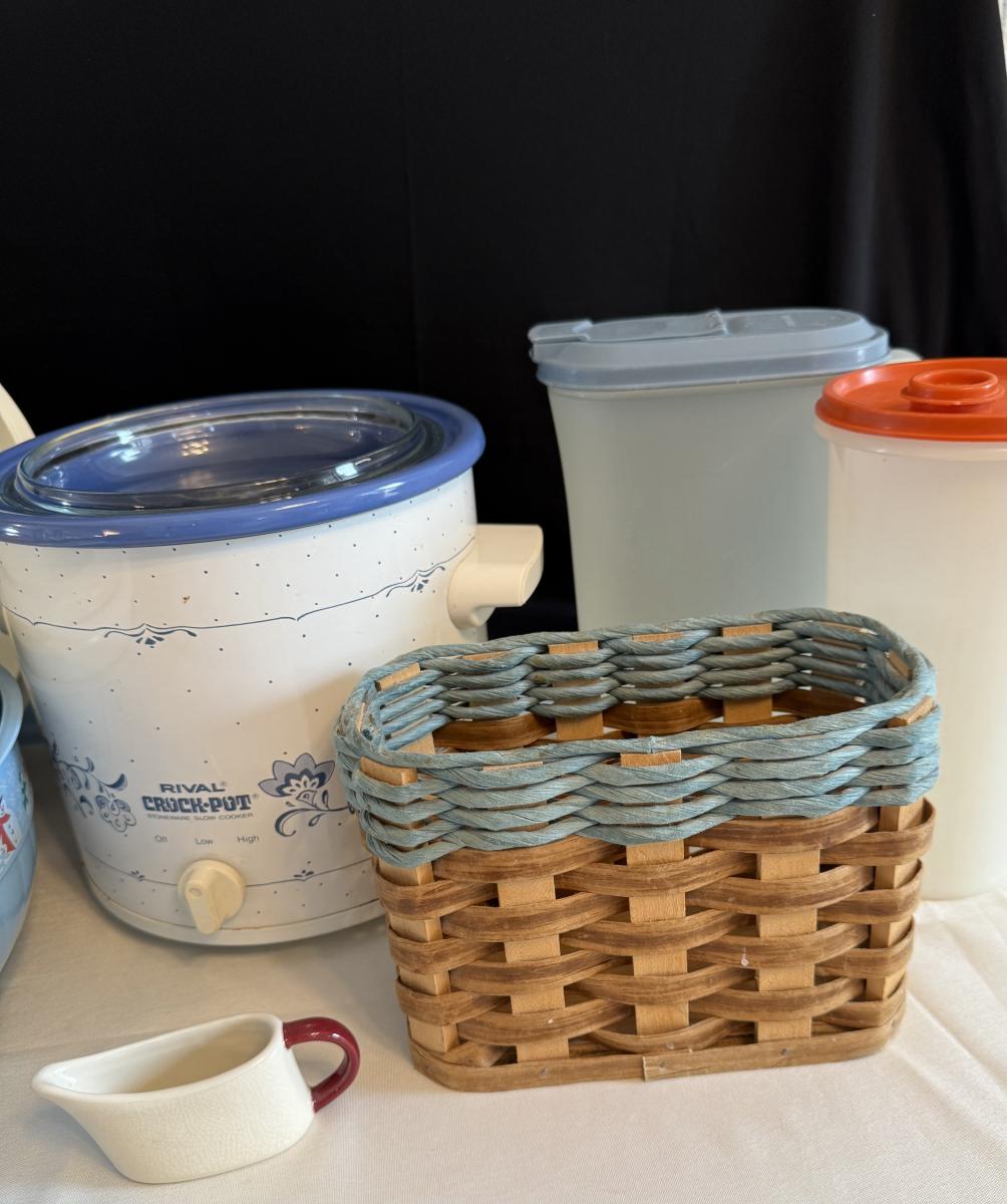 Crockpot, Tupperware, bowls, wicker basket