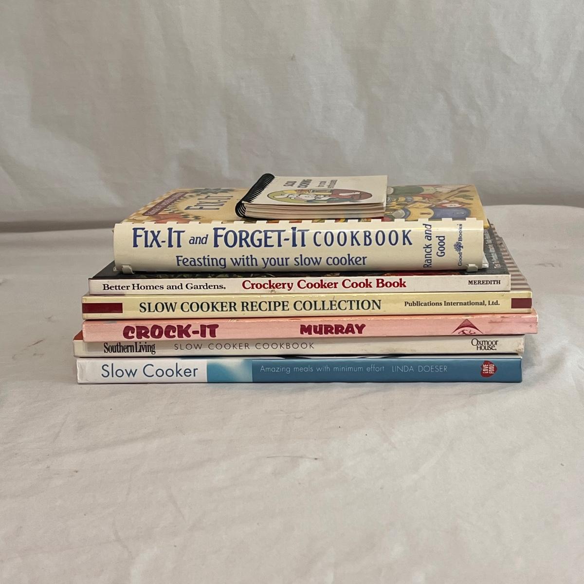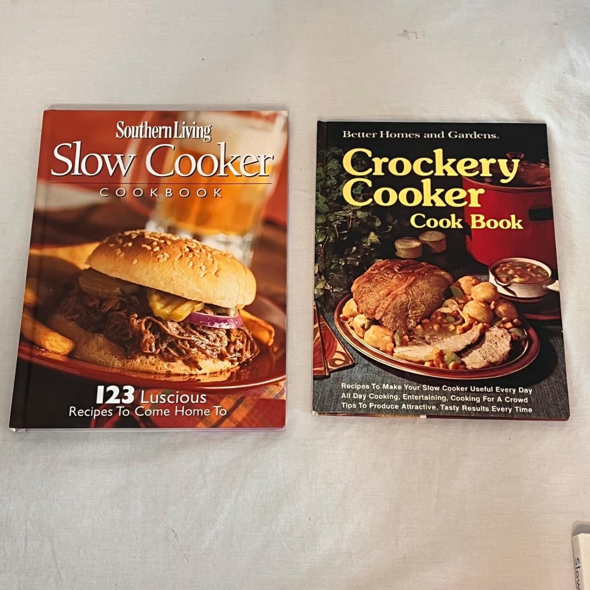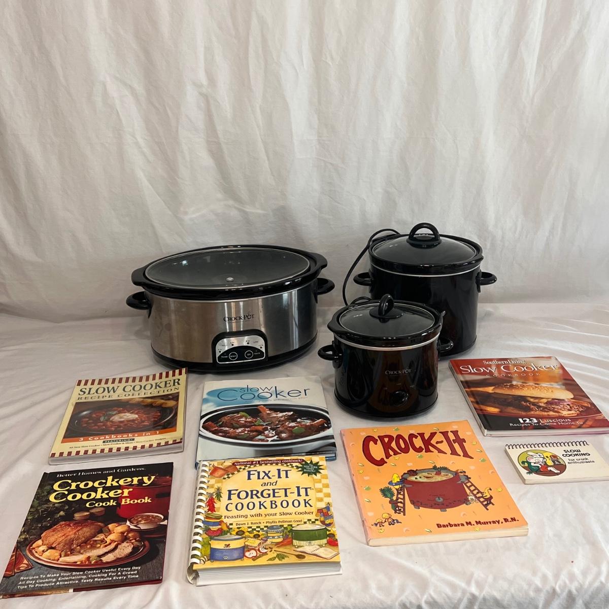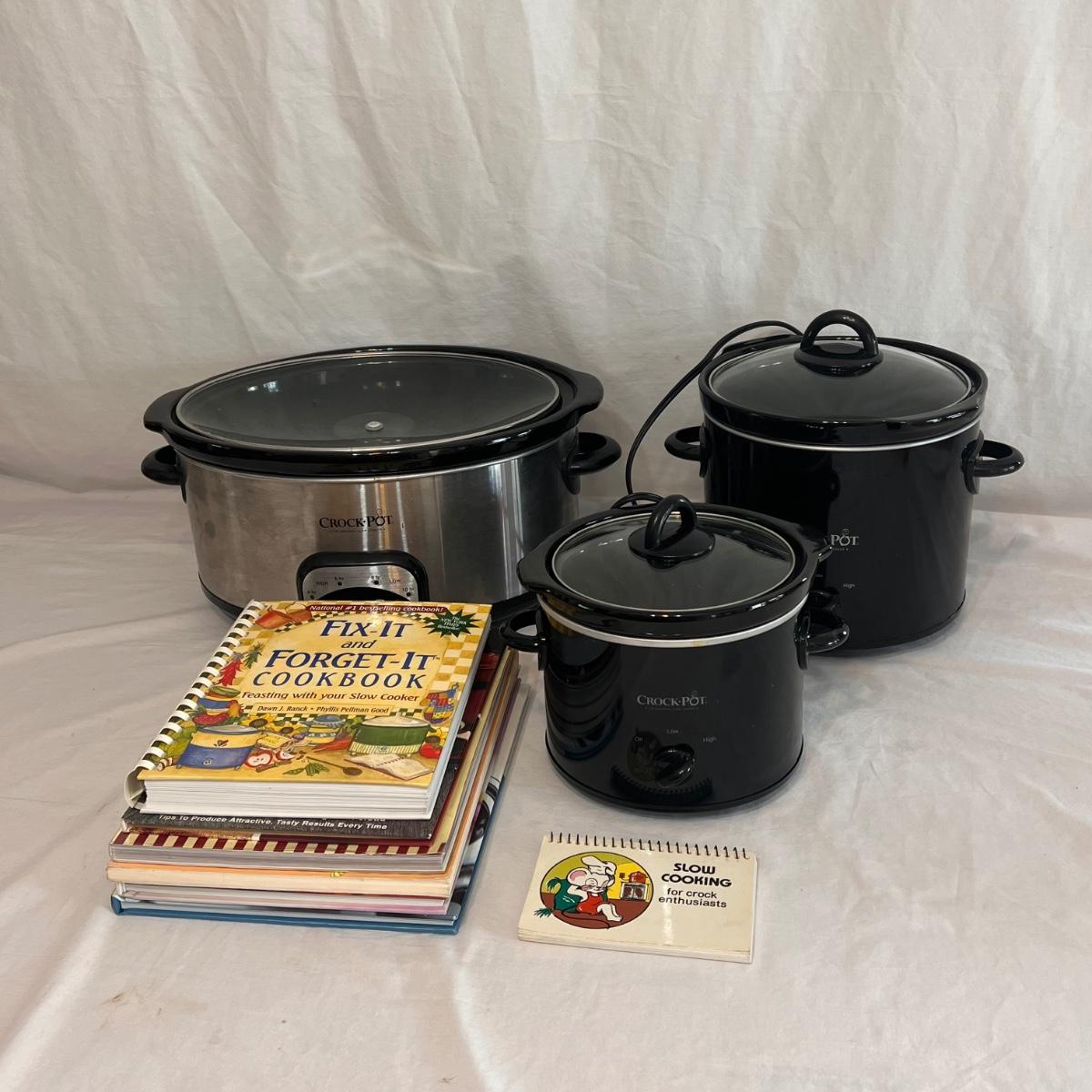 This lot includes three Crockpots of various sizes and a handful of cookbooks with recipes for slow cookers. The largest Crockpot measures 16” x 12”H. All three Crockpots powered on when plugged in. Shipping available. Local pickup only.