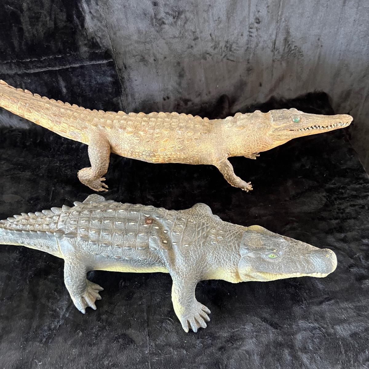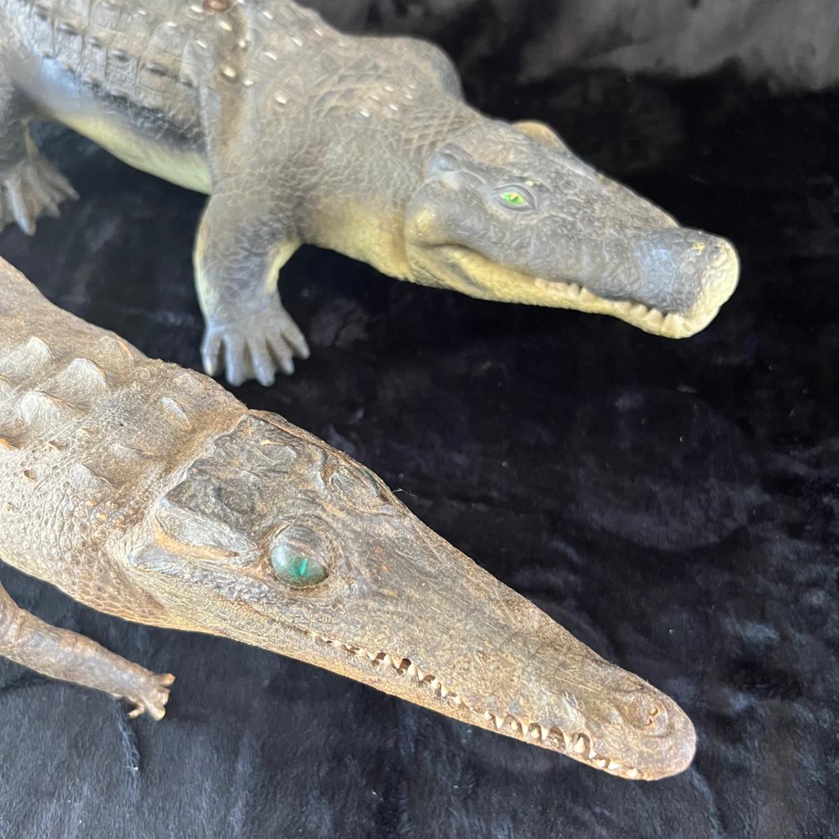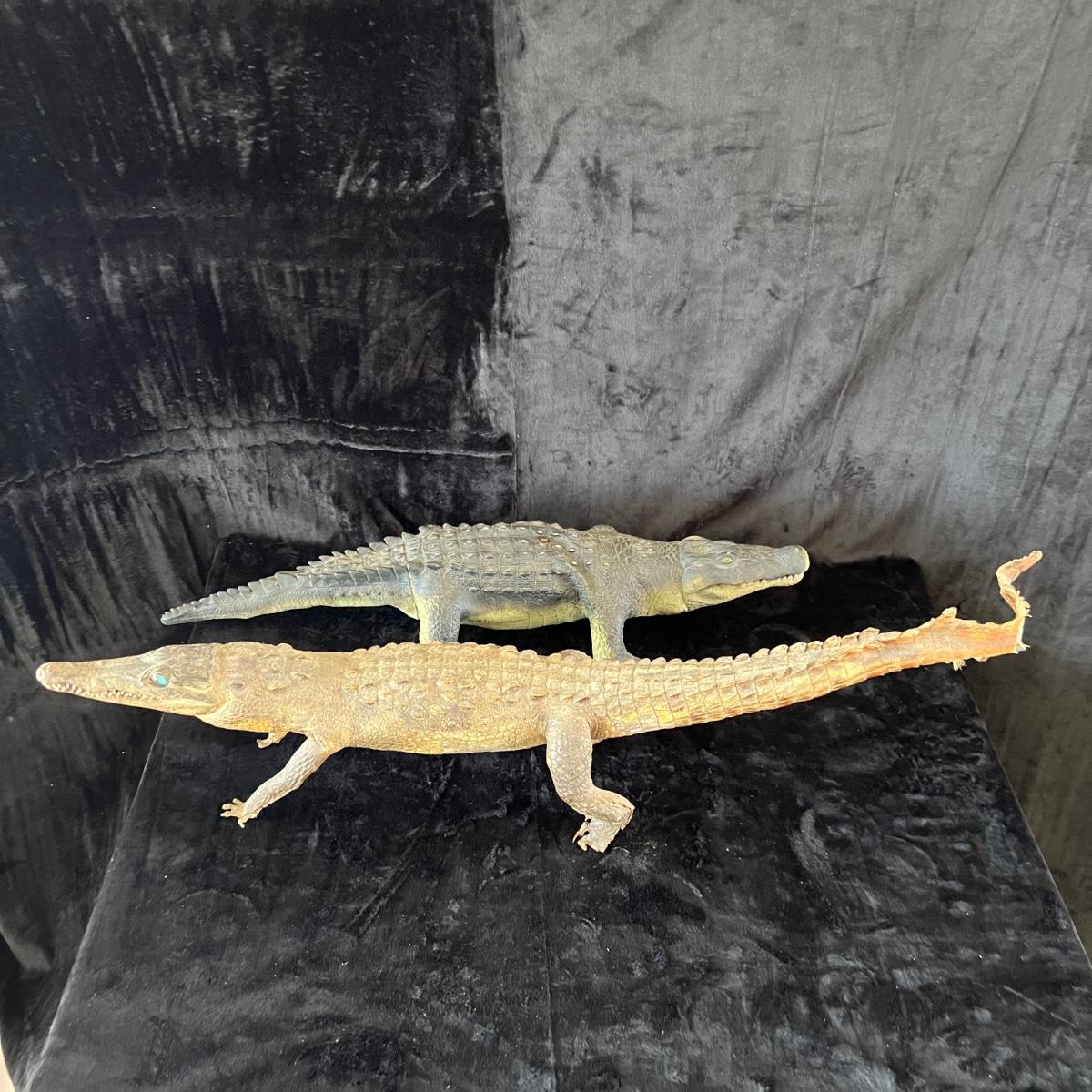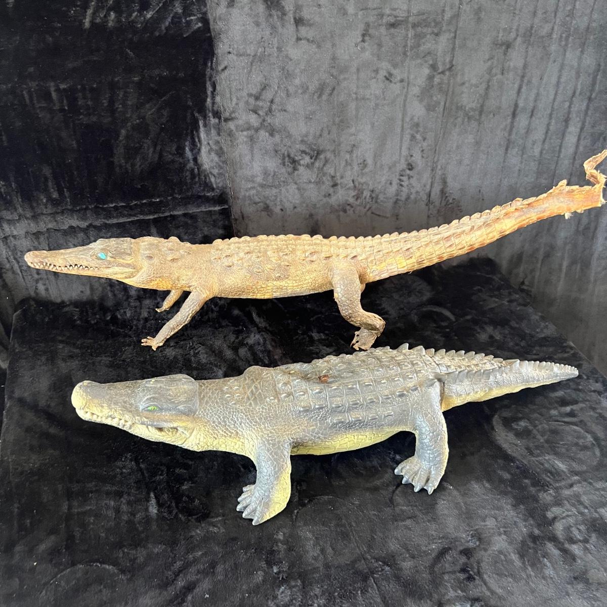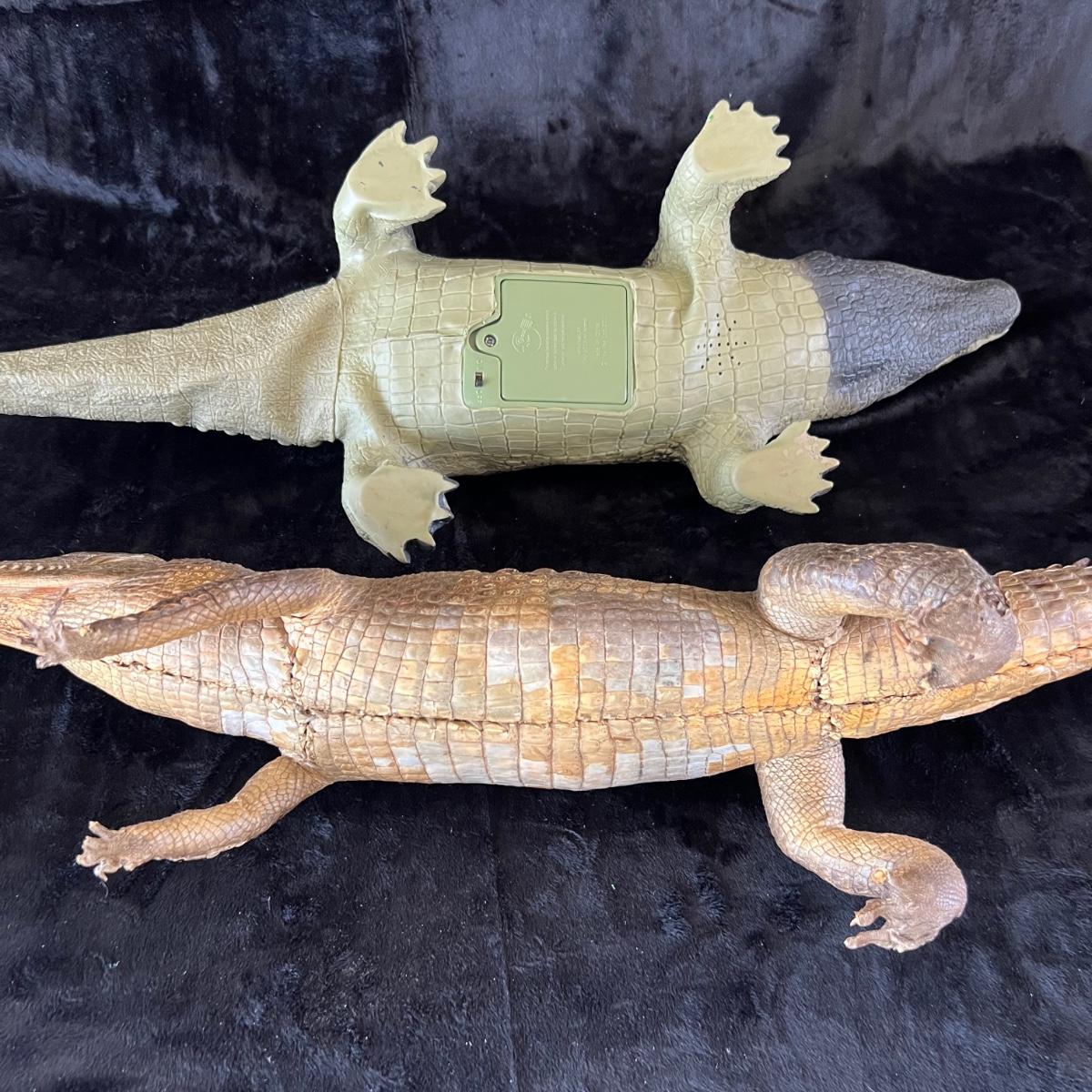 Two Crocodile Figures. Longer model appears to have authentic skin and meas. 32”L. Shorter Croc is made of rubber, animated, in working order and takes four AA batteries.