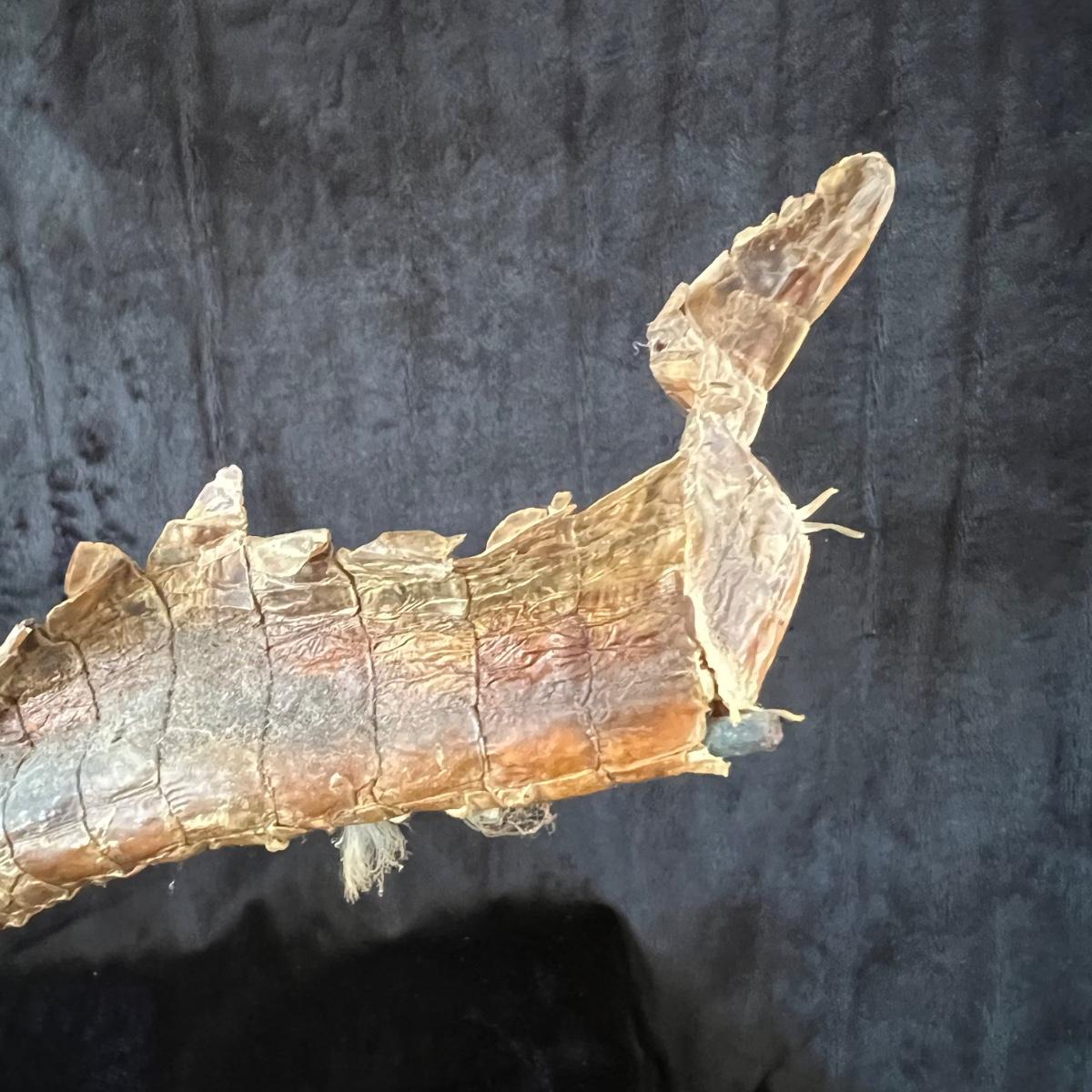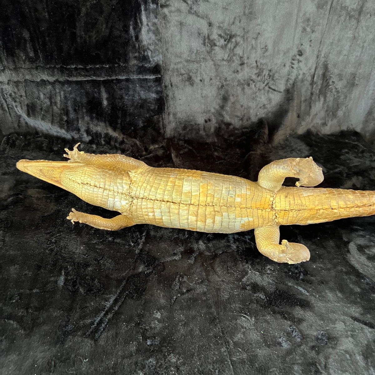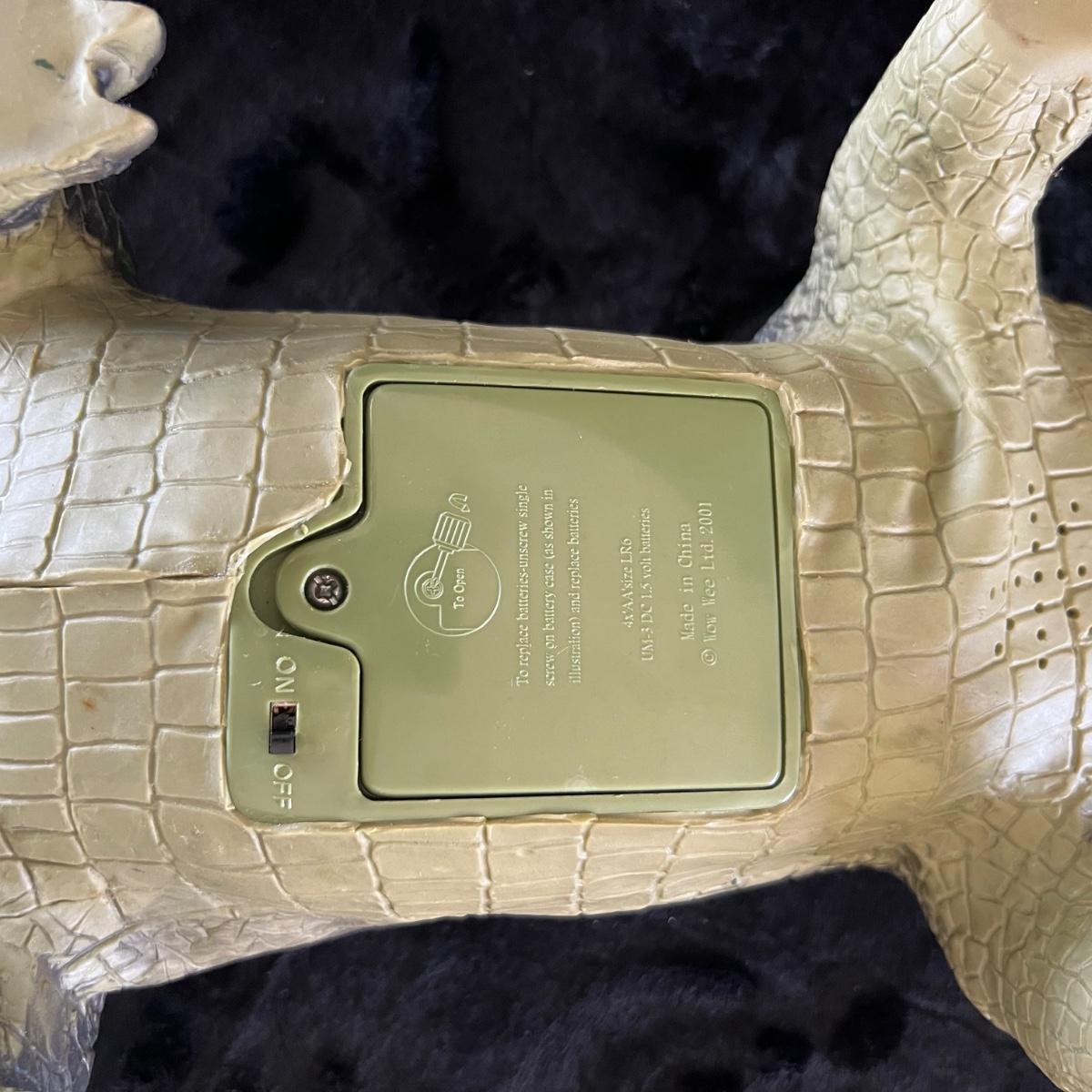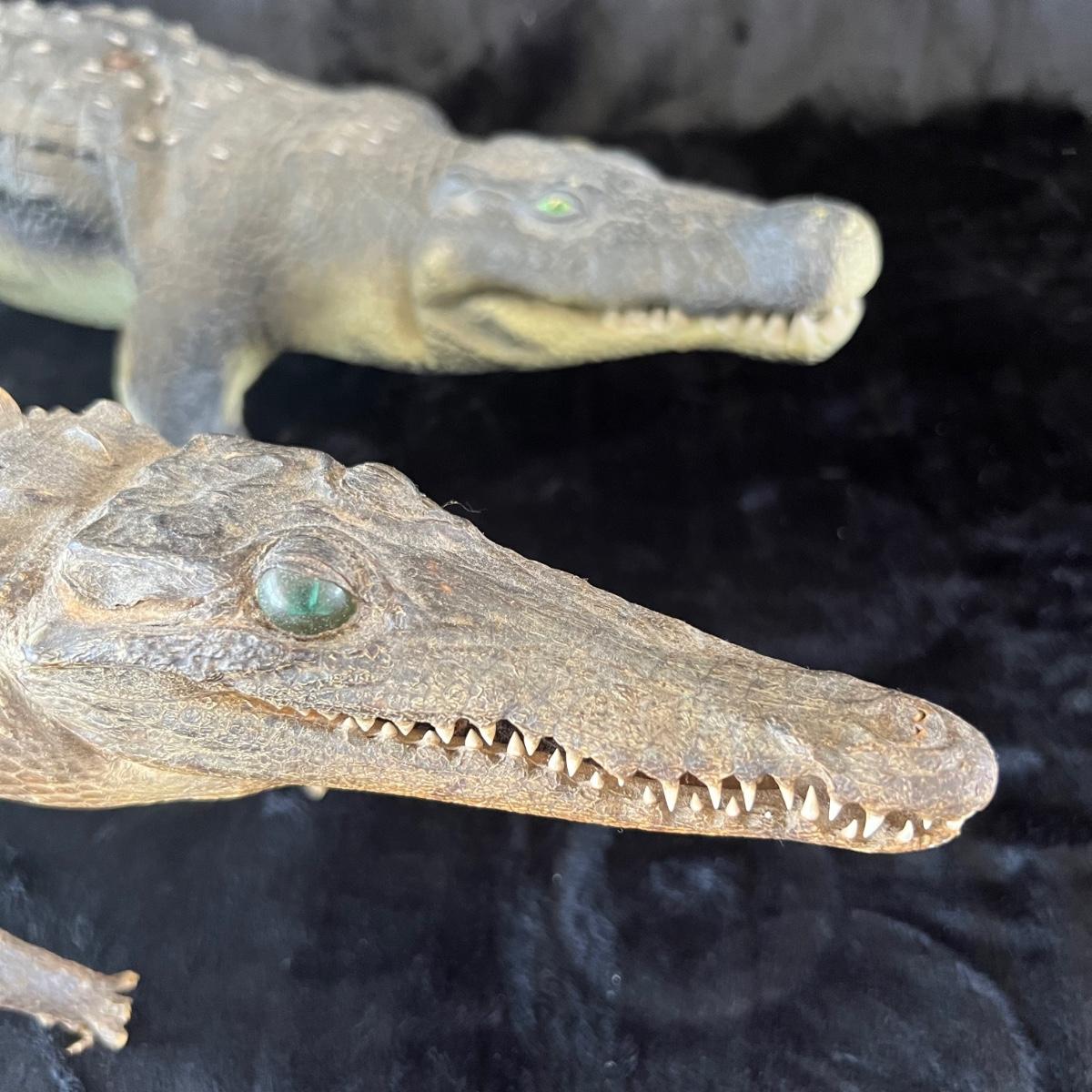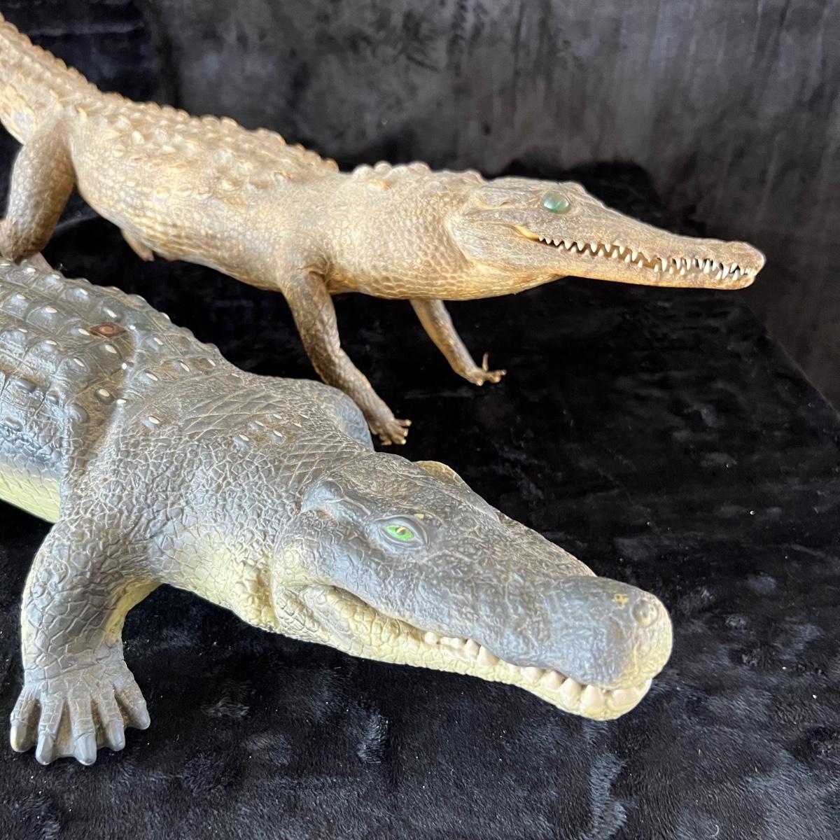 Two Crocodile Figures. Longer model appears to have authentic skin and meas. 32”L. Shorter Croc is made of rubber, animated, in working order and takes four AA batteries.