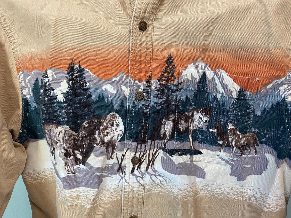 Croft & Barrow Long Sleeve Wolves in Forest Button Front Shirt Medium