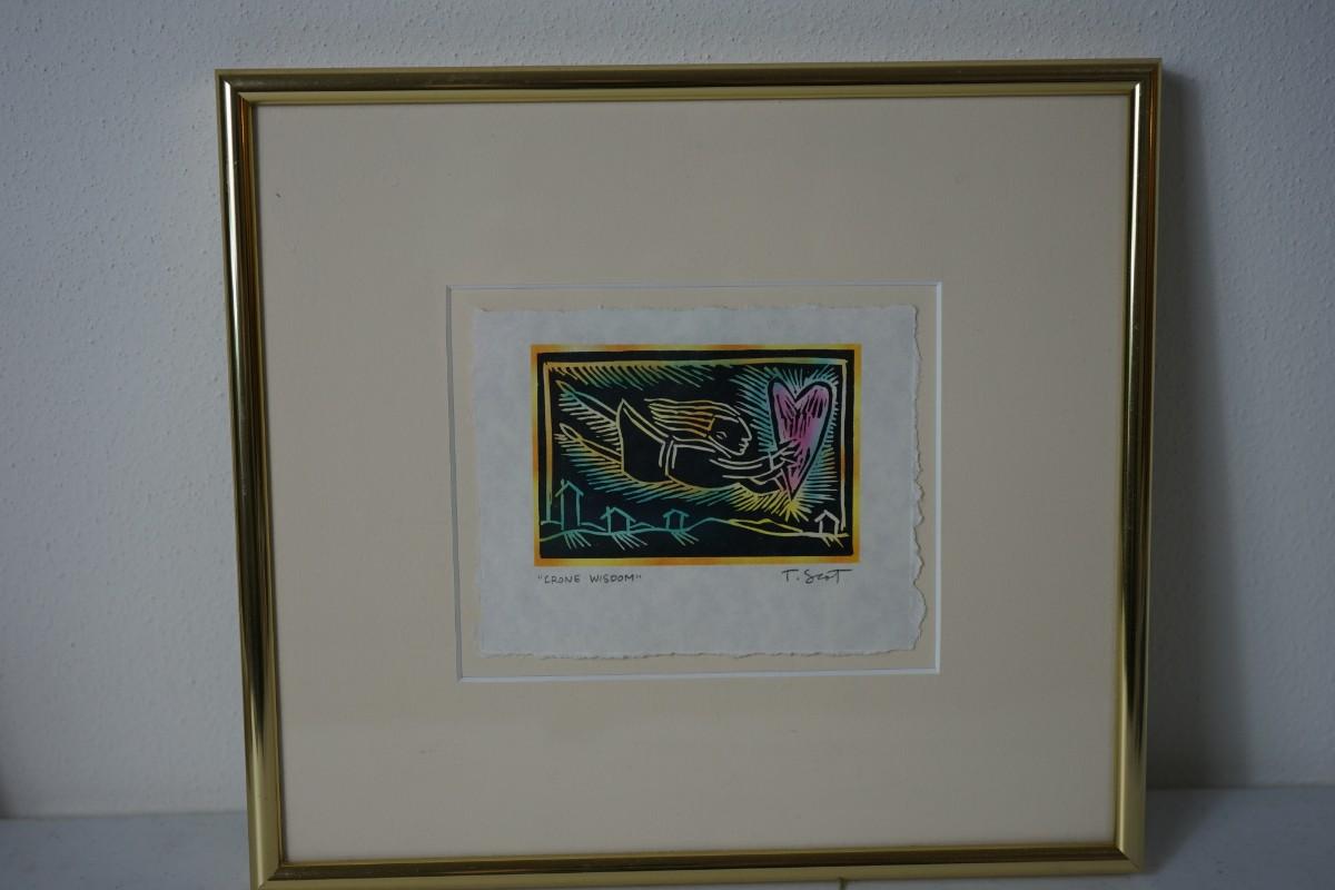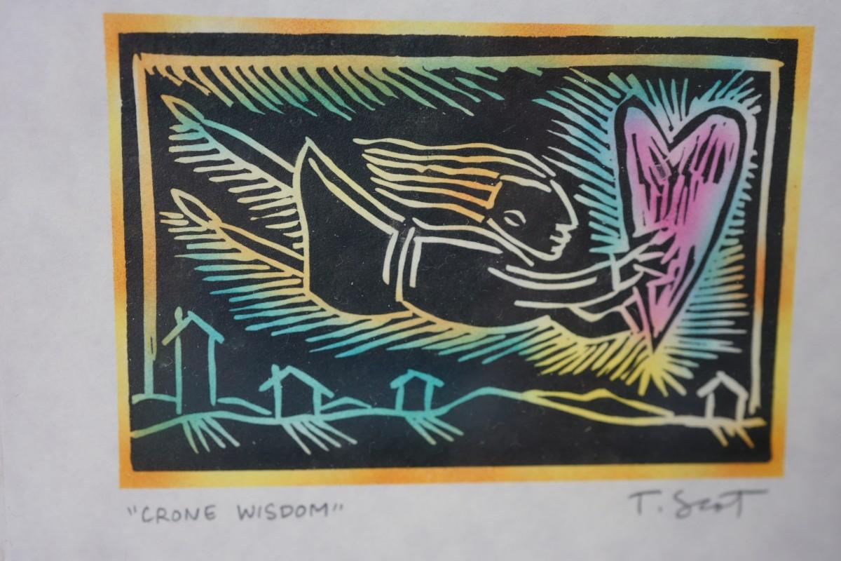 "CRONE WISDOM" SIGNED T SCOTT COLORED WOOD BLOCK ON HAND MADE PAPER