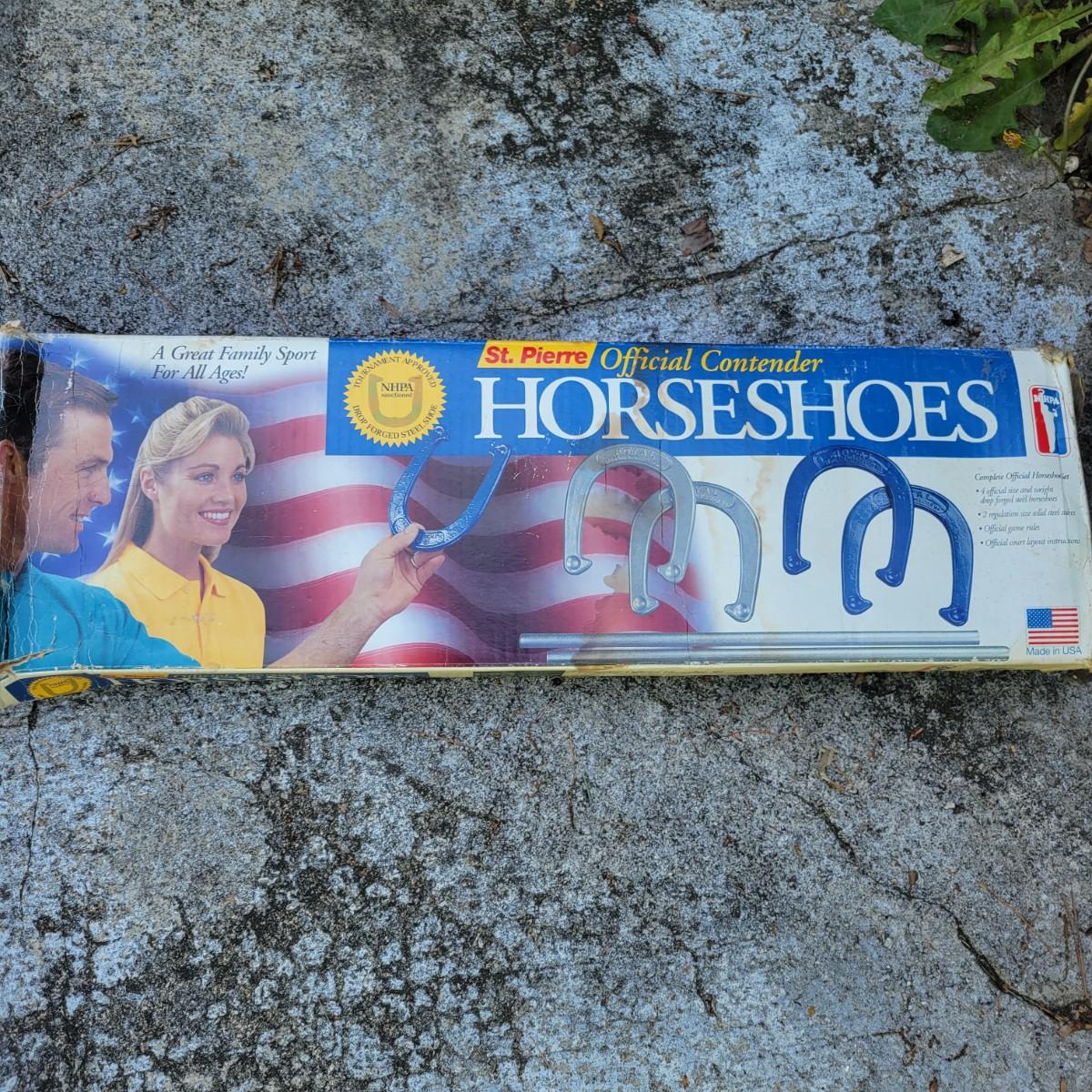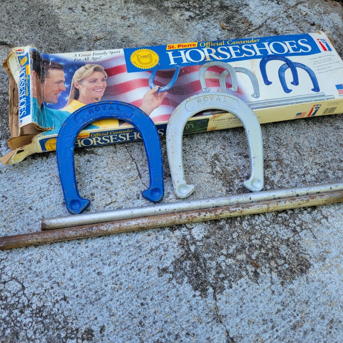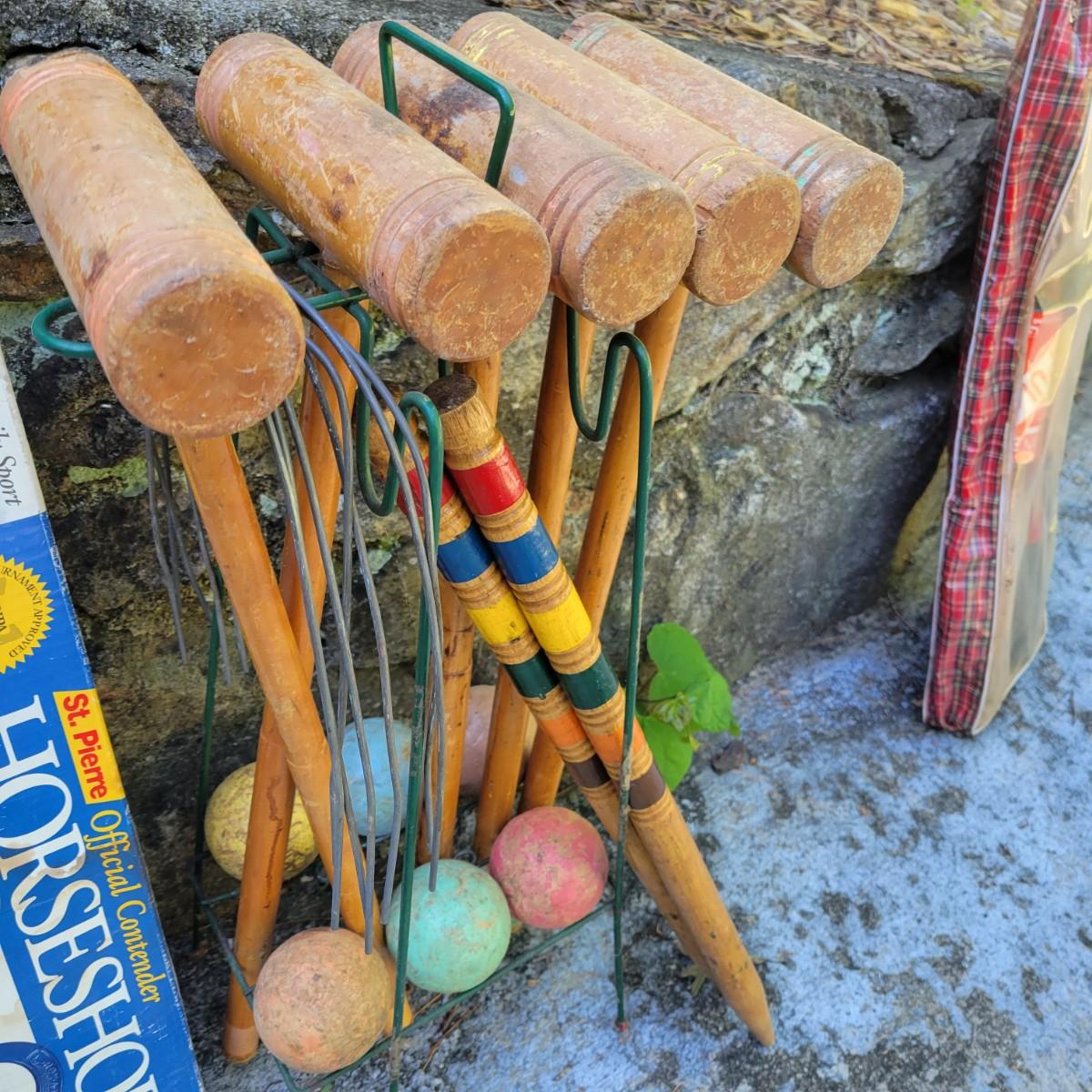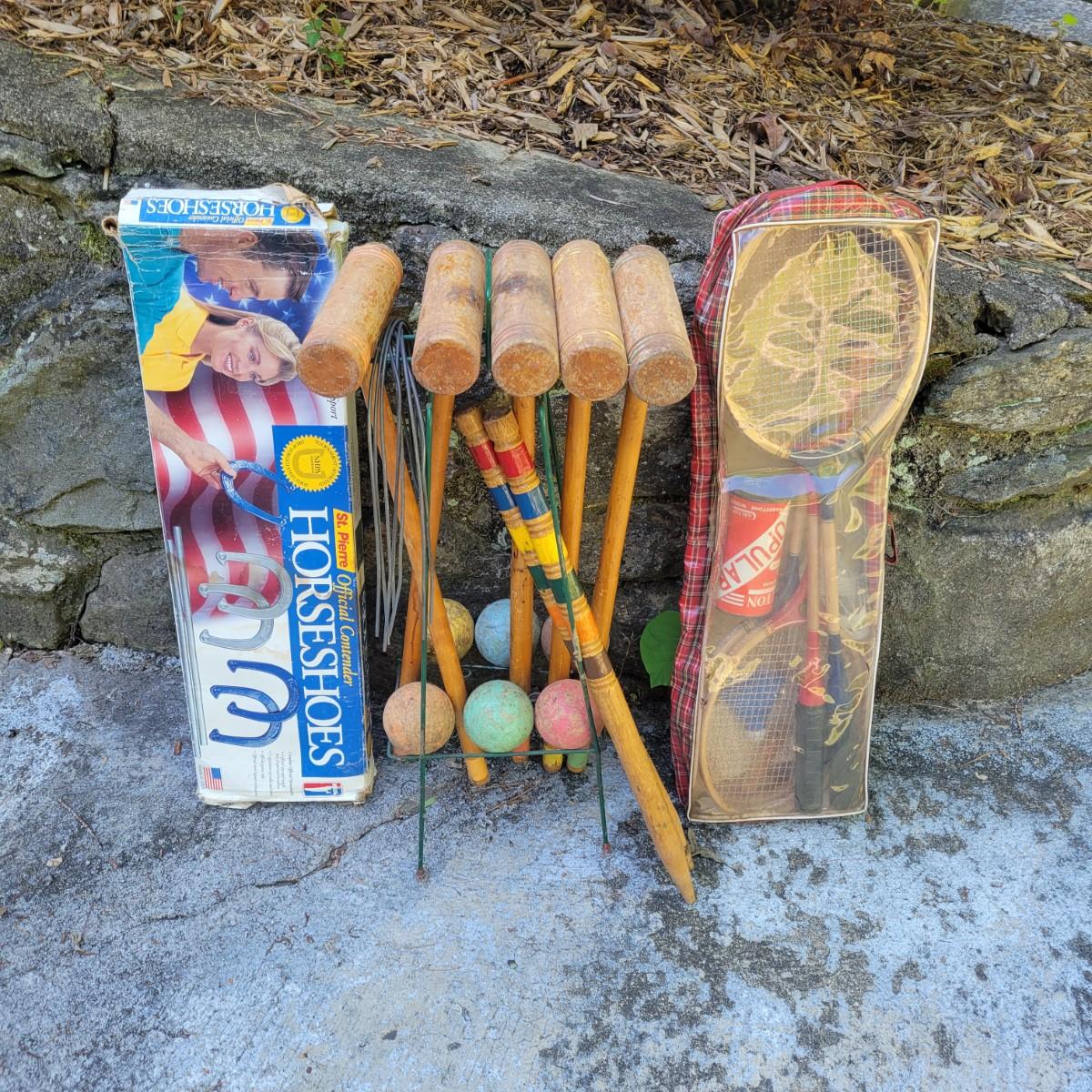 An assortment of vintage outdoor games that includes a set of horseshoes made of dropped forge steel that has four shoes and two posts. A croquet set with hoops and balls and a badminton set. Local pickup only