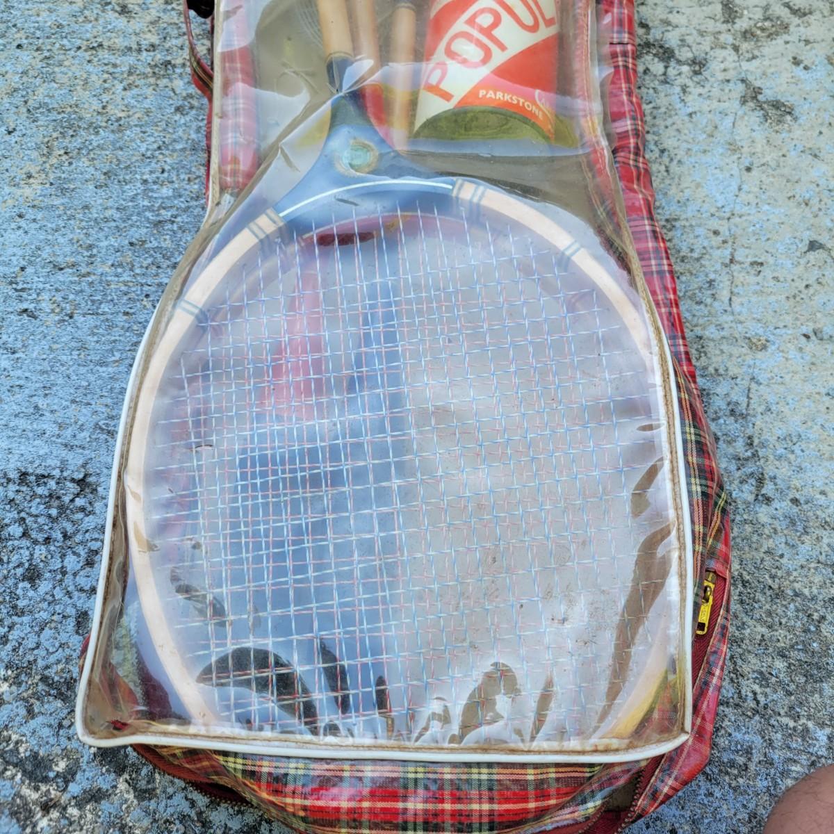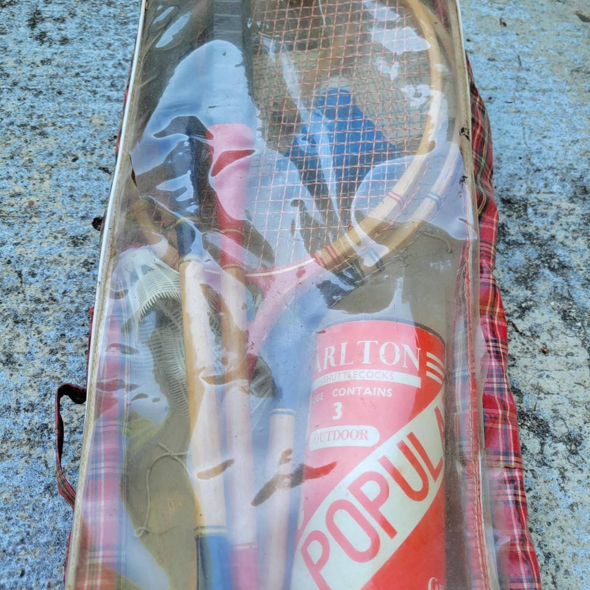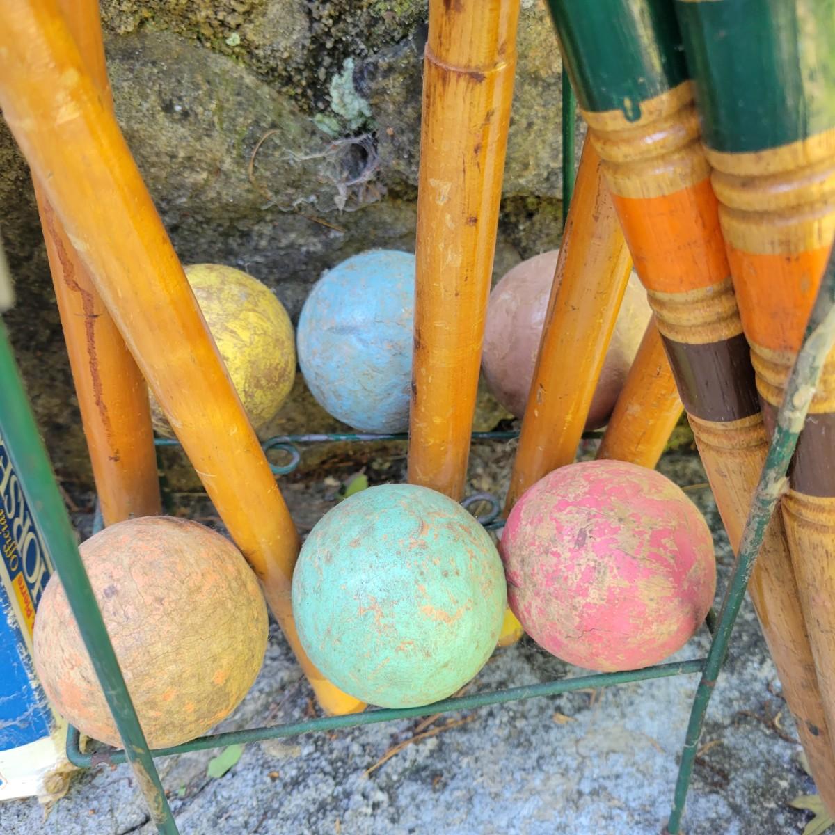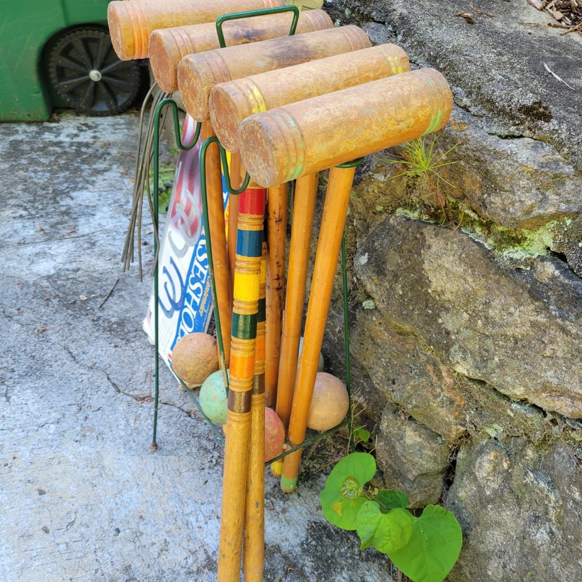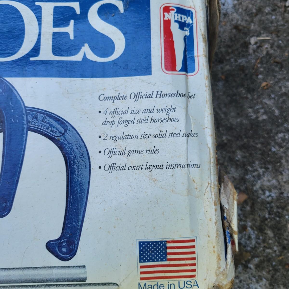 An assortment of vintage outdoor games that includes a set of horseshoes made of dropped forge steel that has four shoes and two posts. A croquet set with hoops and balls and a badminton set. Local pickup only