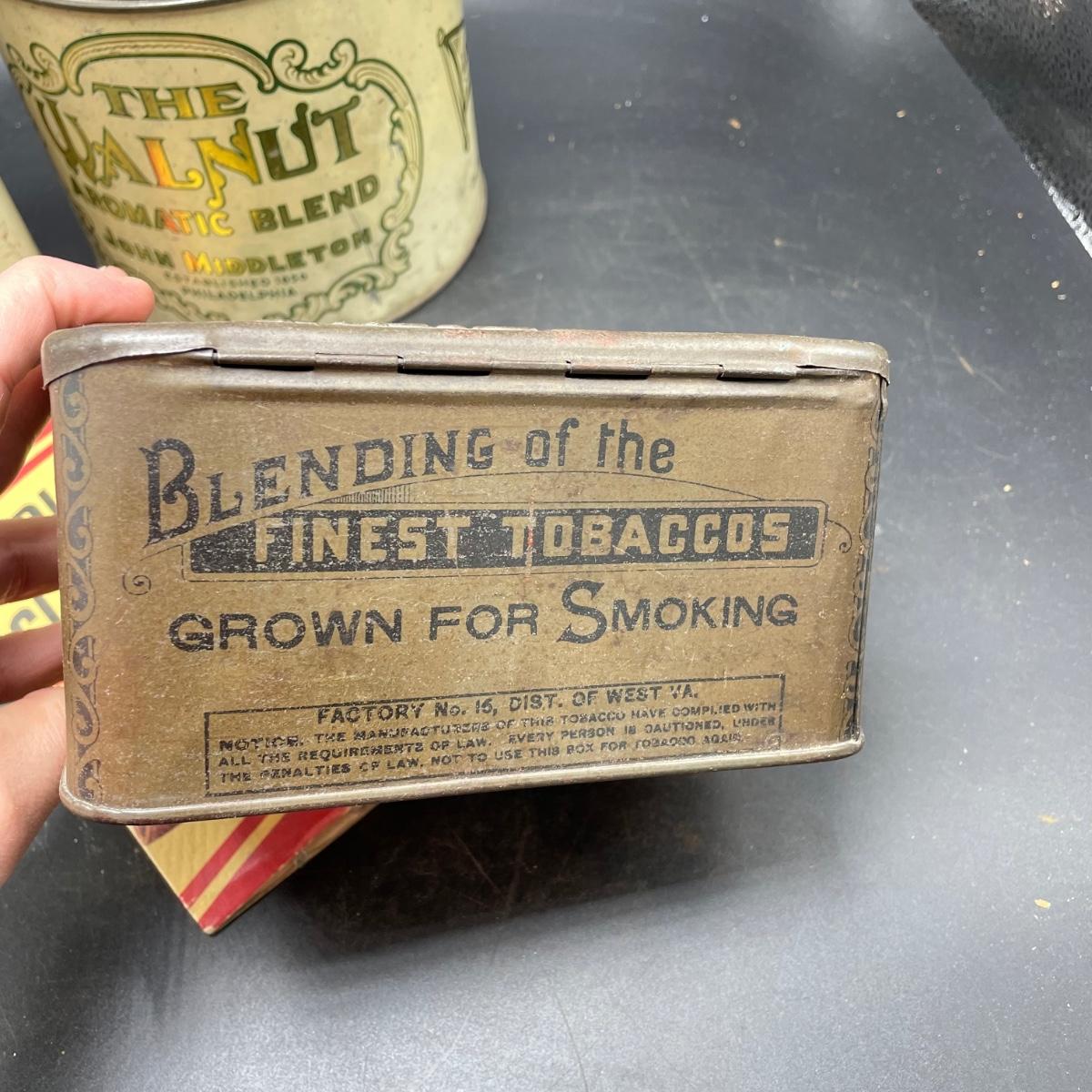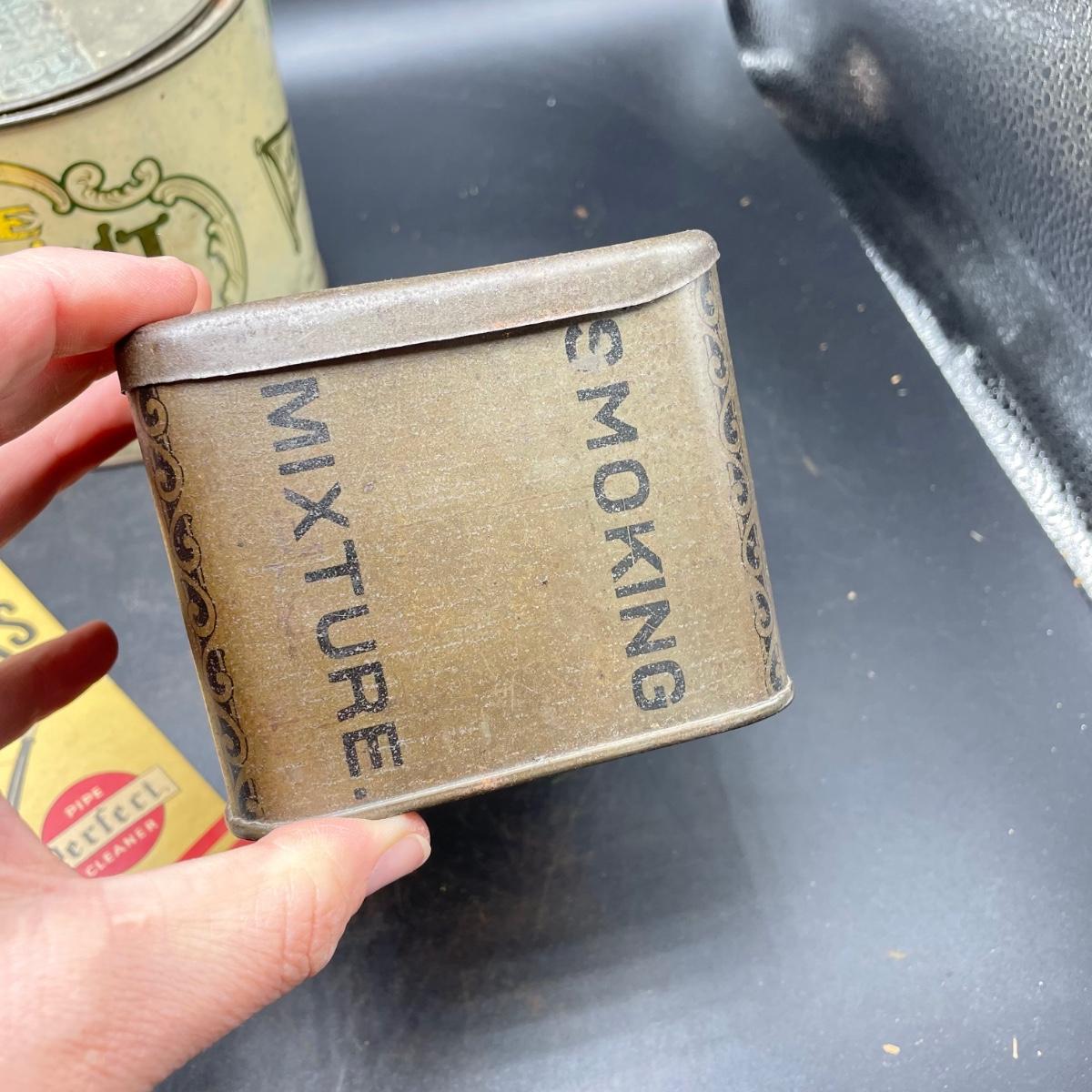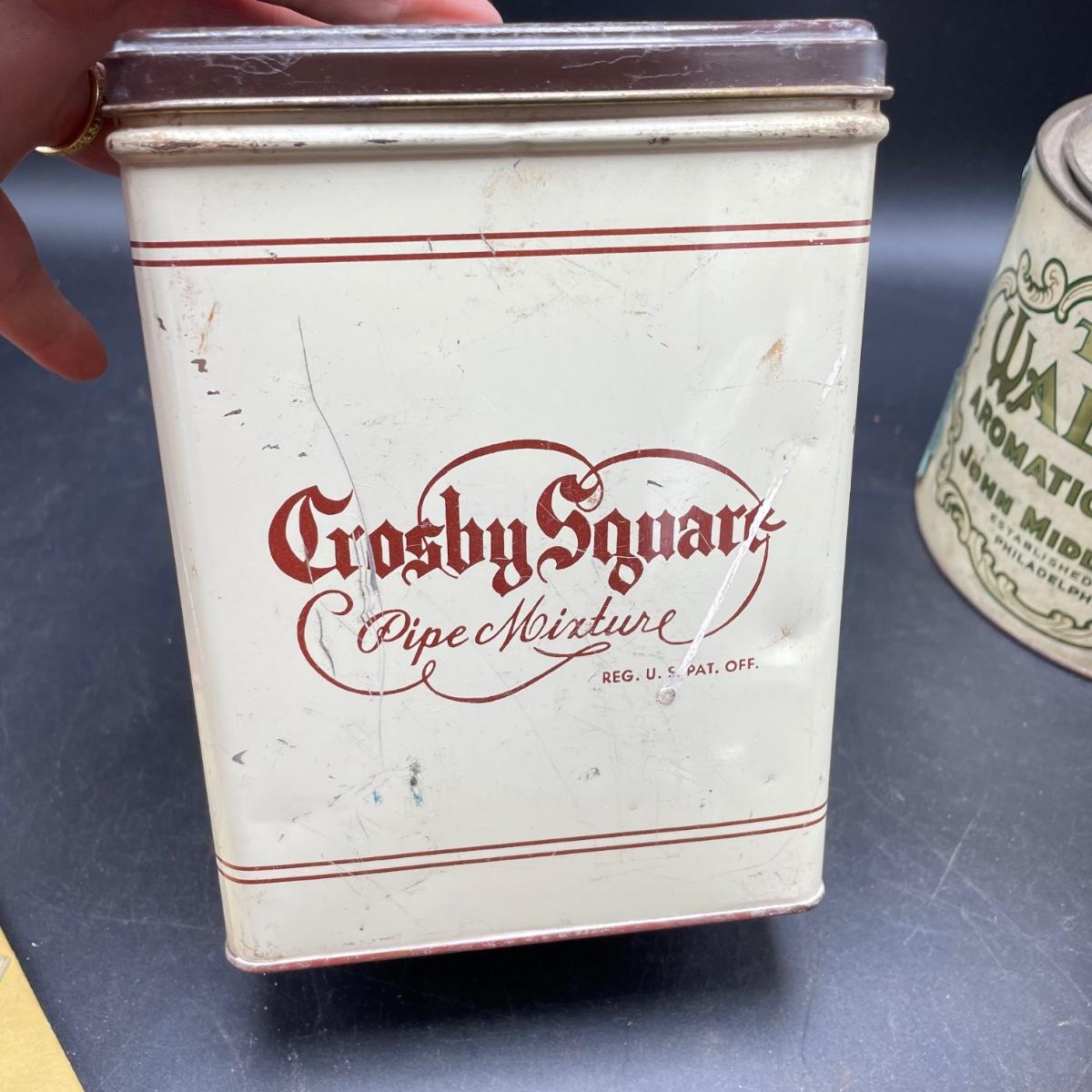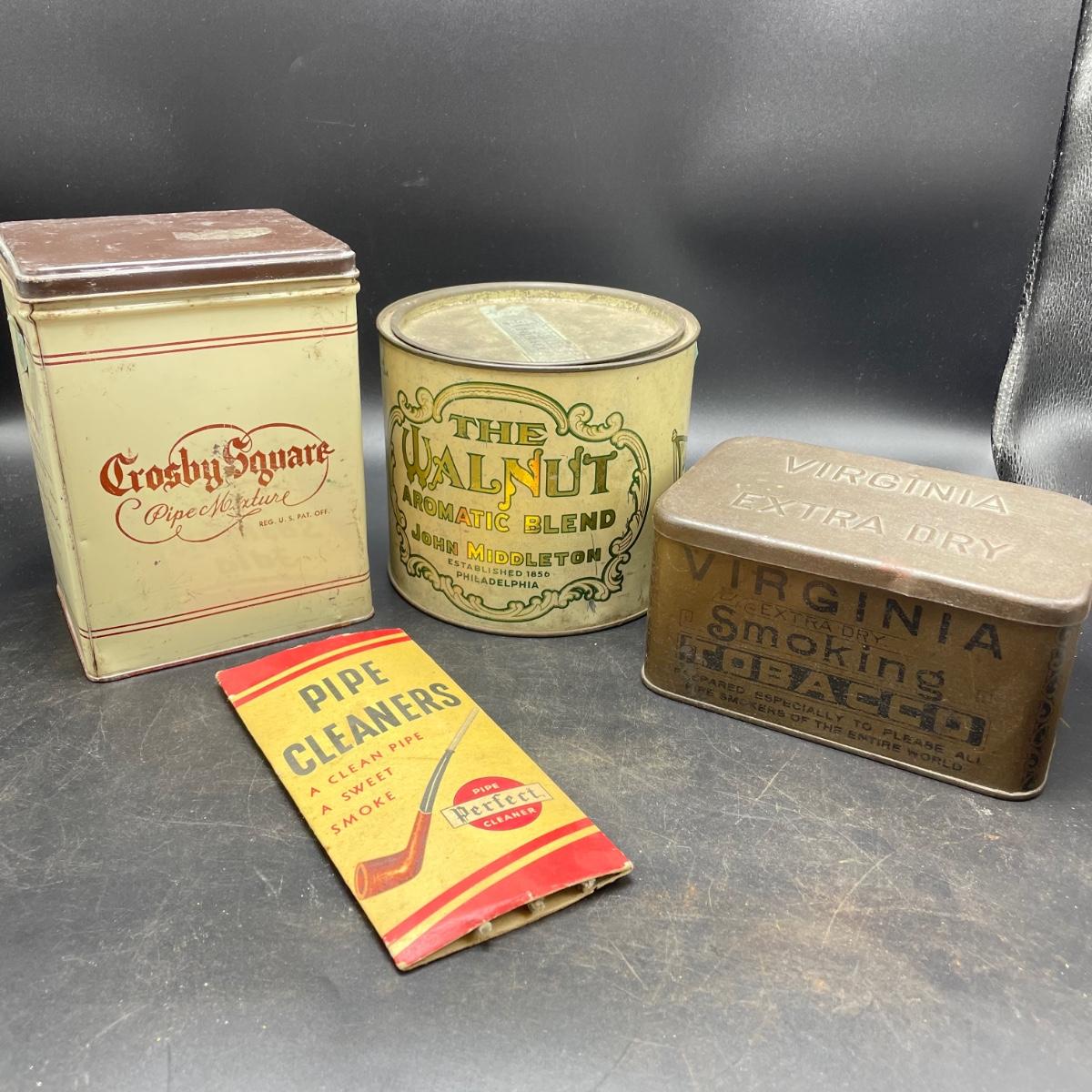 Three vintage tins plus a pack of vintage pipe cleaners. We did not attempt to force open the tins, they seem empty given their light weight. The Crosby Square Pipe Moisture tin measures 5” x 3.75” x 6.25”. The Virginia Smoking Tobacco is the only tin with a hinged lid. The Walnut Aromatic Blend John Middleton tin boasts one pound. See images. Shipping available.