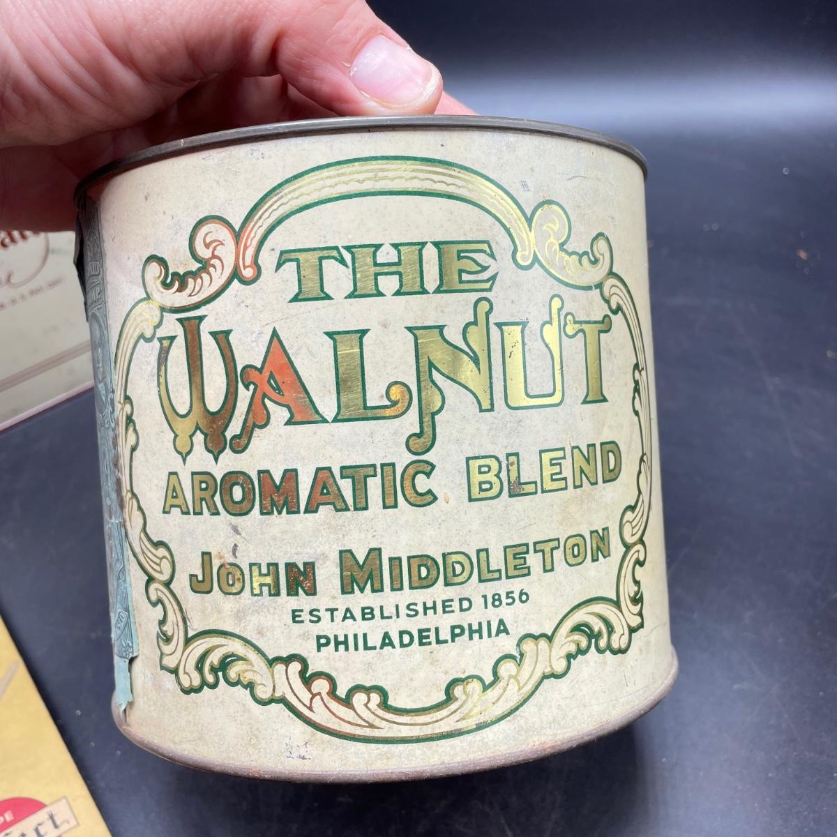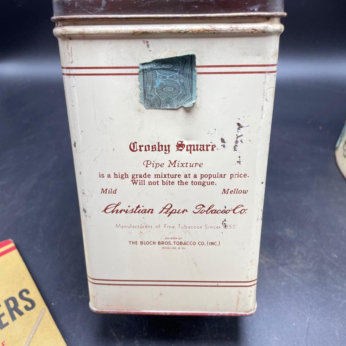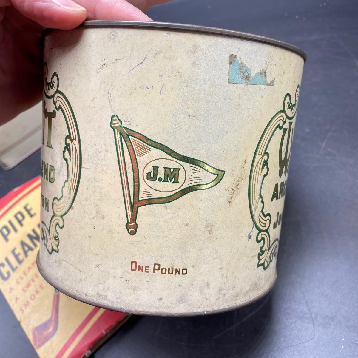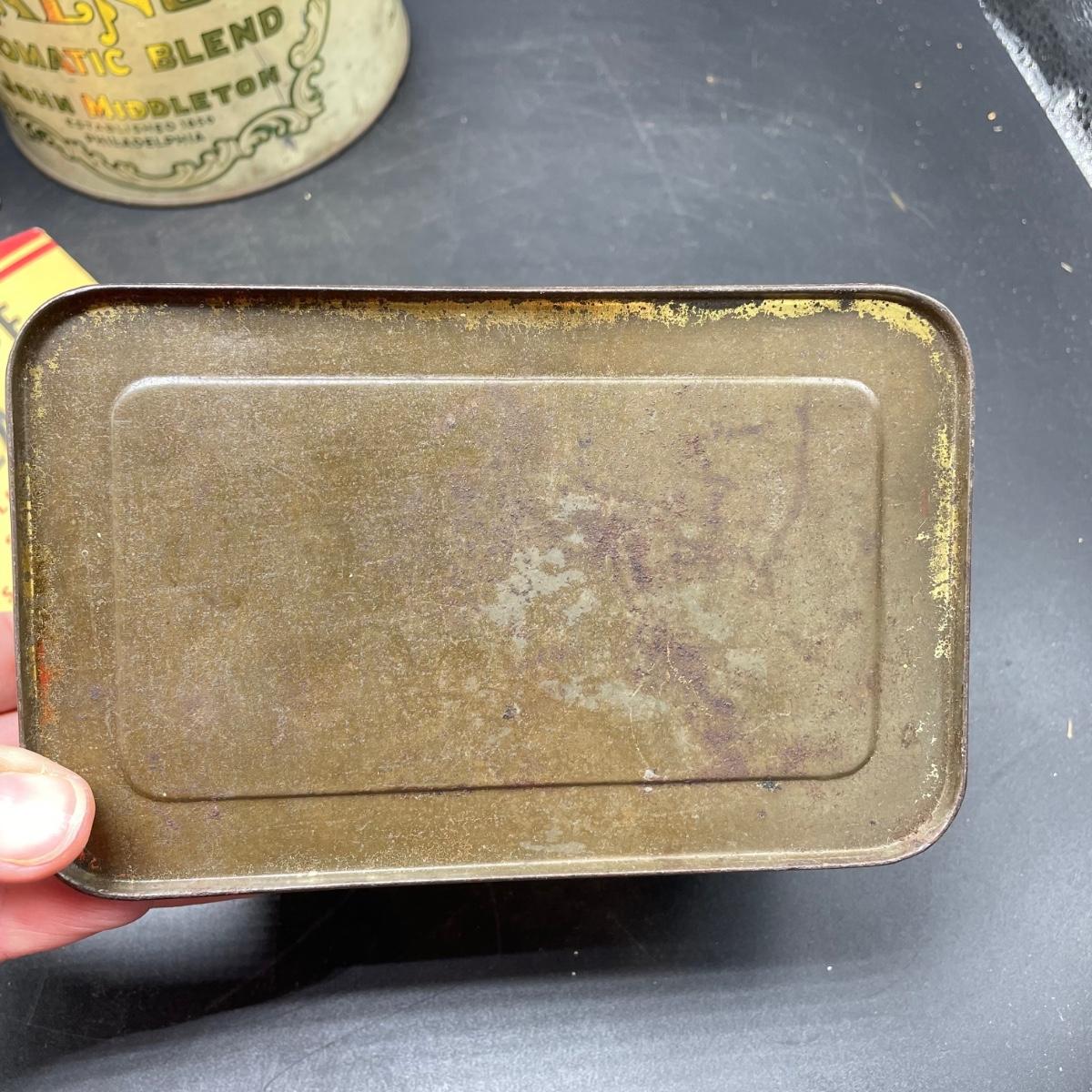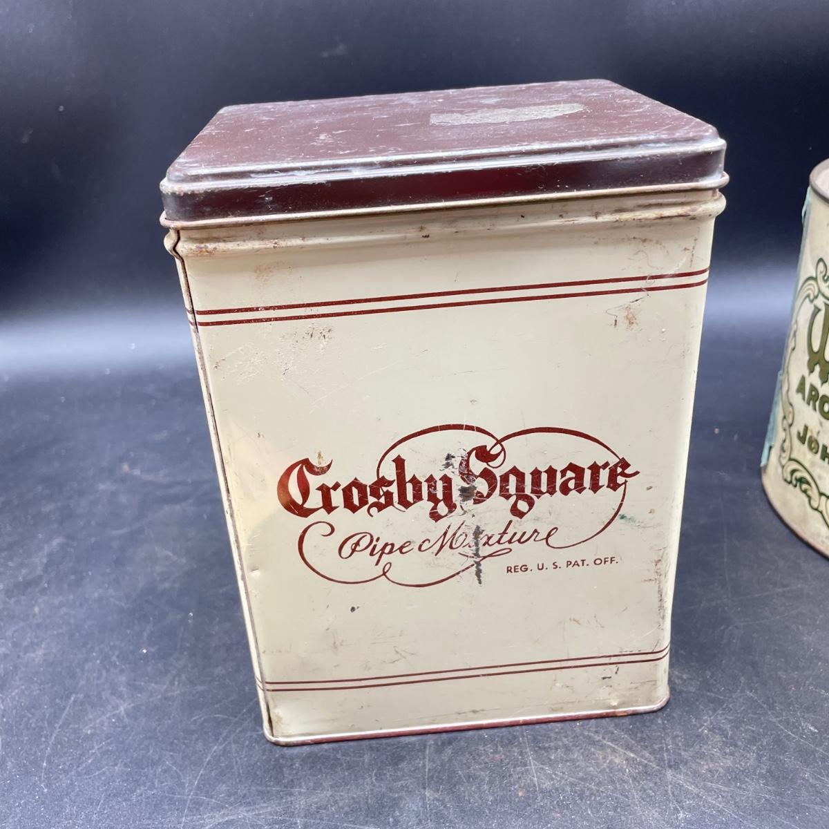 Three vintage tins plus a pack of vintage pipe cleaners. We did not attempt to force open the tins, they seem empty given their light weight. The Crosby Square Pipe Moisture tin measures 5” x 3.75” x 6.25”. The Virginia Smoking Tobacco is the only tin with a hinged lid. The Walnut Aromatic Blend John Middleton tin boasts one pound. See images. Shipping available.