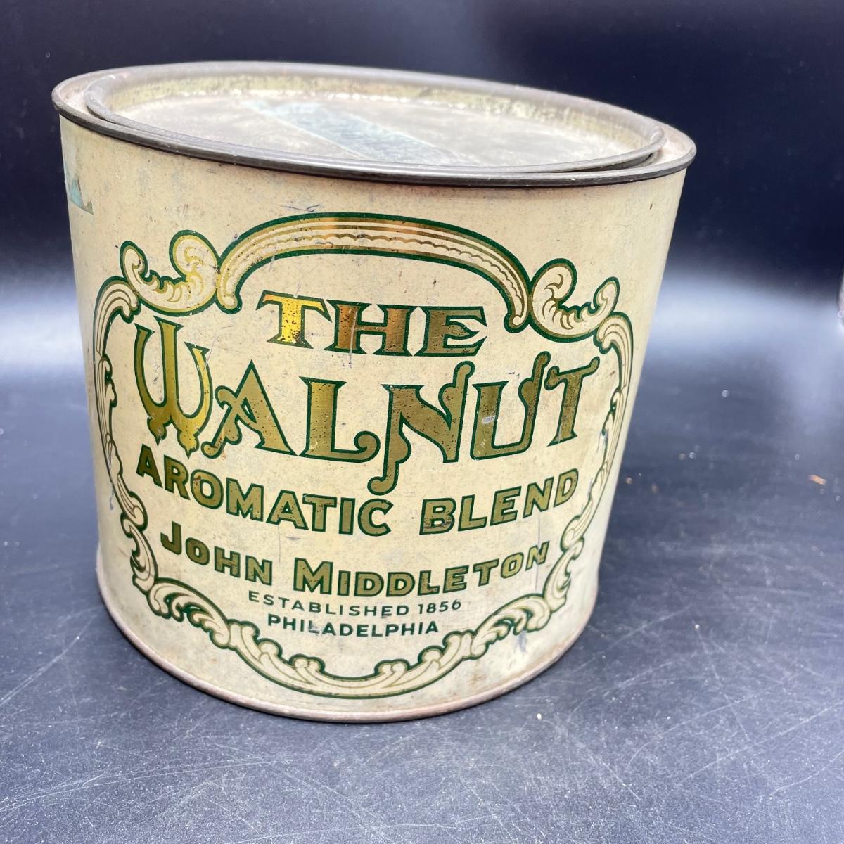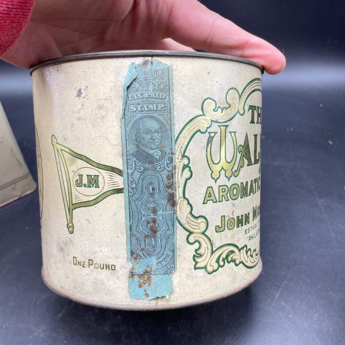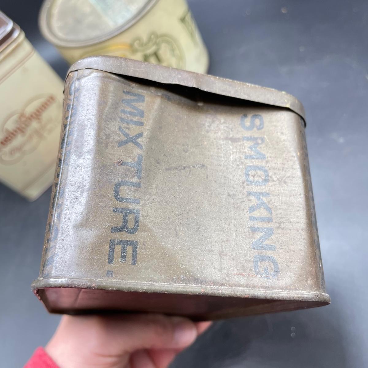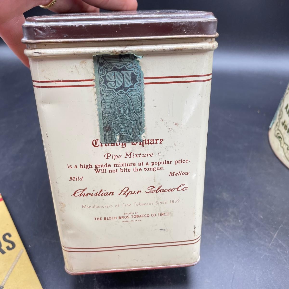 Three vintage tins plus a pack of vintage pipe cleaners. We did not attempt to force open the tins, they seem empty given their light weight. The Crosby Square Pipe Moisture tin measures 5” x 3.75” x 6.25”. The Virginia Smoking Tobacco is the only tin with a hinged lid. The Walnut Aromatic Blend John Middleton tin boasts one pound. See images. Shipping available.