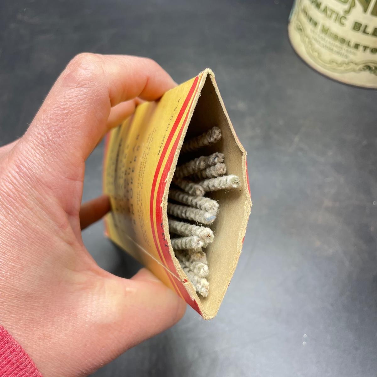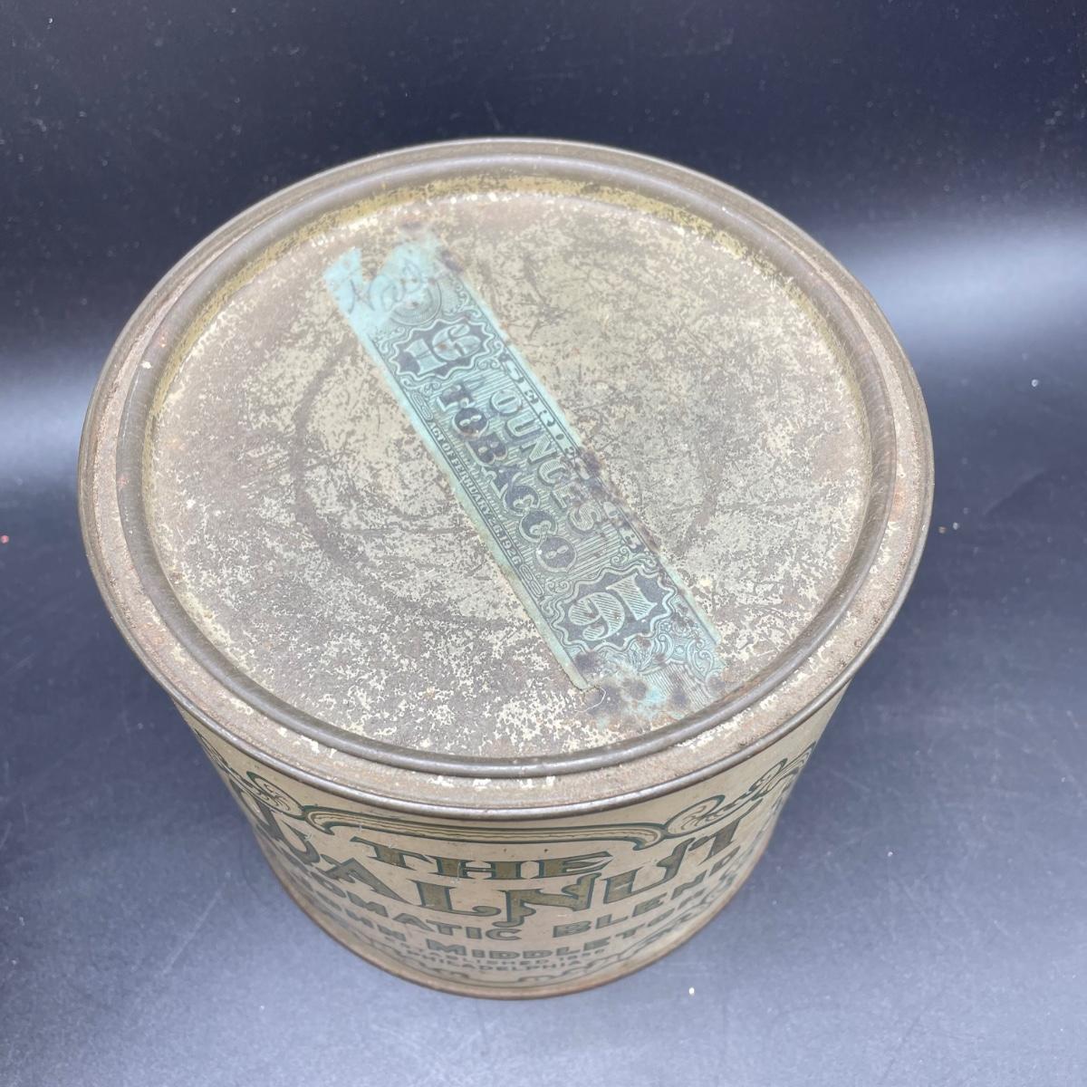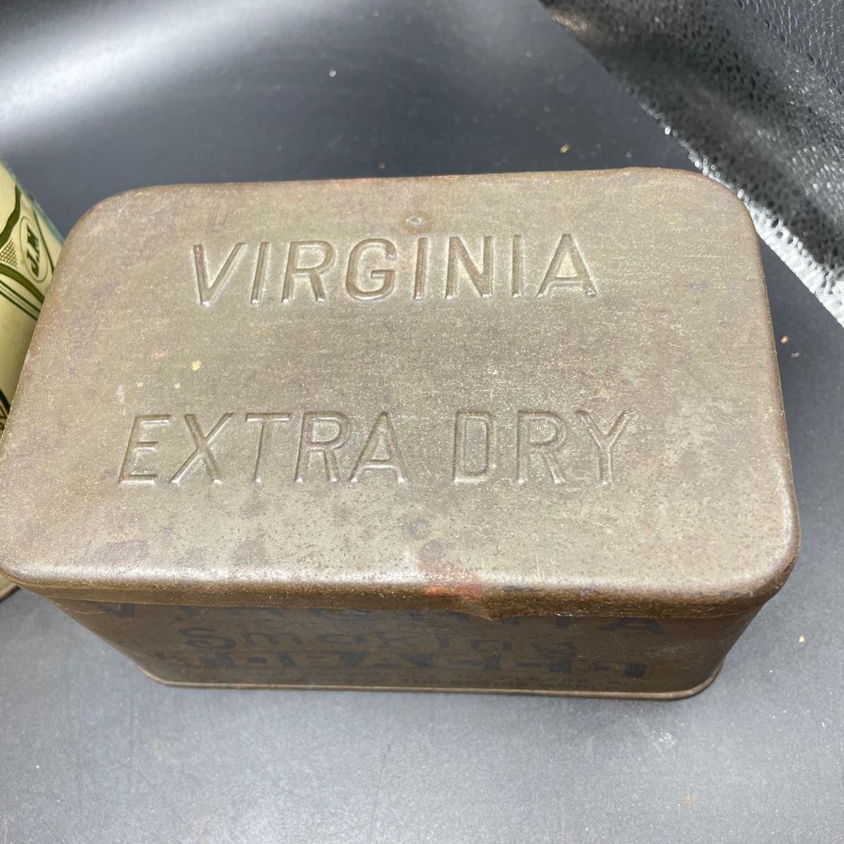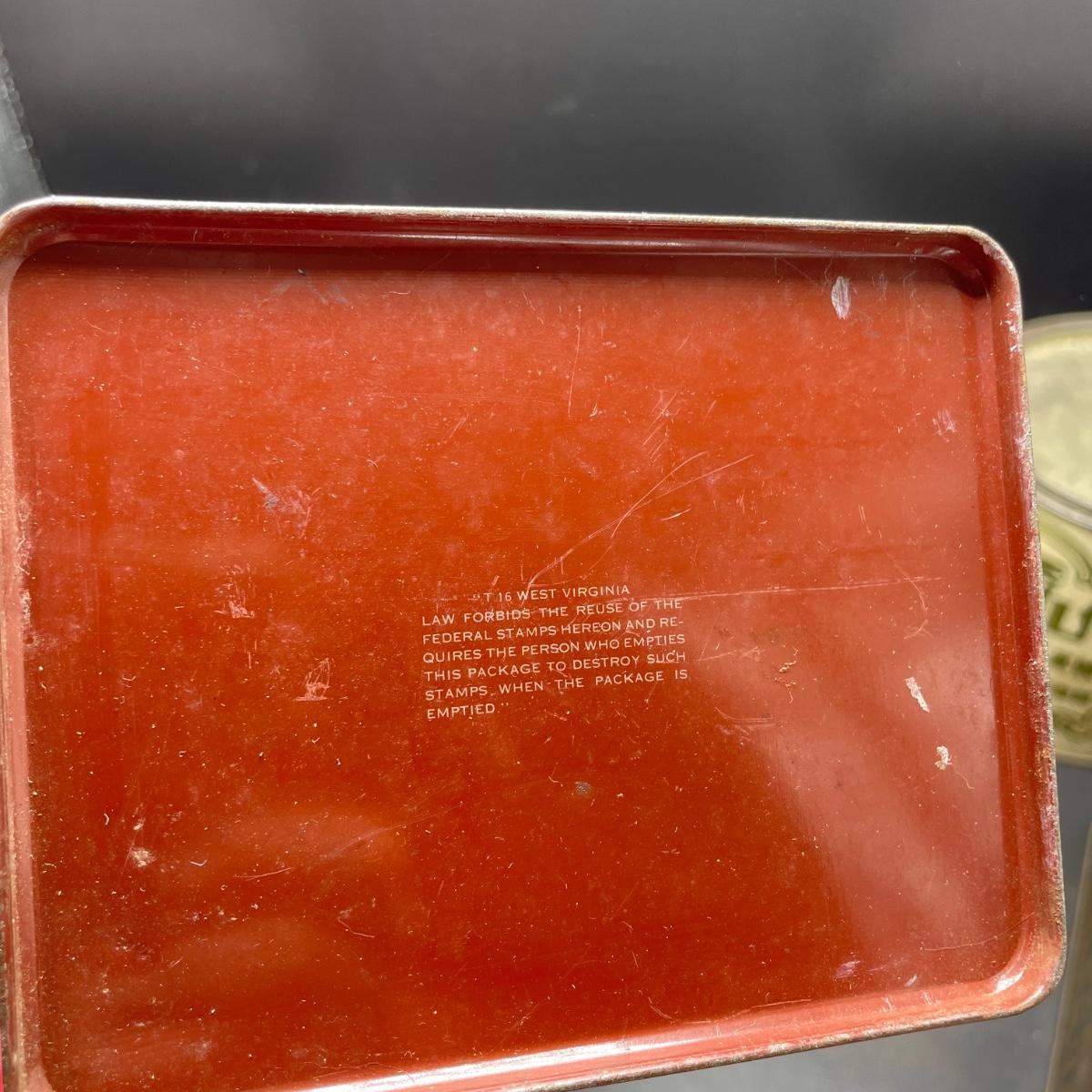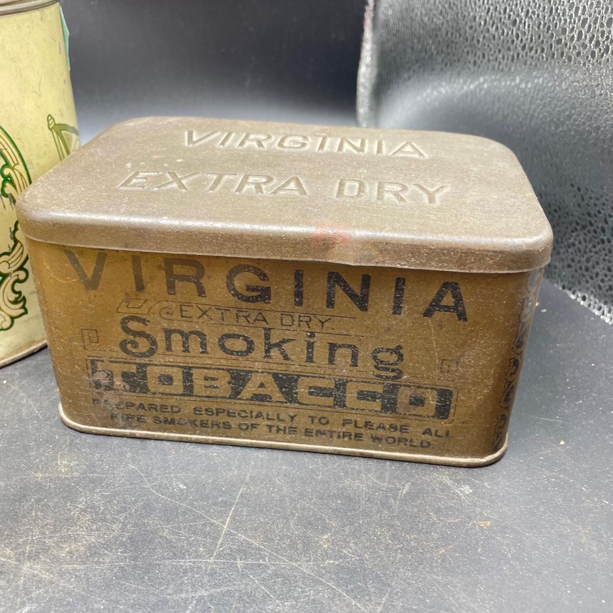 Three vintage tins plus a pack of vintage pipe cleaners. We did not attempt to force open the tins, they seem empty given their light weight. The Crosby Square Pipe Moisture tin measures 5” x 3.75” x 6.25”. The Virginia Smoking Tobacco is the only tin with a hinged lid. The Walnut Aromatic Blend John Middleton tin boasts one pound. See images. Shipping available.