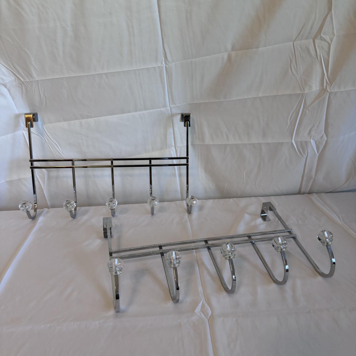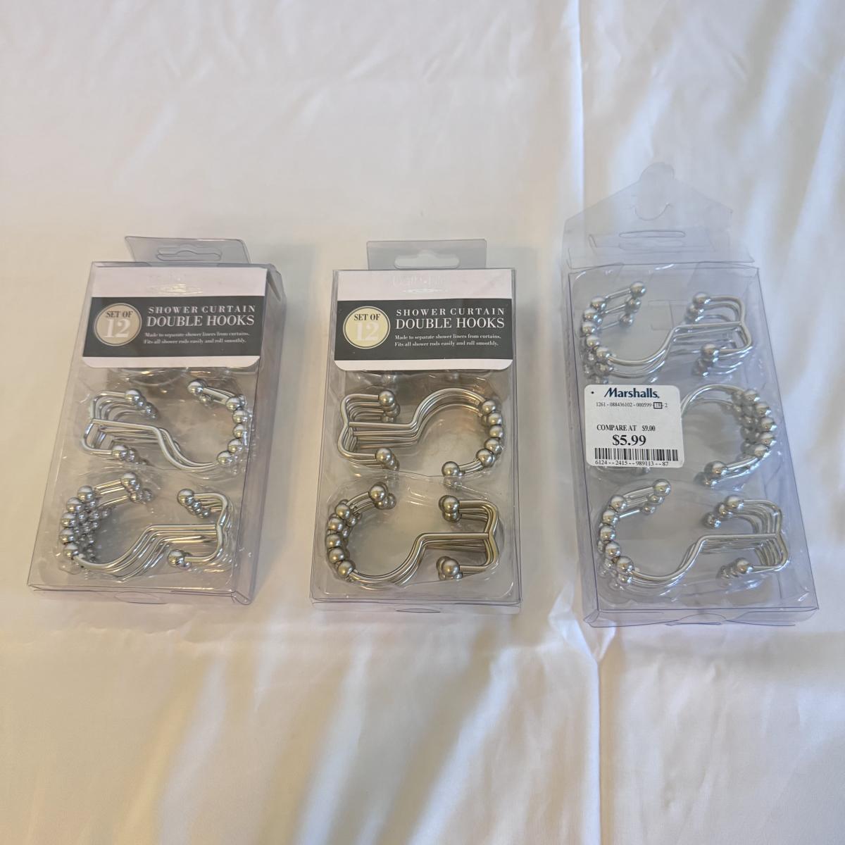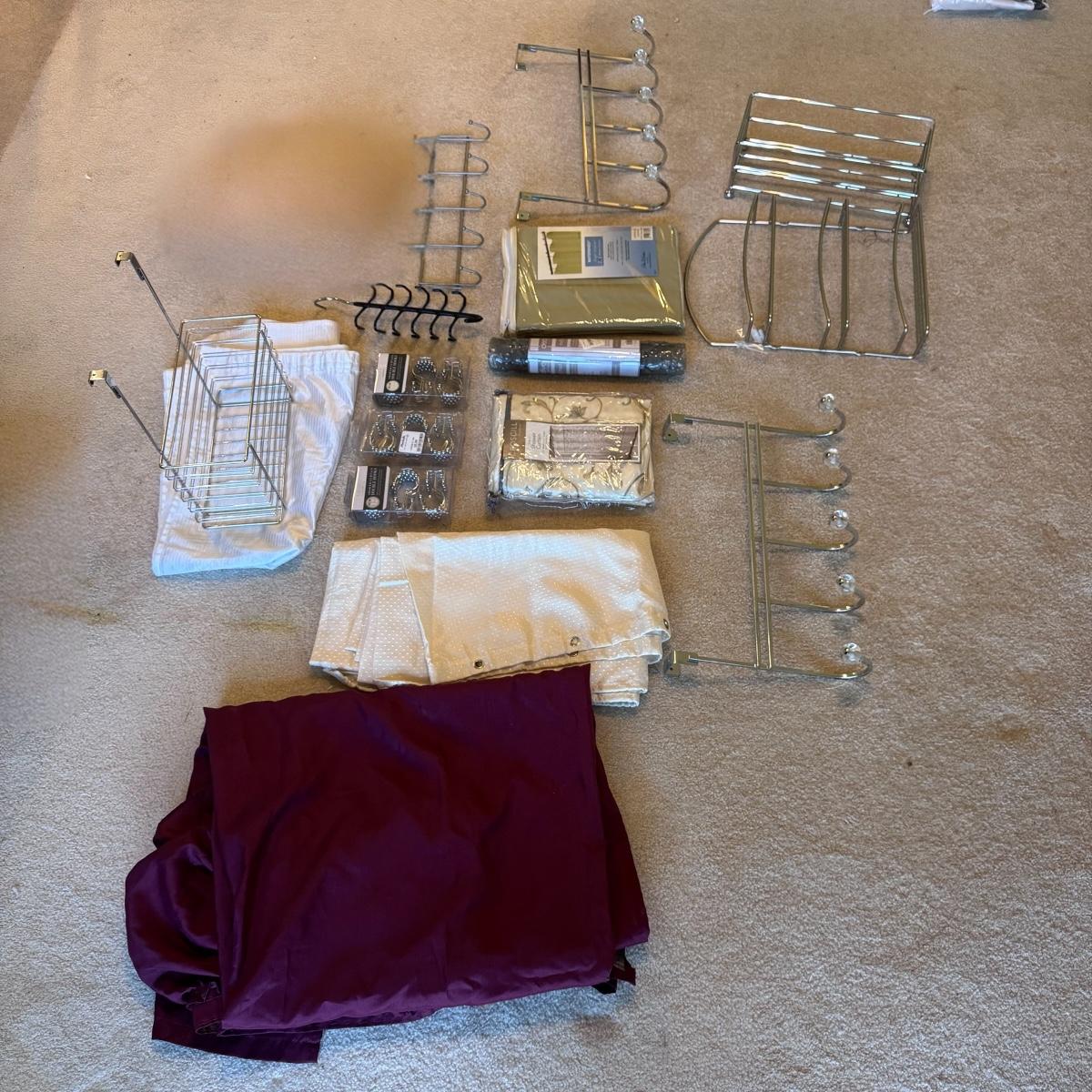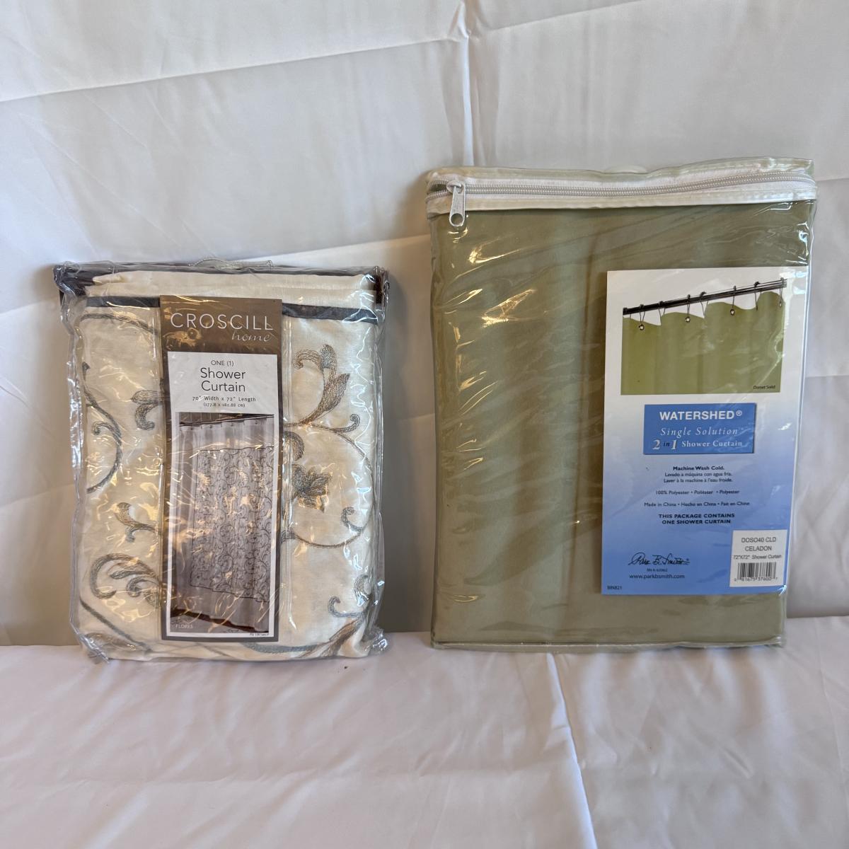 This lot includes five shower curtains (2 NIB) from Croscill Home, Watershed, and unlabeled brands. You’ll find a NIB bath mat, several metal storage racks, and three boxes of shower hooks. Please see photos for measurements of the two NIB shower curtains. Shipping available.