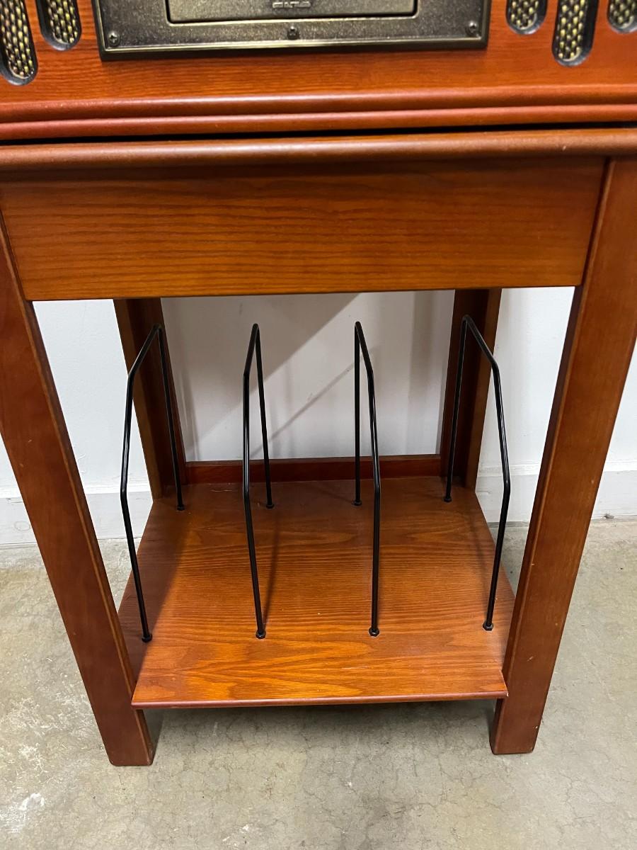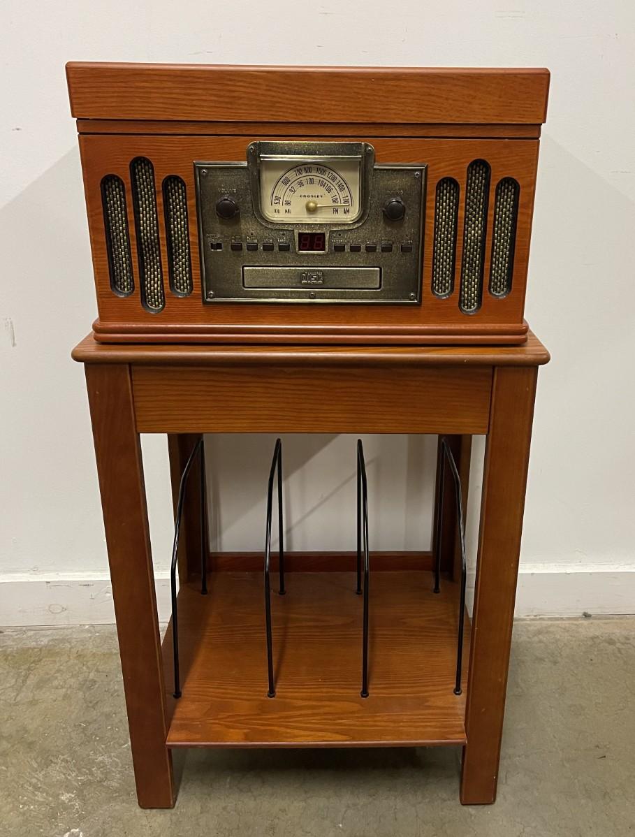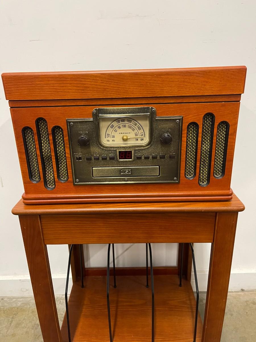 Crosley Reproduction Radio with Turntable and Wooden Base with Album Storage, untested. 34" high on the base.