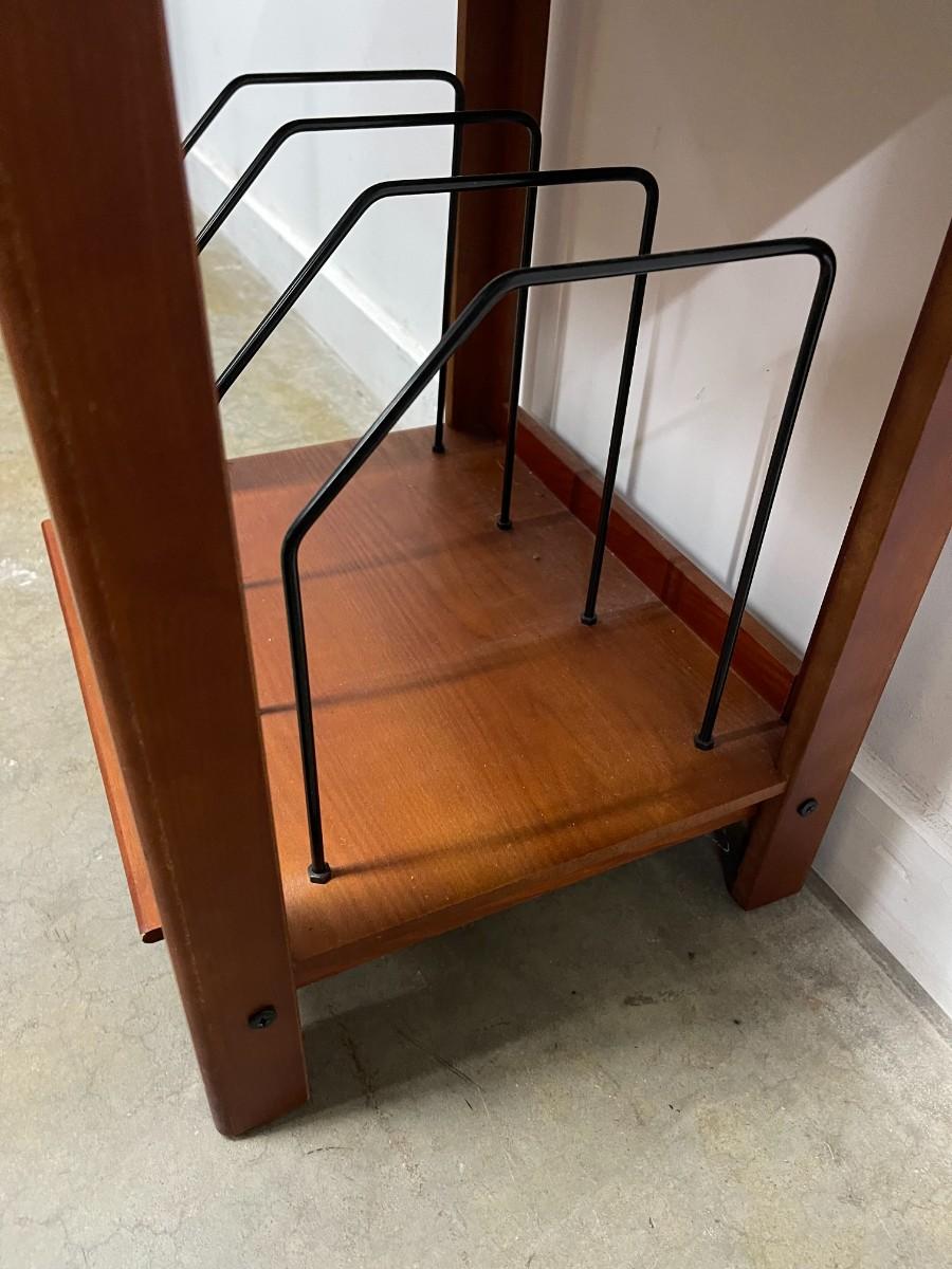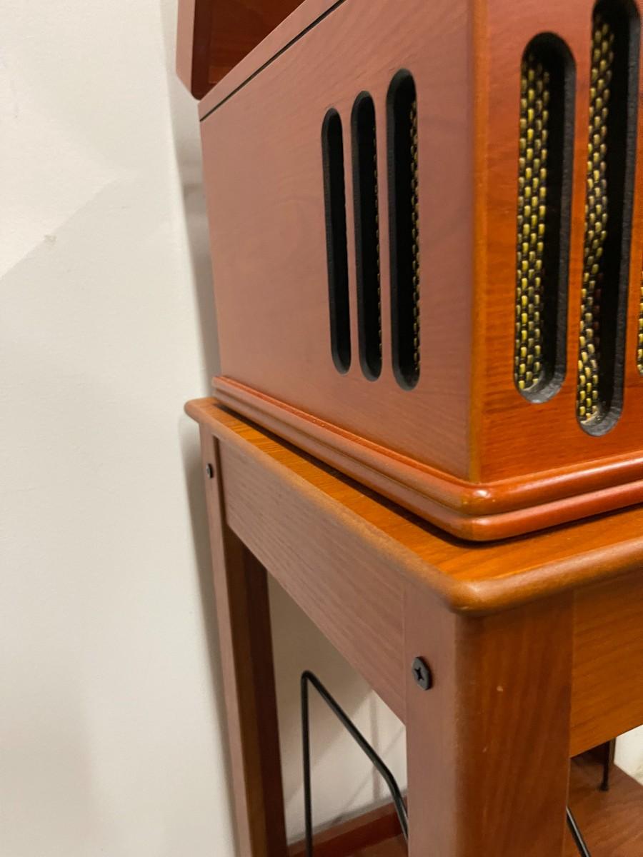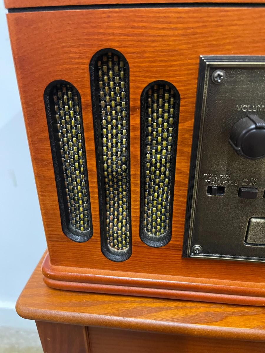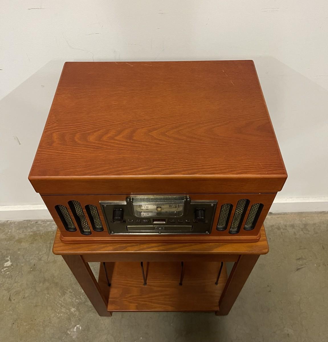 Crosley Reproduction Radio with Turntable and Wooden Base with Album Storage, untested. 34" high on the base.
