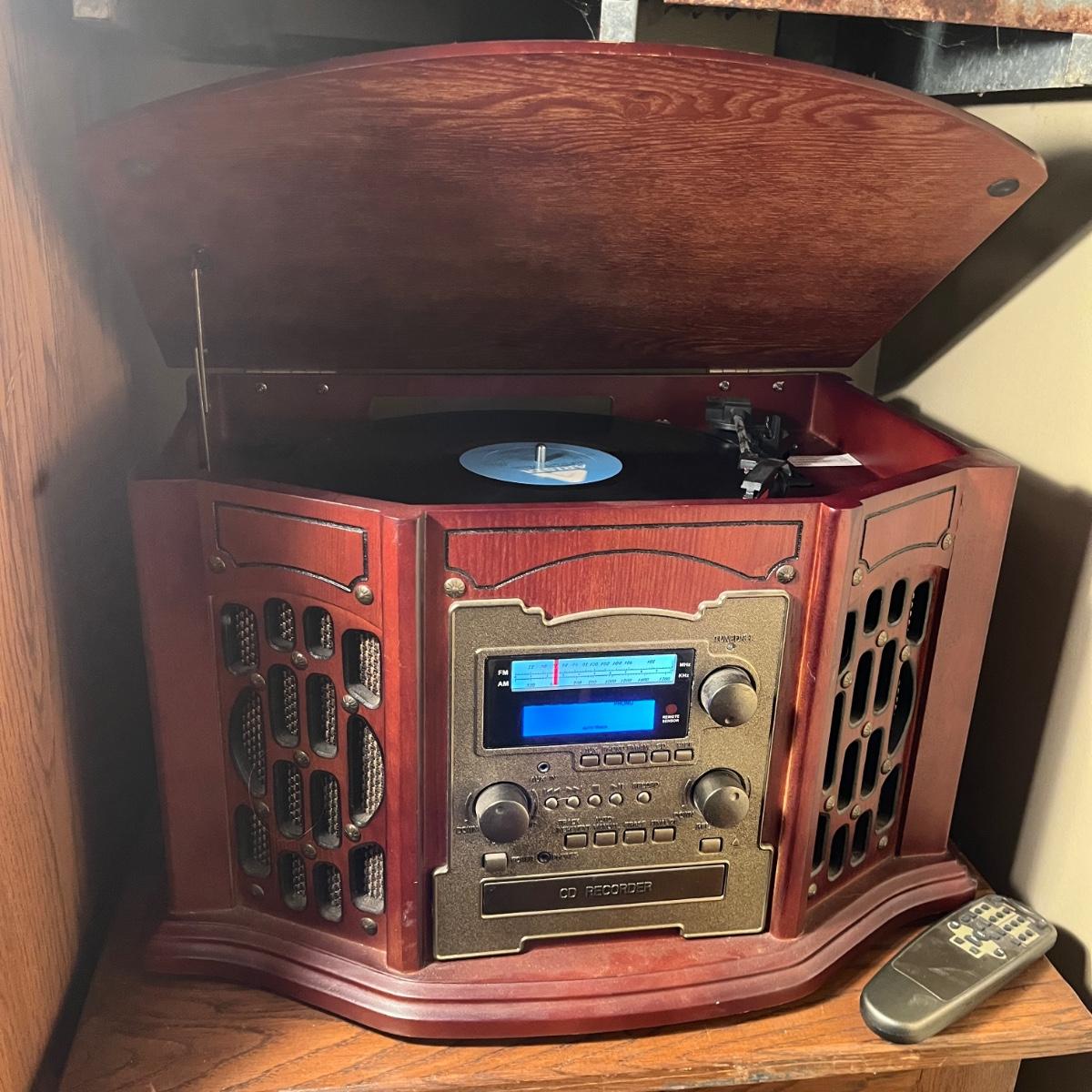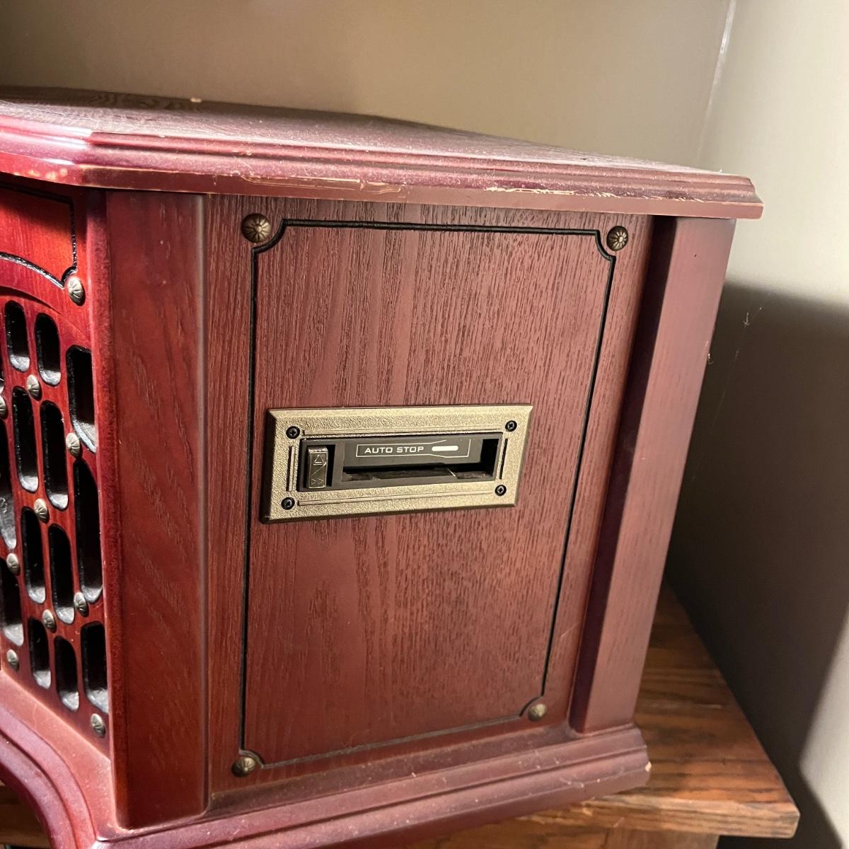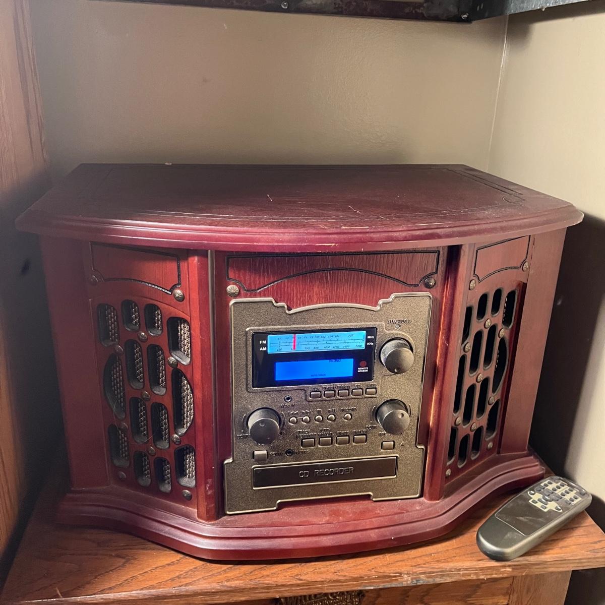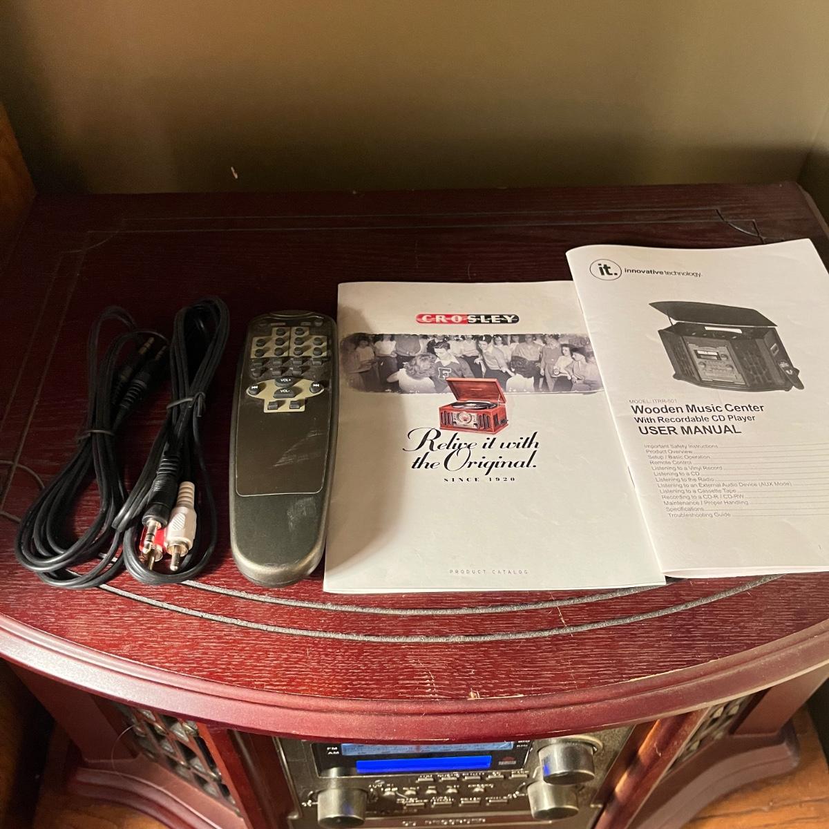 Lot includes a wooden Crosley retro stereo that has AM/FM, CD, Phono and cassette player with working remote. Piece measures 20” x 14” x 12”H. Stereo powered on when plugged in. Top has scratches, see pictures.