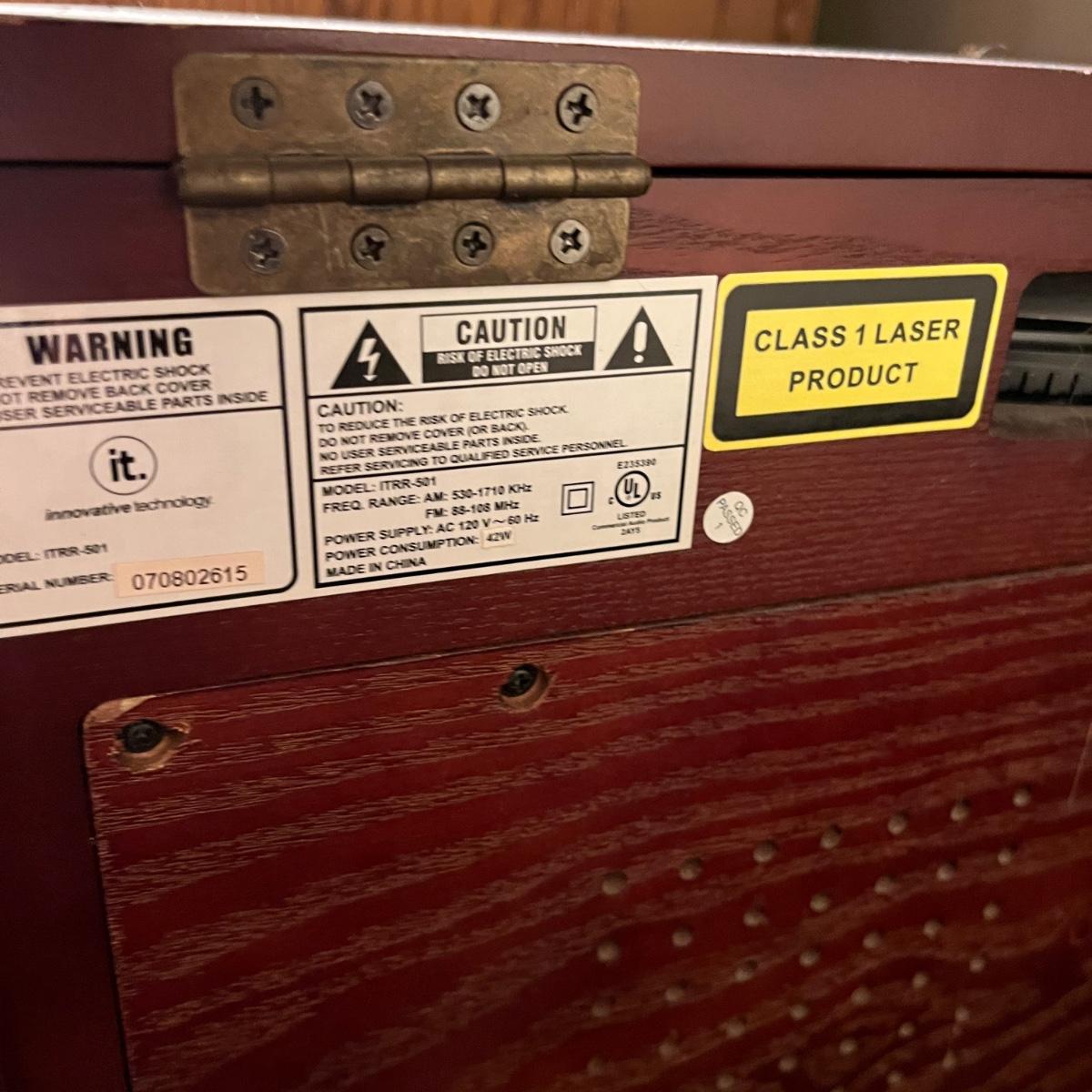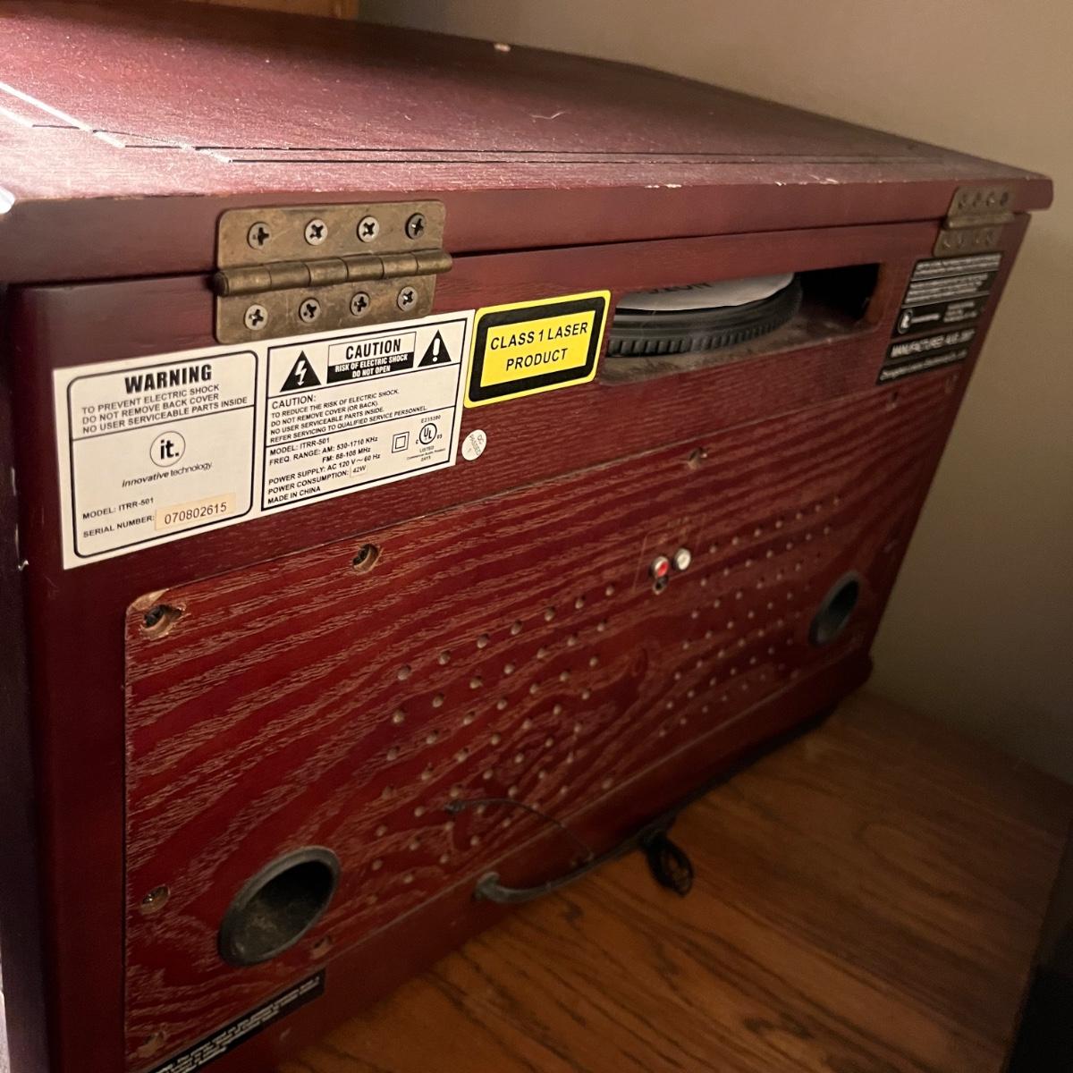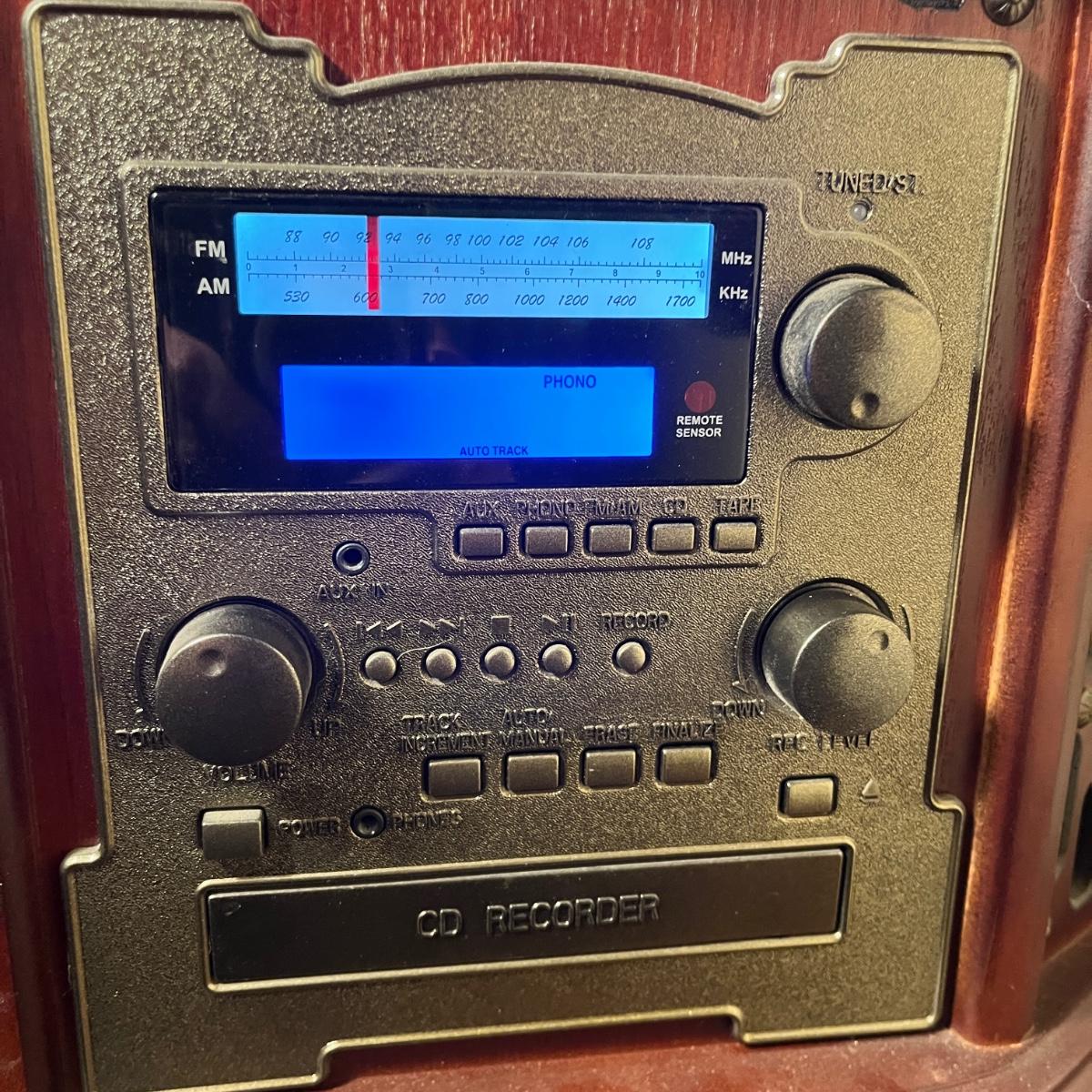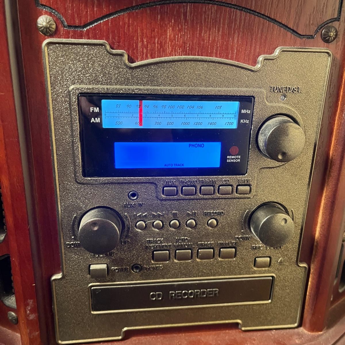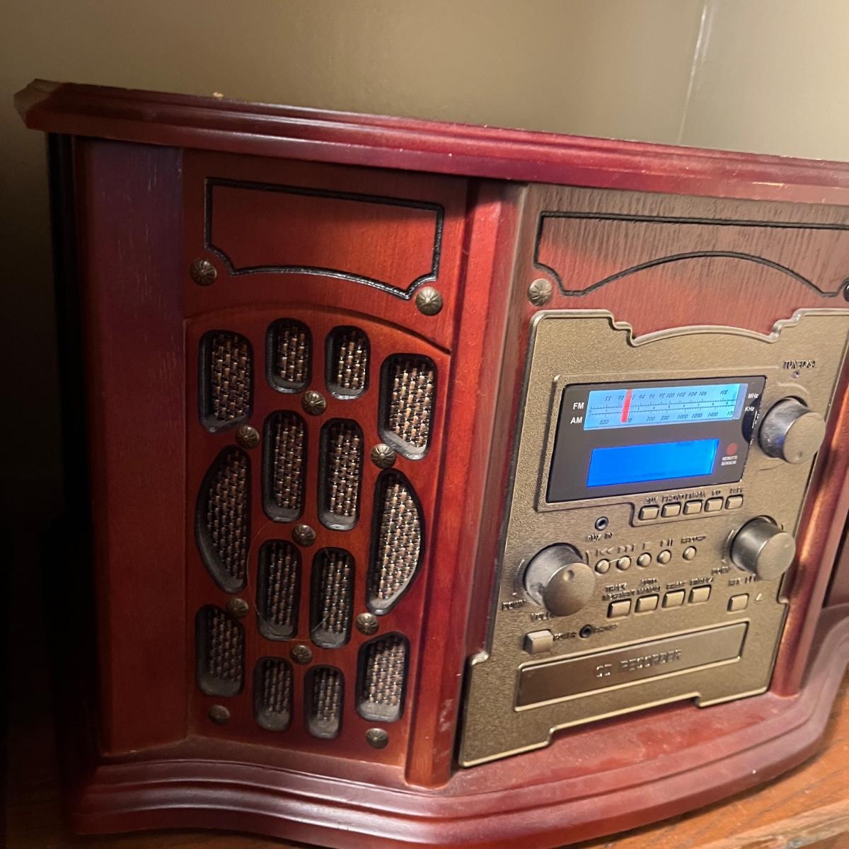 Lot includes a wooden Crosley retro stereo that has AM/FM, CD, Phono and cassette player with working remote. Piece measures 20” x 14” x 12”H. Stereo powered on when plugged in. Top has scratches, see pictures.