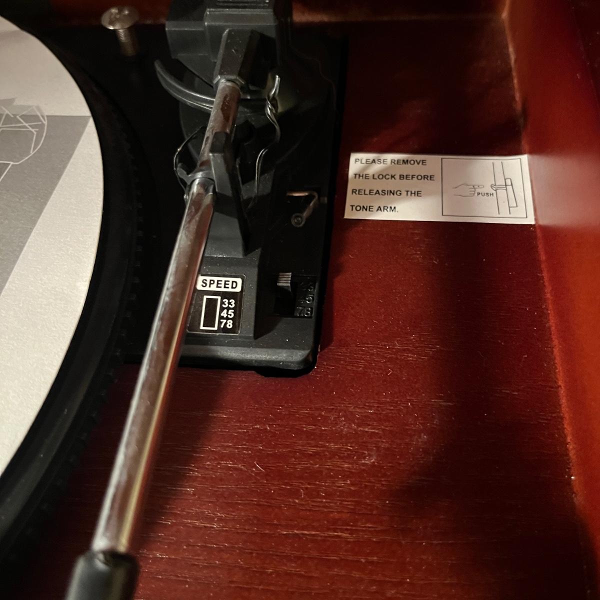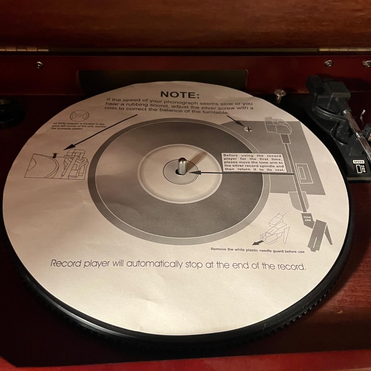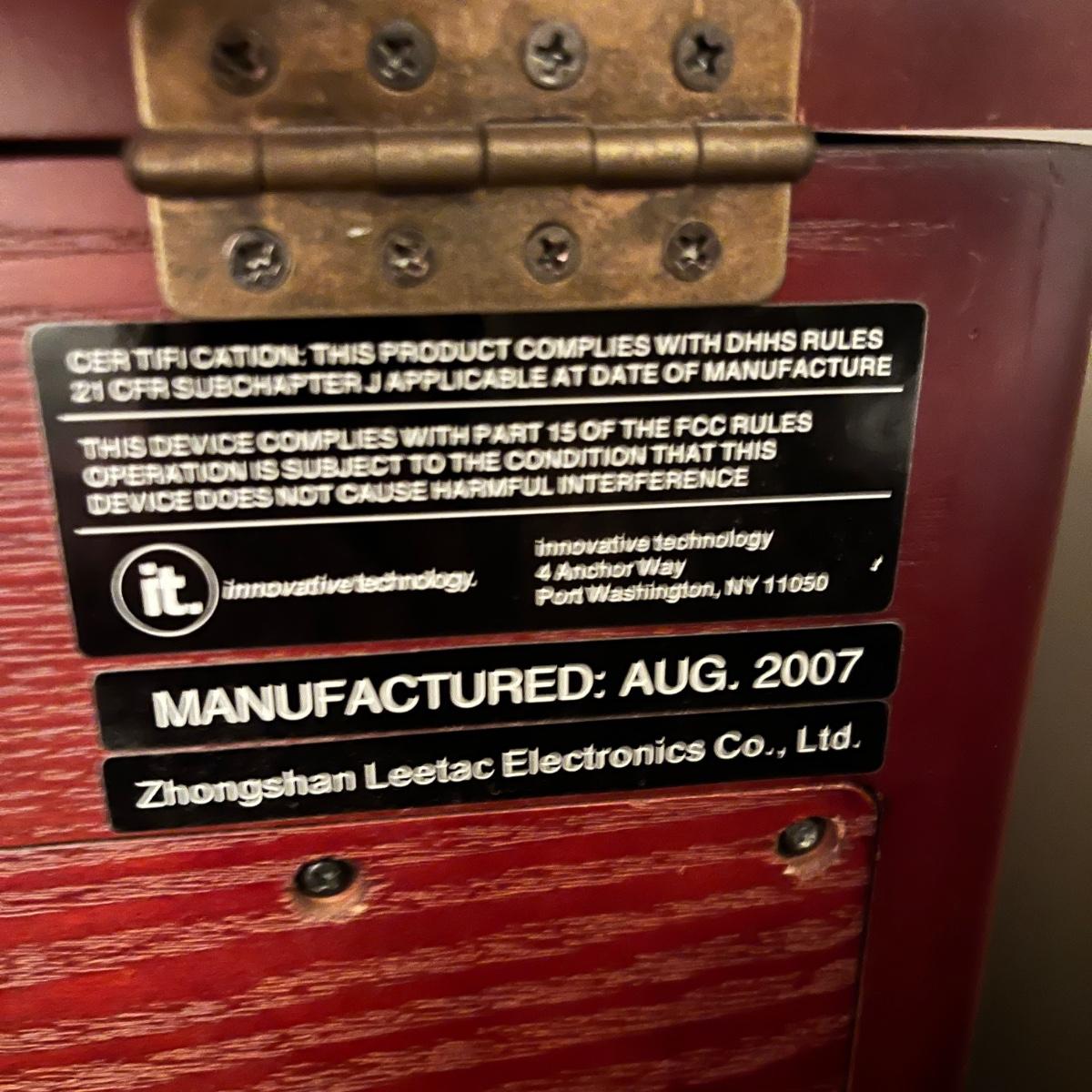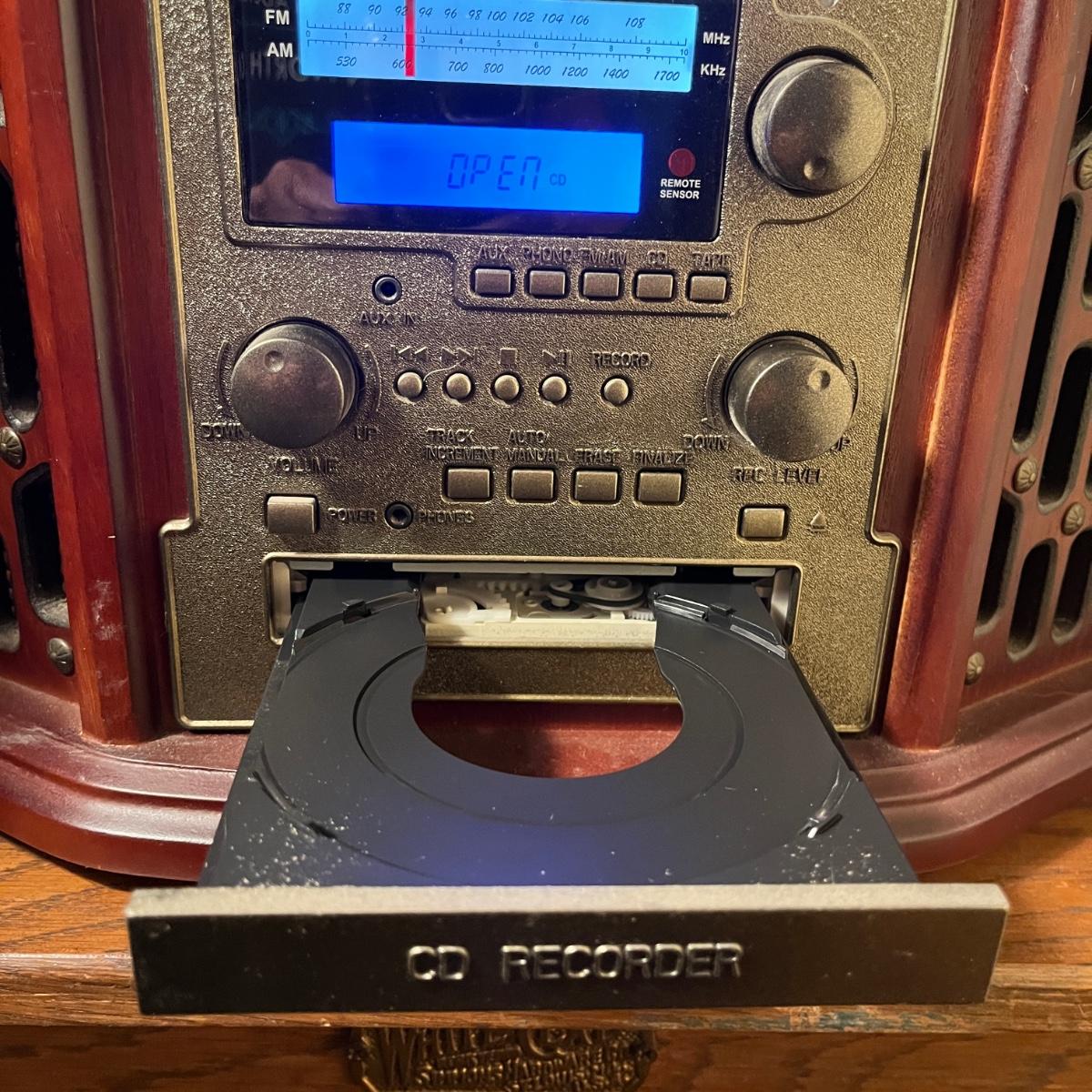 Lot includes a wooden Crosley retro stereo that has AM/FM, CD, Phono and cassette player with working remote. Piece measures 20” x 14” x 12”H. Stereo powered on when plugged in. Top has scratches, see pictures.