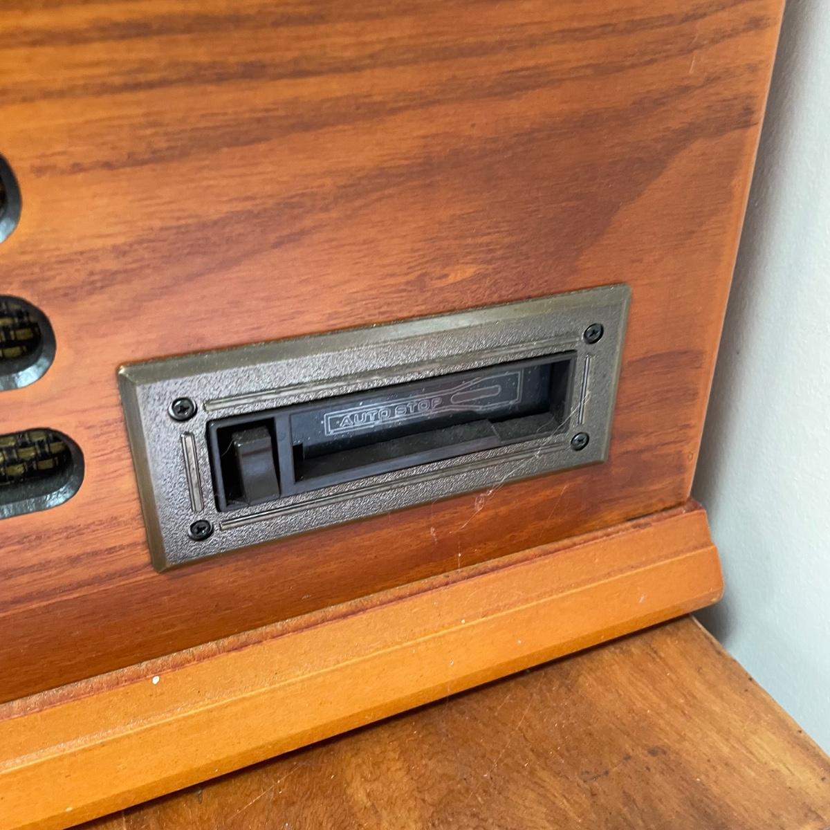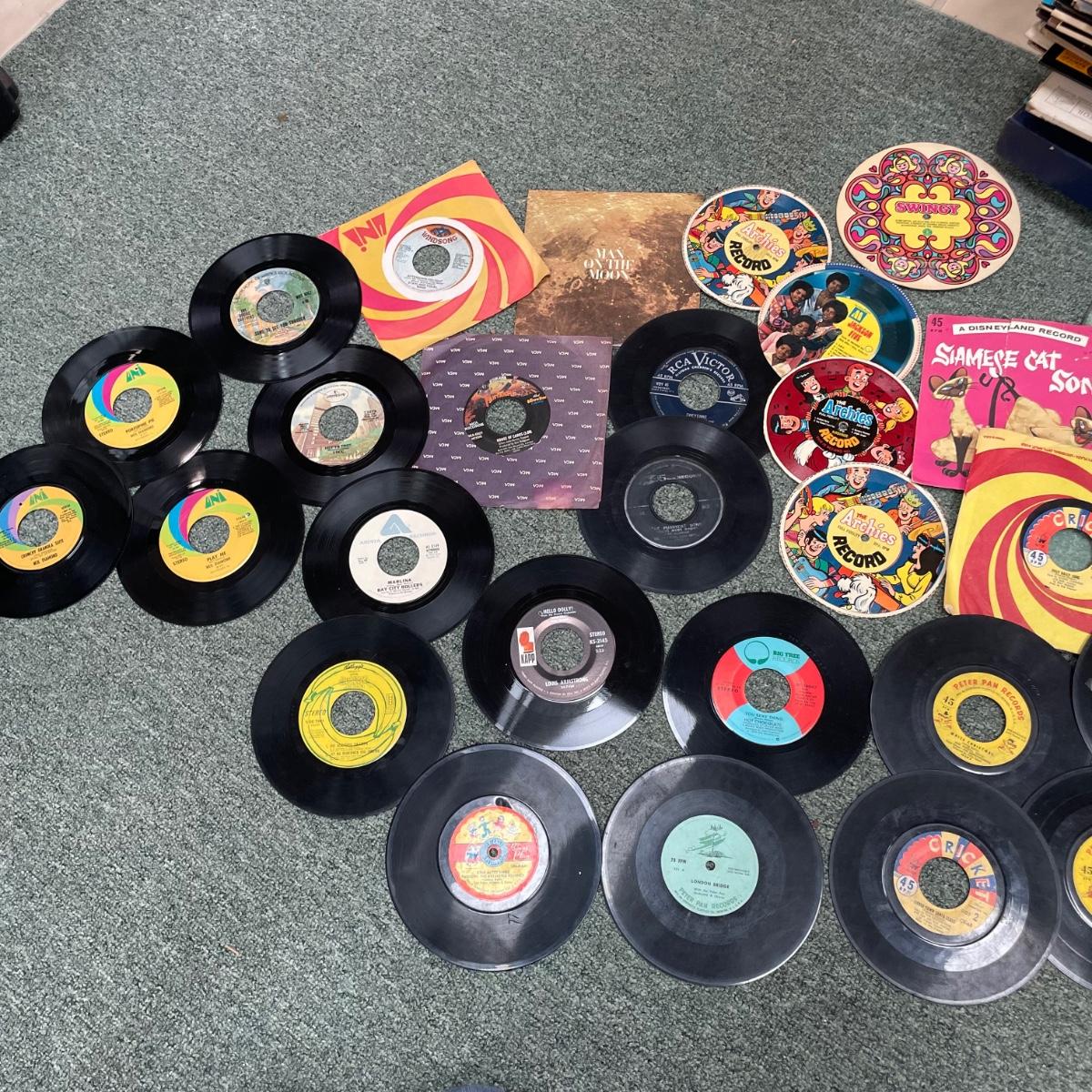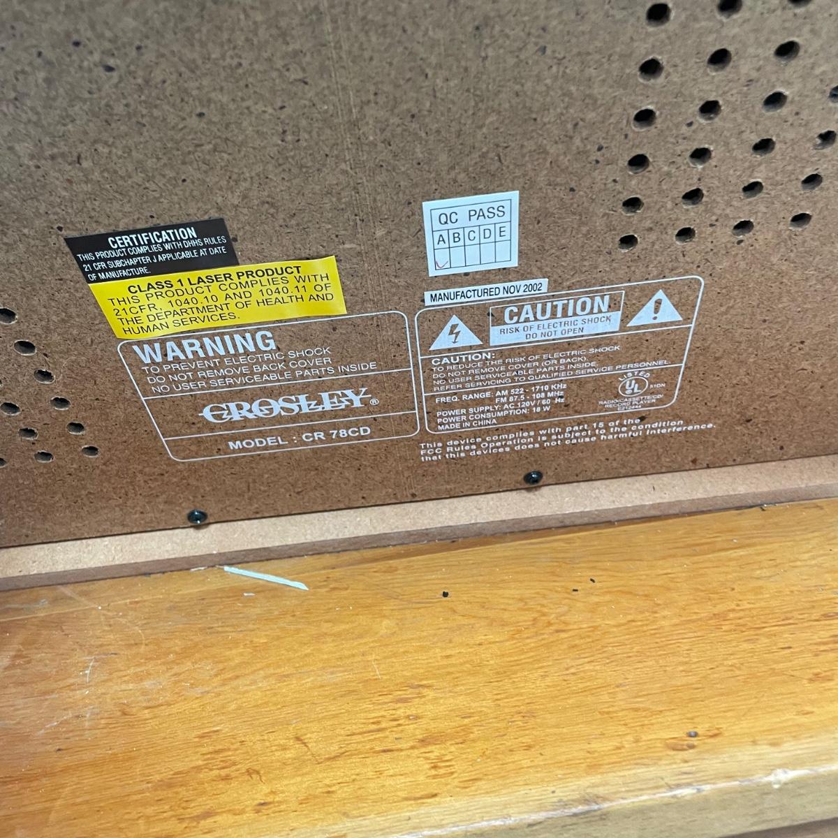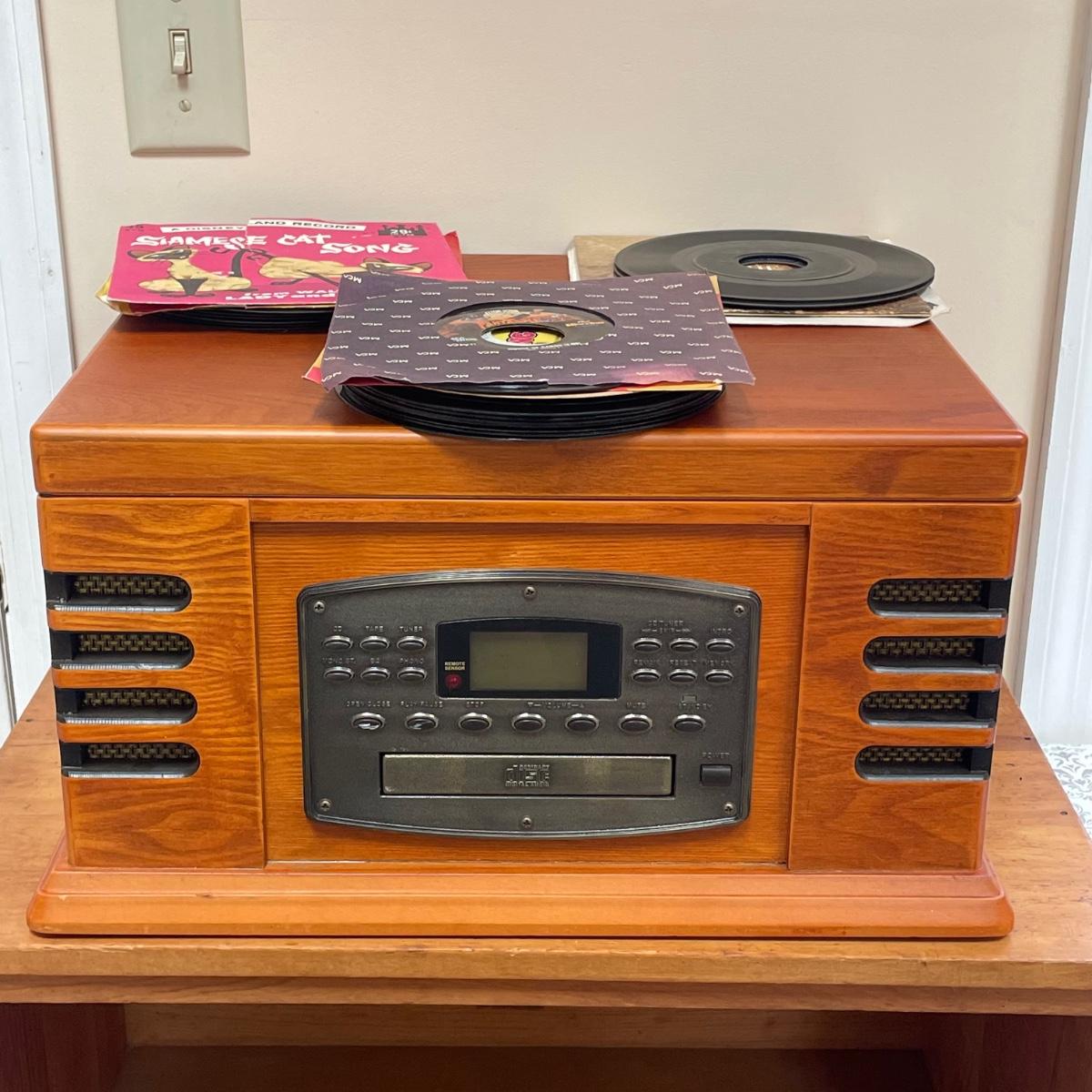 This Crosley unit plays vinyl, CD’s plus cassettes, as well as is a radio. However only vinyl was tested and the sound is great. Model CR 78CD. A good assortment of 45’s are included, see images for titles and note that most do not have sleeves and show scratches. Crosley measures 16.5” x 13” x 9”. The cabinet that it sits on is not included in this lot but is found in this sale.