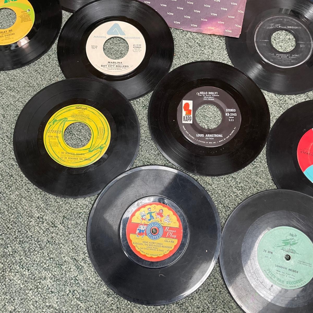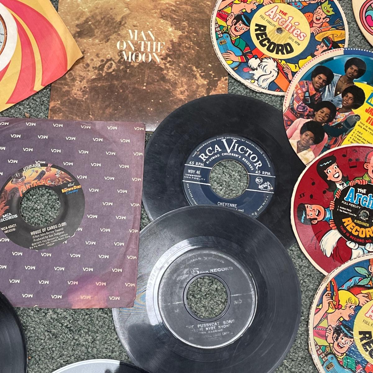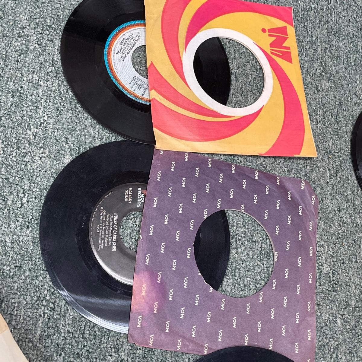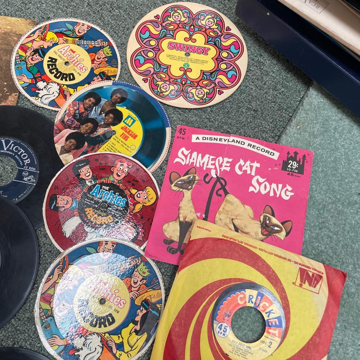 This Crosley unit plays vinyl, CD’s plus cassettes, as well as is a radio. However only vinyl was tested and the sound is great. Model CR 78CD. A good assortment of 45’s are included, see images for titles and note that most do not have sleeves and show scratches. Crosley measures 16.5” x 13” x 9”. The cabinet that it sits on is not included in this lot but is found in this sale.