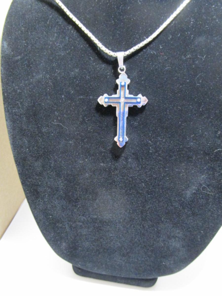 Cross (2" x 1-1/4") with 24" Chain, has blue outline with lobster claw clasp