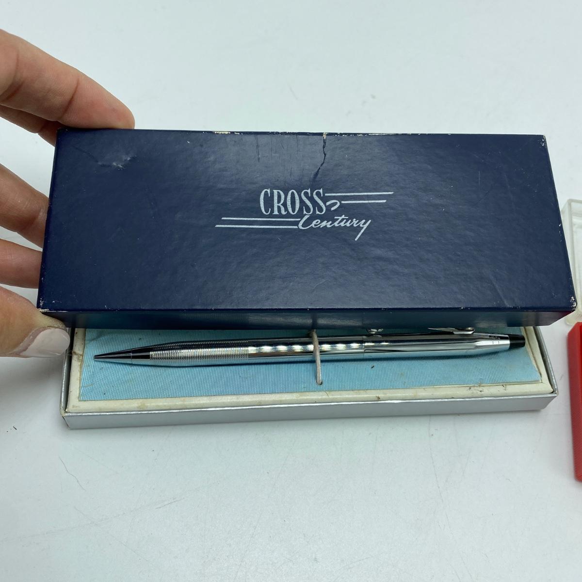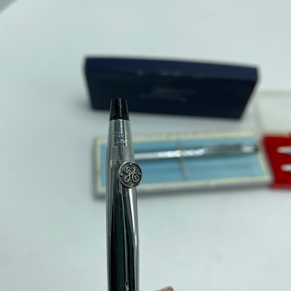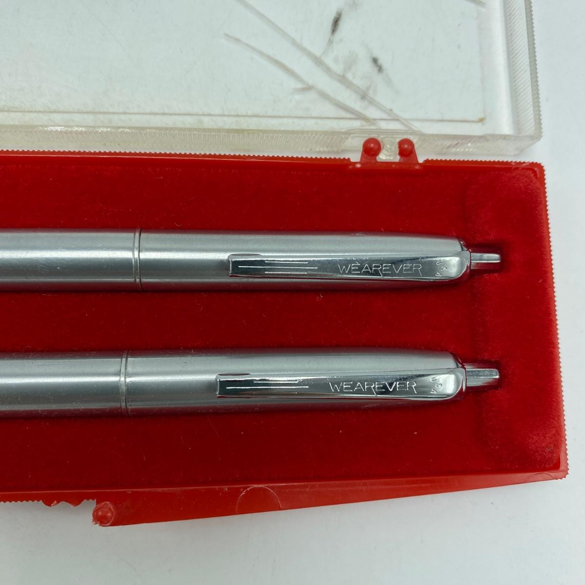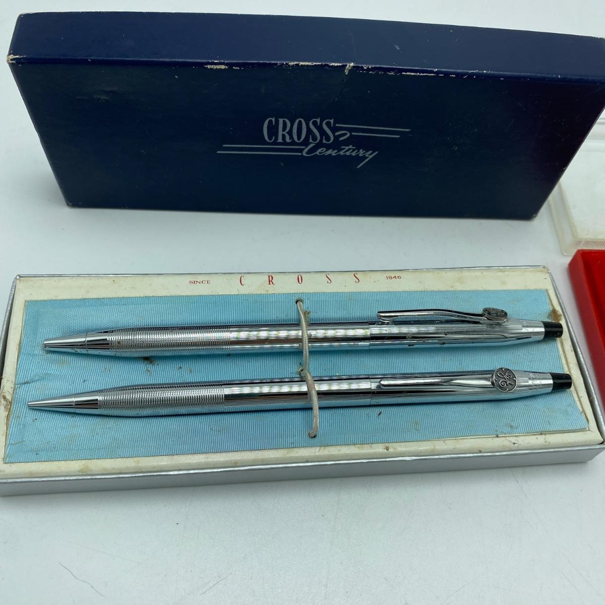 Two vintage pen and pencil sets. One is a Cross Century Set that has a GE logo on it. Comes in blue box. The other is a Wearever set that comes in red plastic box. Both boxes are worn. The Cross pen doesn’t come out when twist back. Could possibly fix. Shipping available.