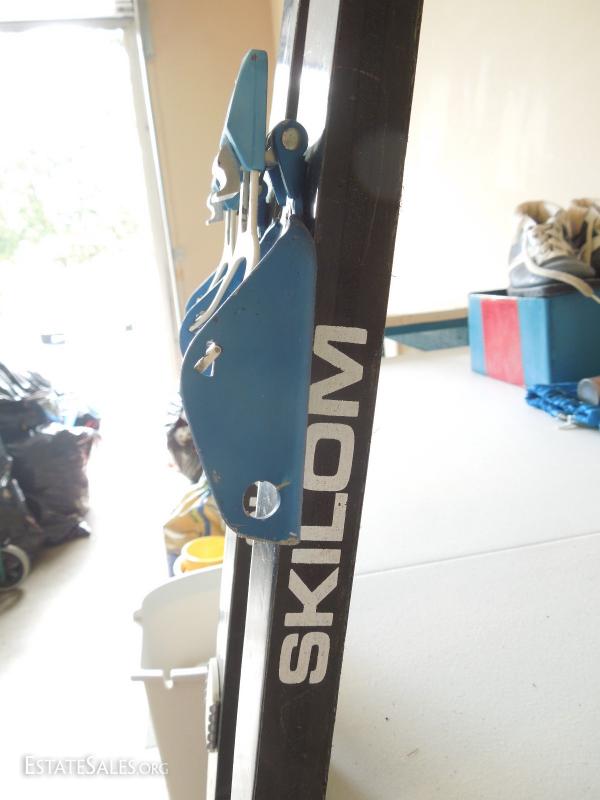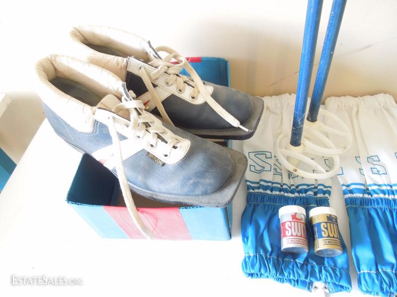Skilom 200 cm nordic skis with metal bindings, Skilom Poles, Women's Size 9 Ski Boots, Skilom Gators, Gold and Silver Wax. Vinyl collar on boots is deteriorating. Very few scratches on ski bottoms. Grips on poles are aging.