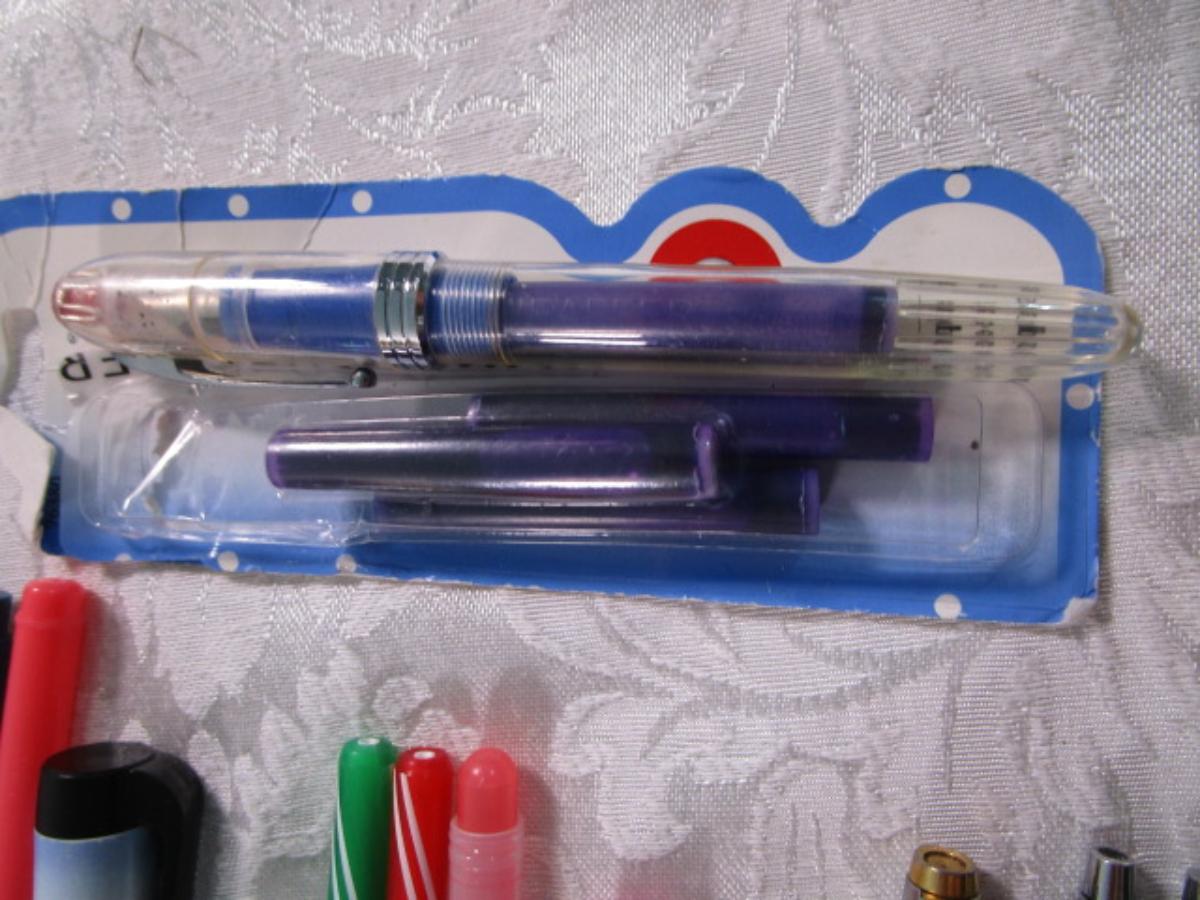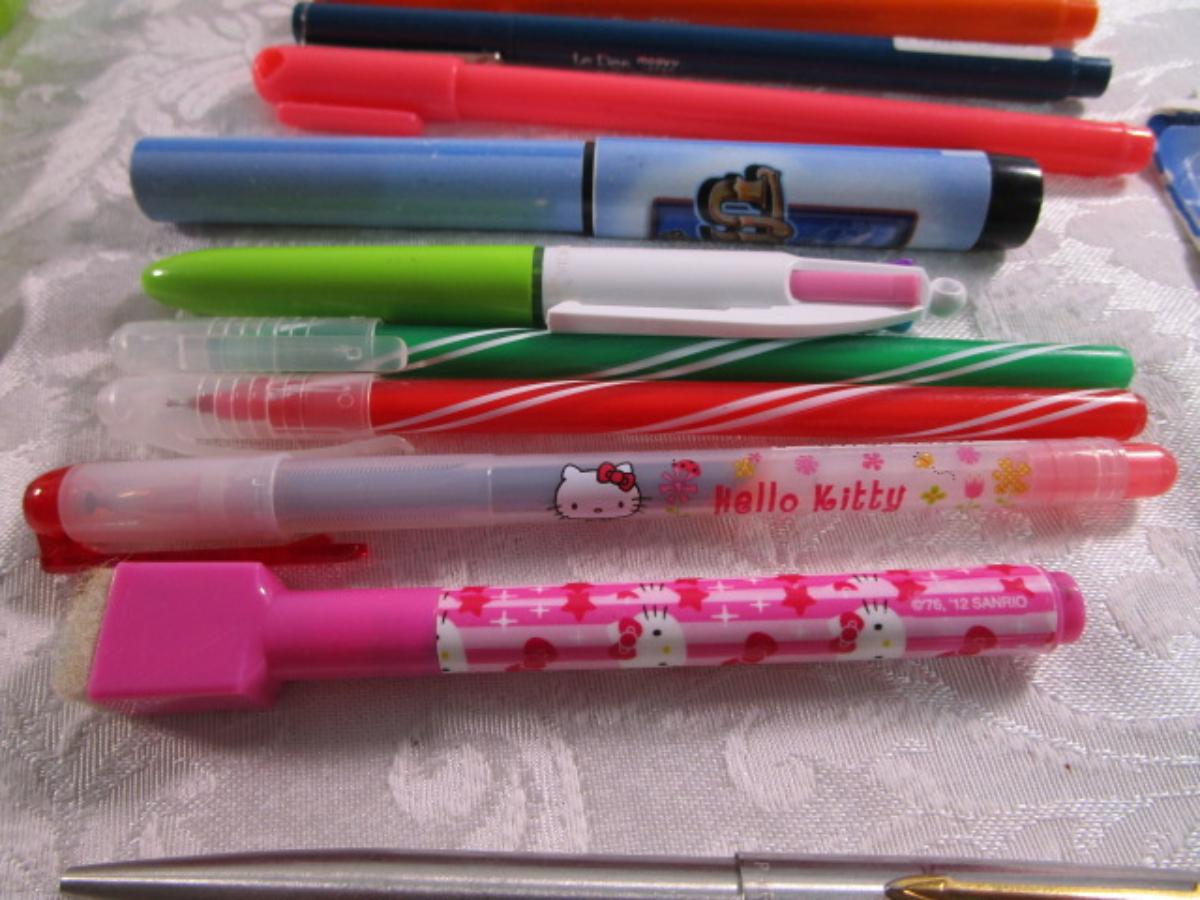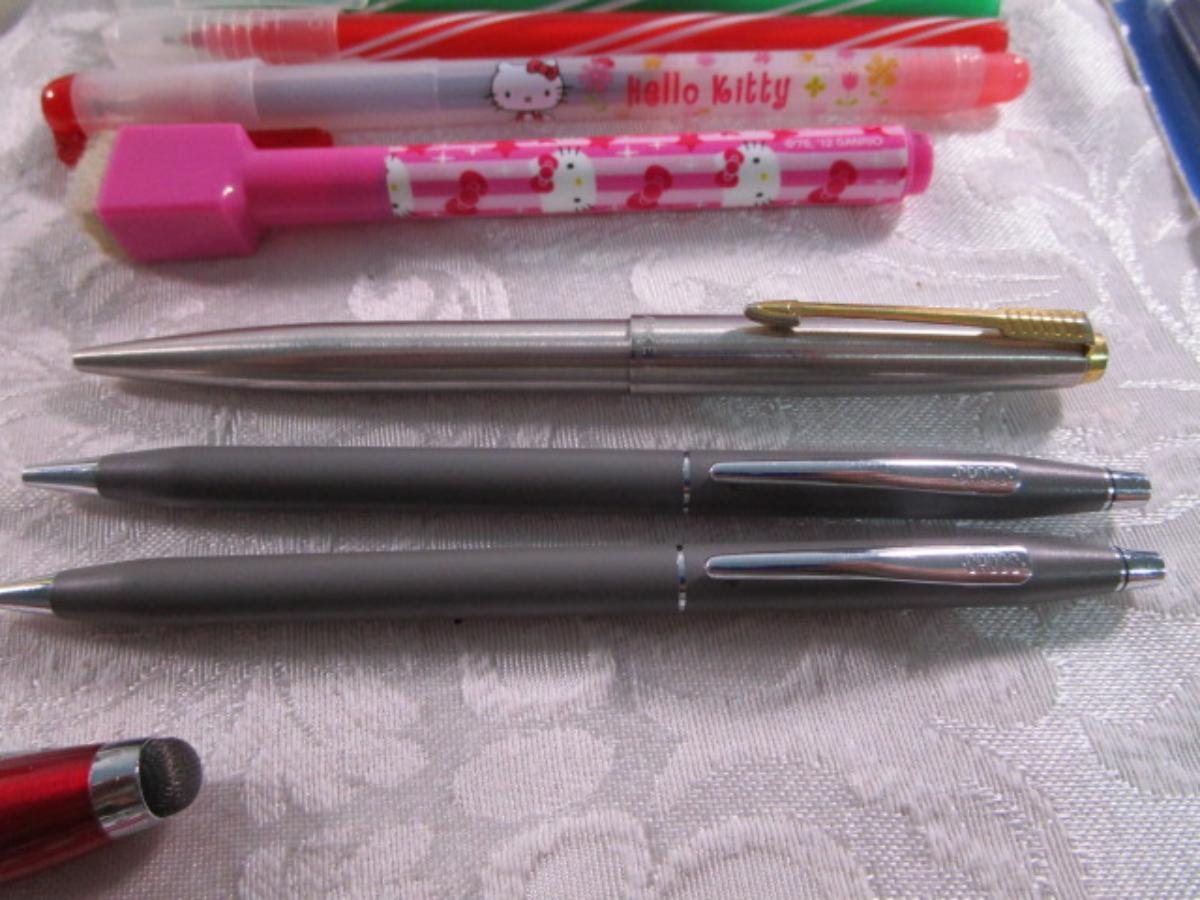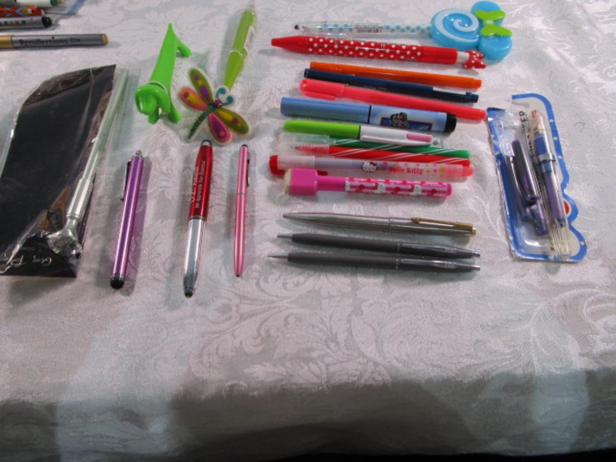 Cross pen & pencil (1 each), 1 Parker pen, specialty pens, 1 stylus,1 gem pen, 1 Fountain pen & cartridges