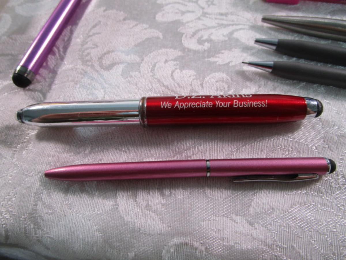 Cross pen & pencil (1 each), 1 Parker pen, 17 specialty pens, 1 stylus