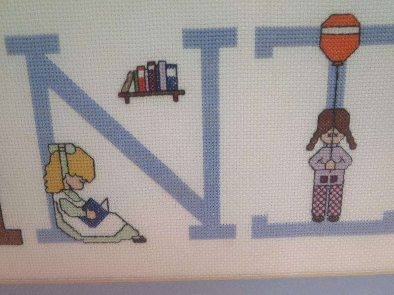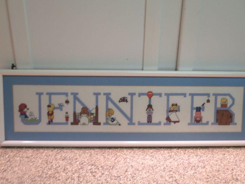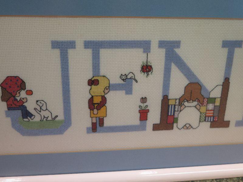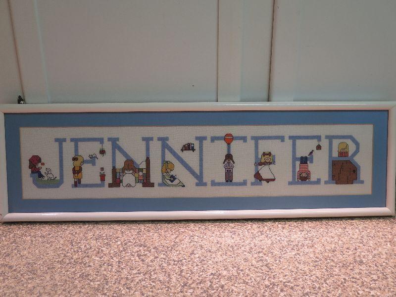 Handcrafted cross stitch for Jennifer. Adorable! 6.5x32 not including framing. Please read Terms and Conditions before placing a bid. Pick up is Friday, October 25th between 4 and 7, and Saturday, October 26th between 9 and 1. Props included in photos are not included in listing. All measurements are approximate. Comes from home with cats.