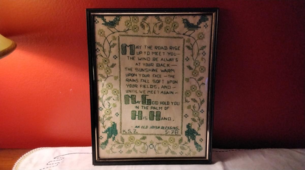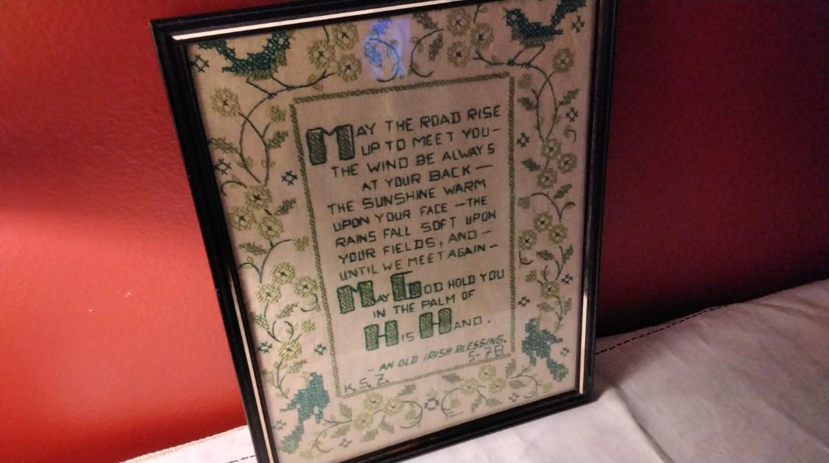 Framed Sampler On Raw Tan Linen With Beautiful Shades of Green