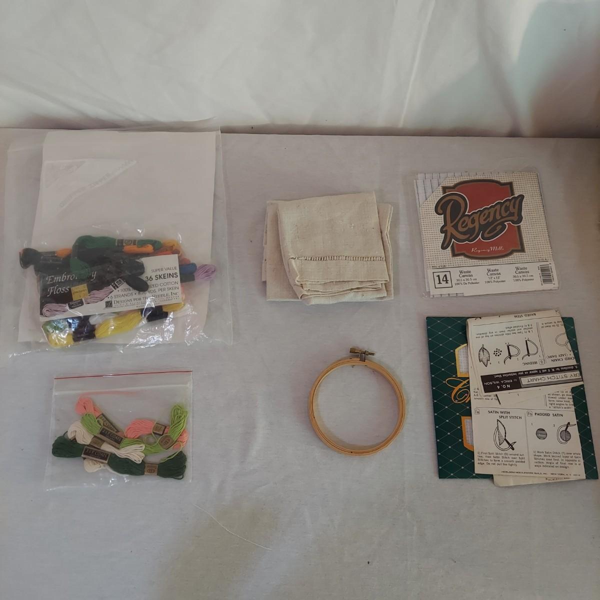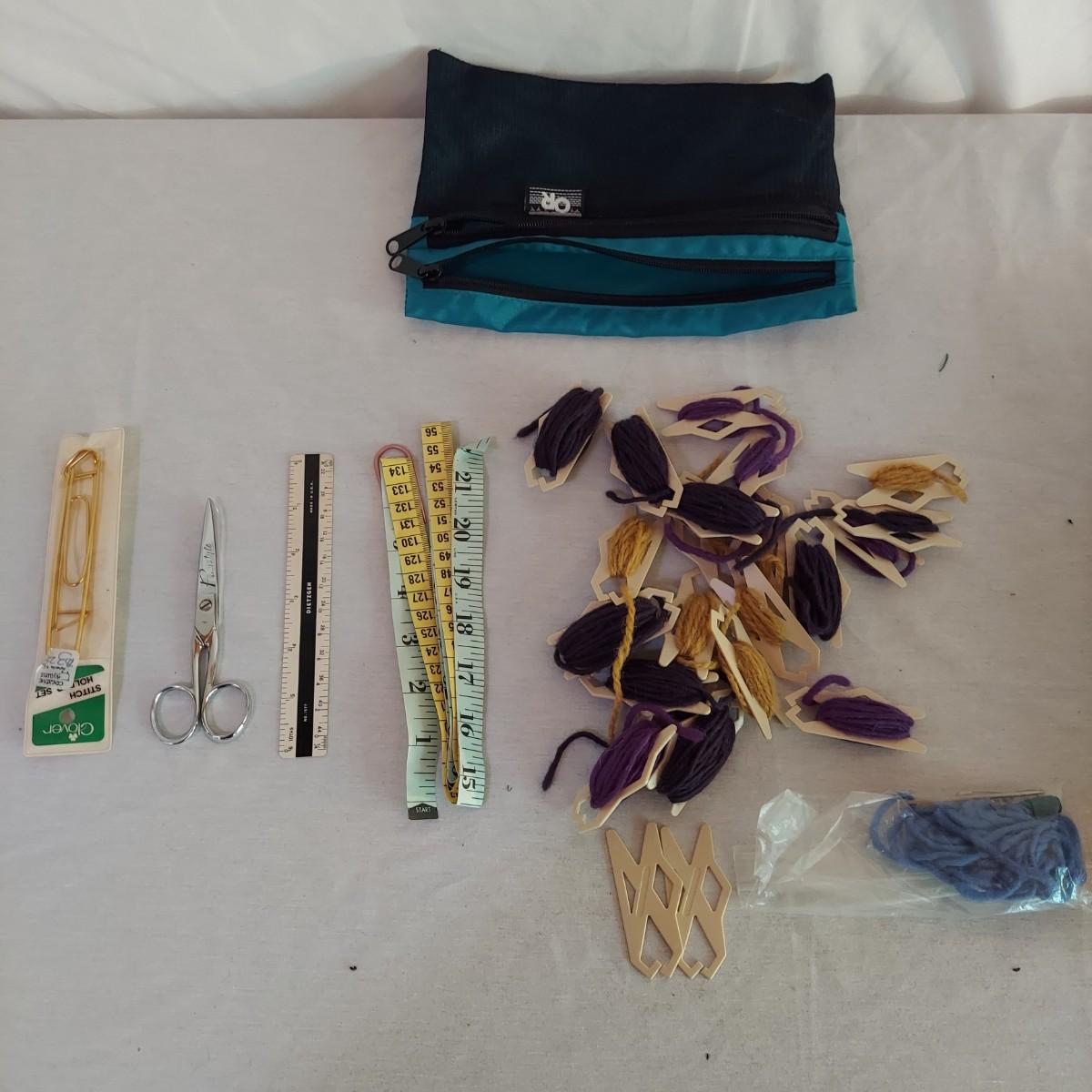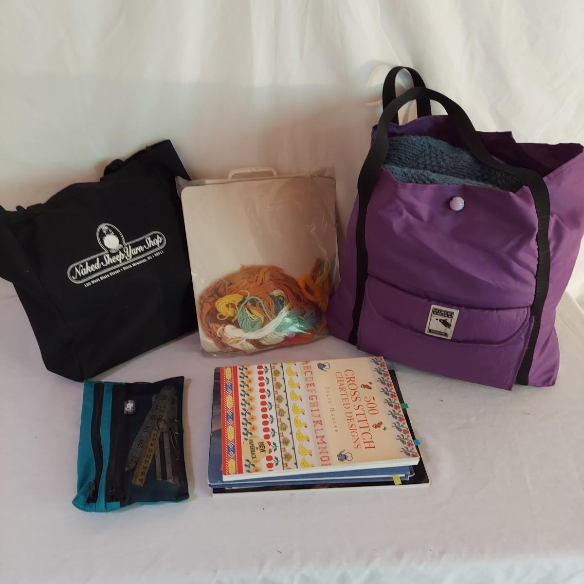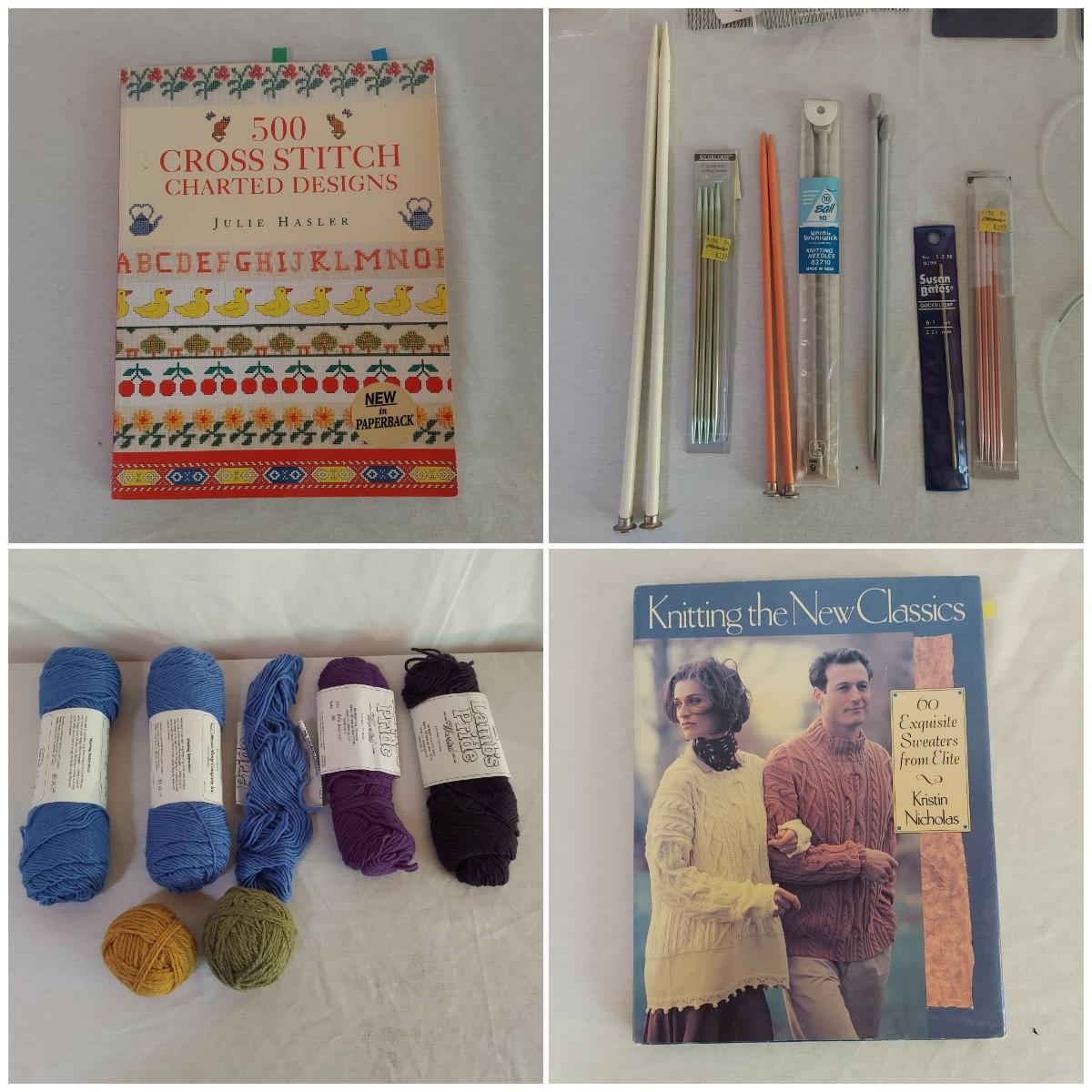 Lot includes four books, several skeins of yarn, different sizes of knitting needles, embroidery thread, hoops and more. There are two unfinished projects with the supplies to finish them. Plus a pair of vintage INOX France fold up pocket scissors with case. Please see photos for details. Shipping available