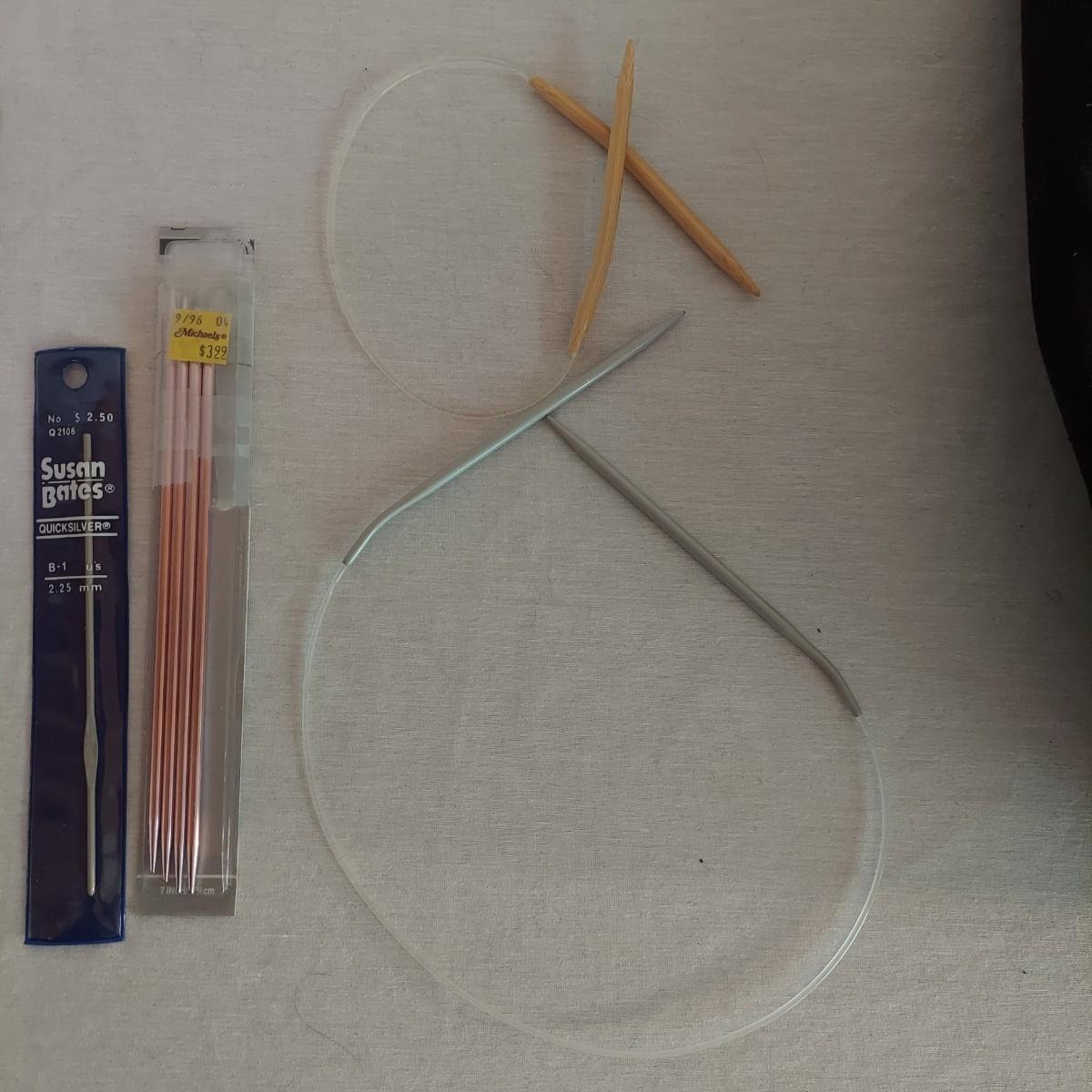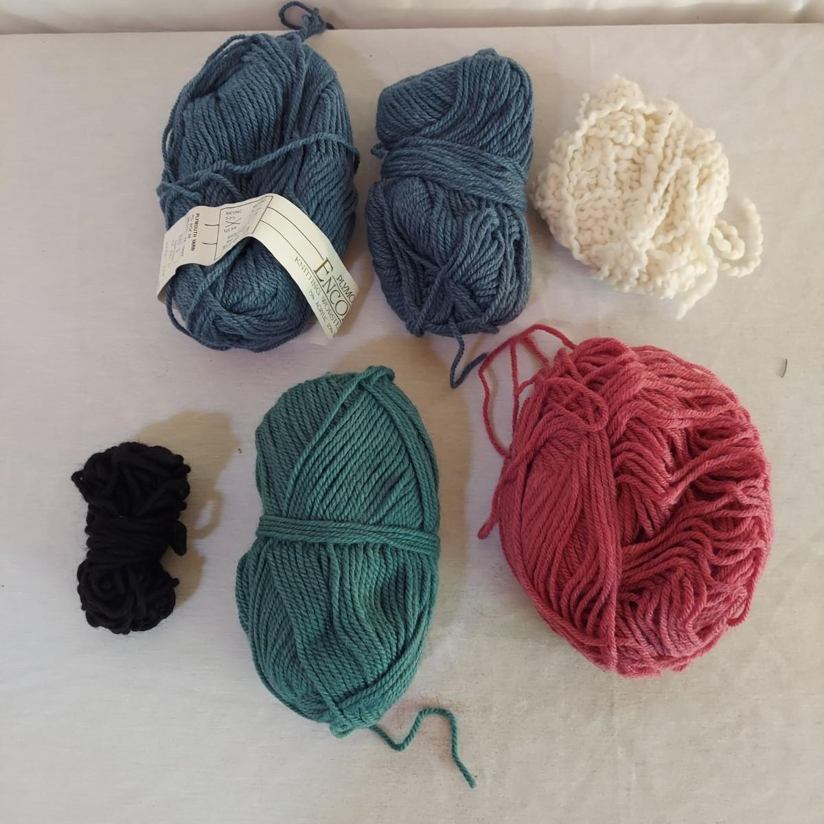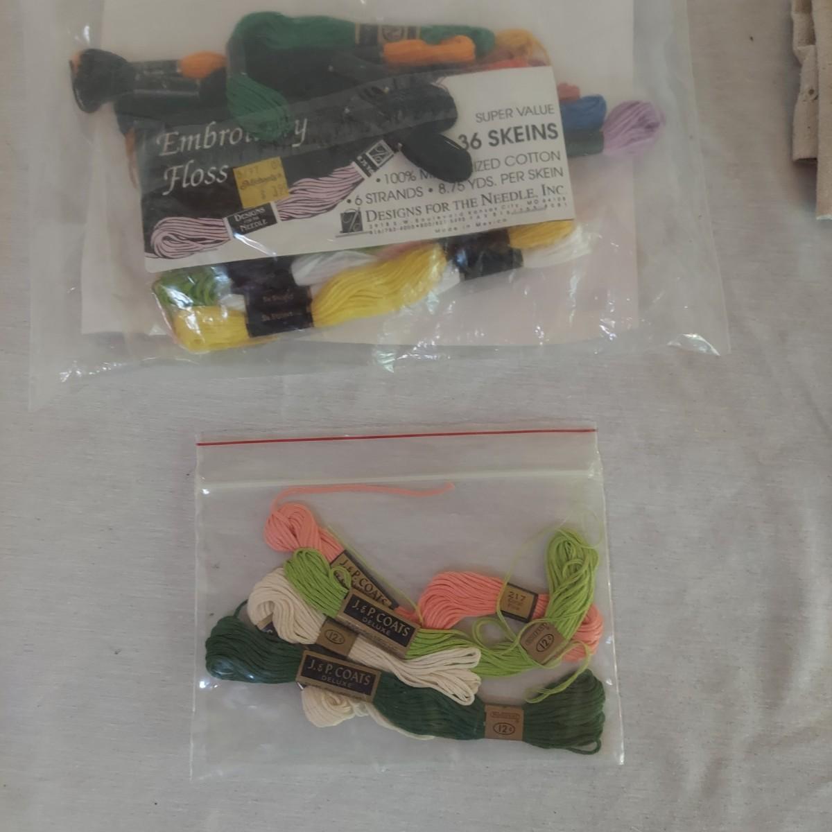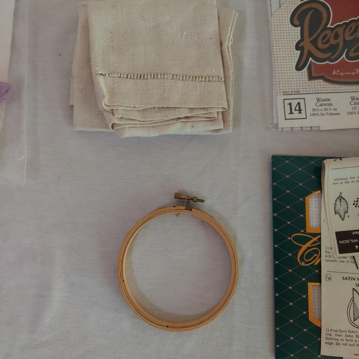 Lot includes four books, several skeins of yarn, different sizes of knitting needles, embroidery thread, hoops and more. There are two unfinished projects with the supplies to finish them. Plus a pair of vintage INOX France fold up pocket scissors with case. Please see photos for details. Shipping available