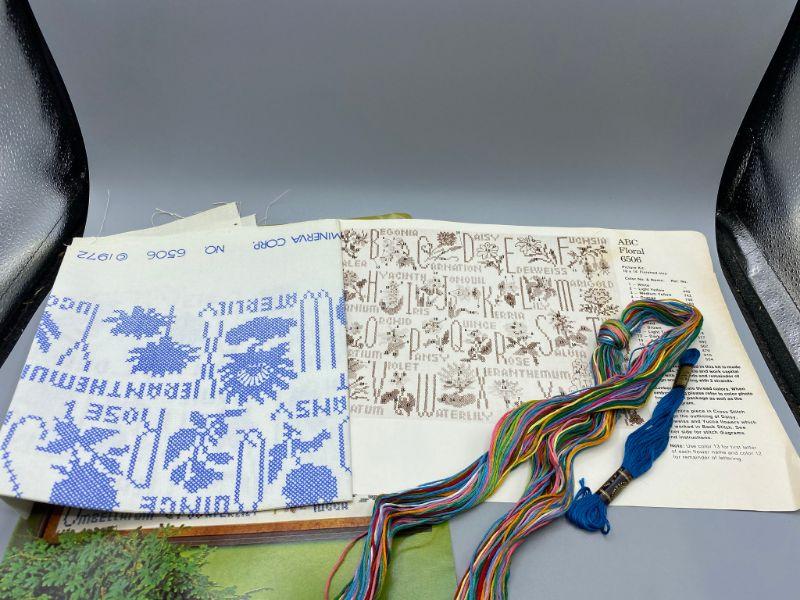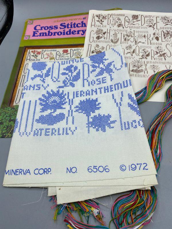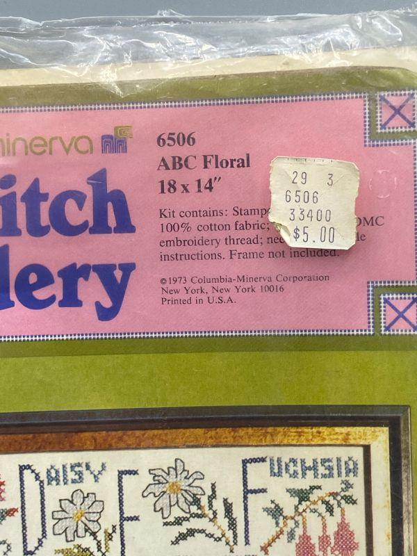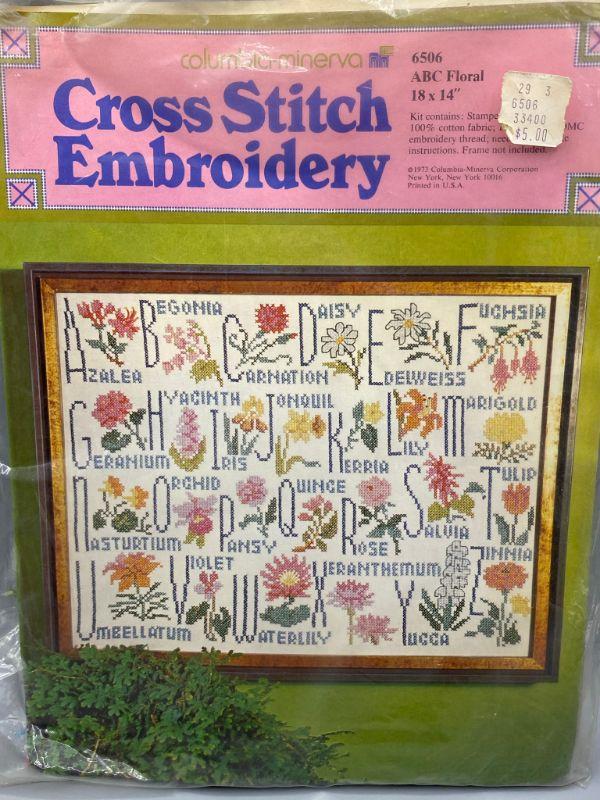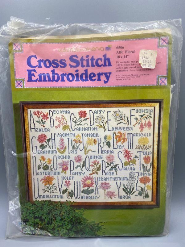 Vintage cross stitch embroidery kit from Columbia Minerva. #6506 ABC Floral. Measures 18"x14". Opened kit but looks to be complete. Copyright 1972.