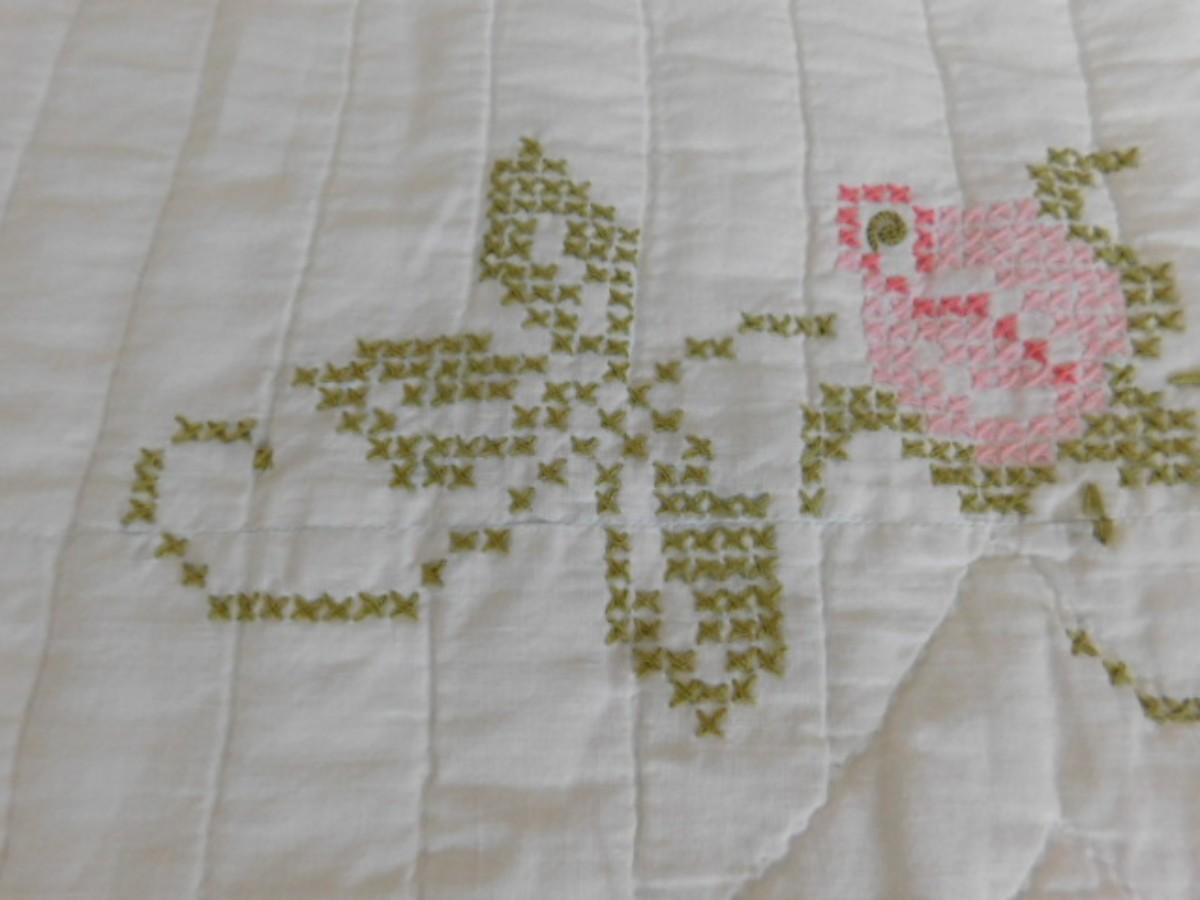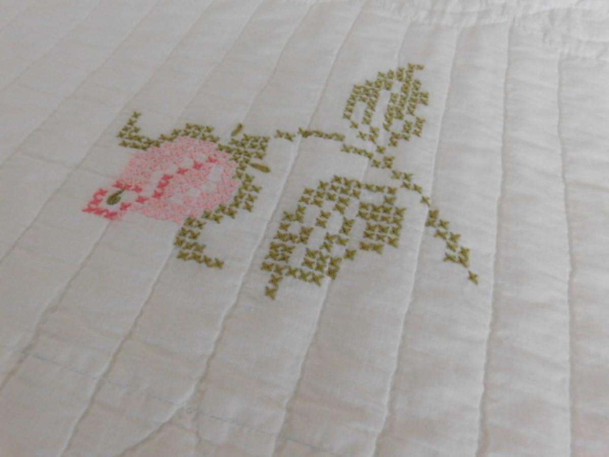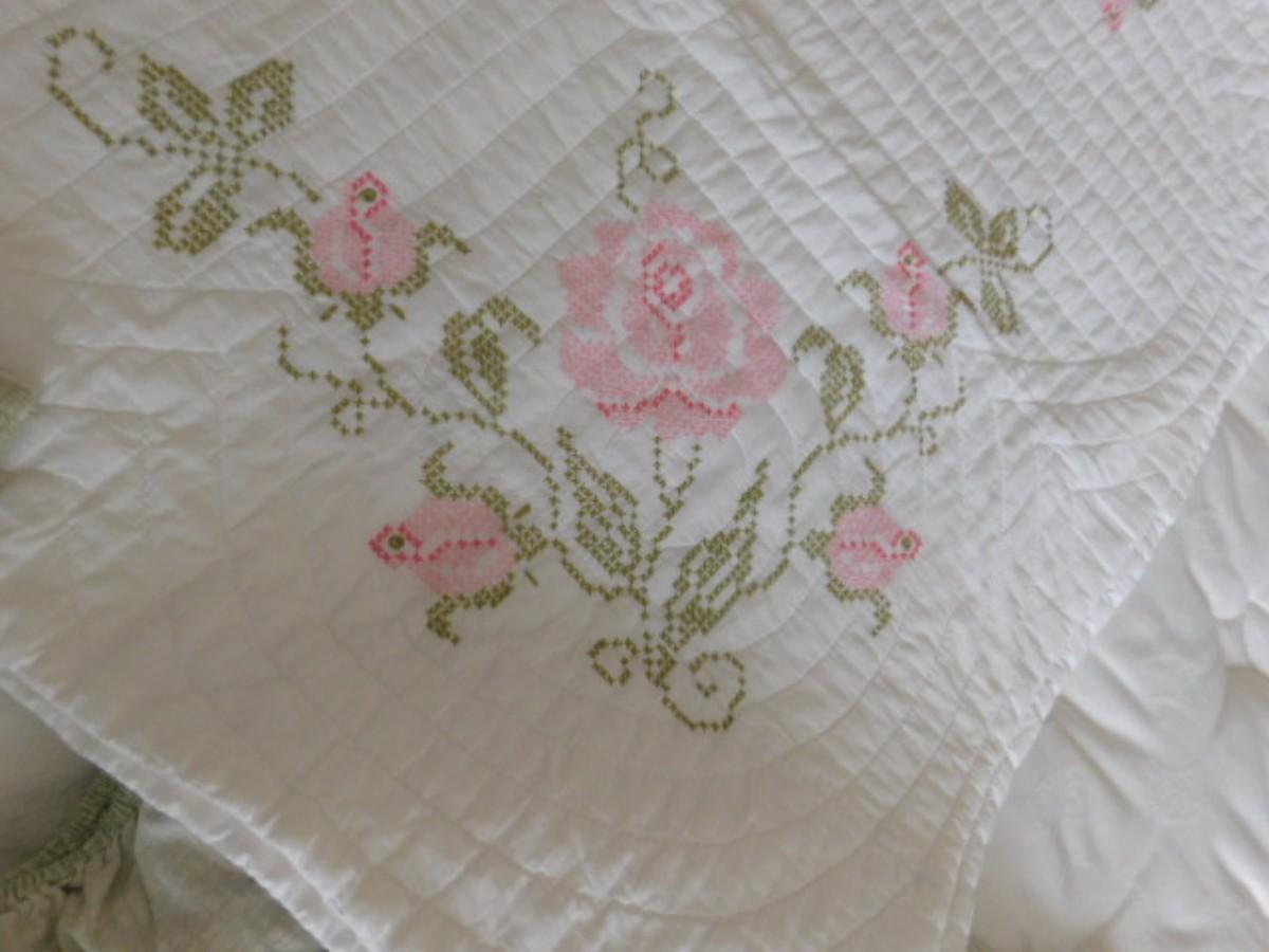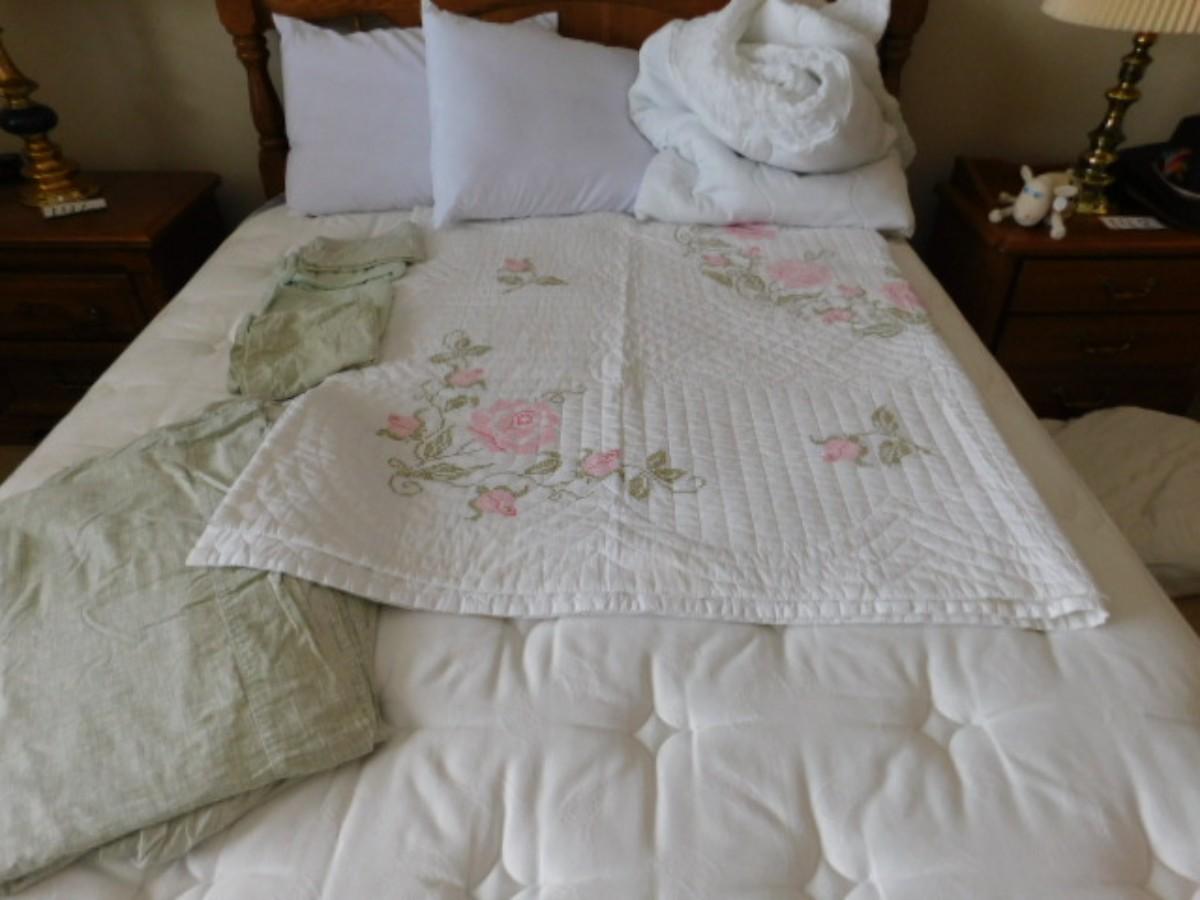 CROSS STITCHED BY HAND QUILTED BLANKET (80X92) WITH SHEETS MATTRESS PAD AND STANDARD SIZE PILLOWS