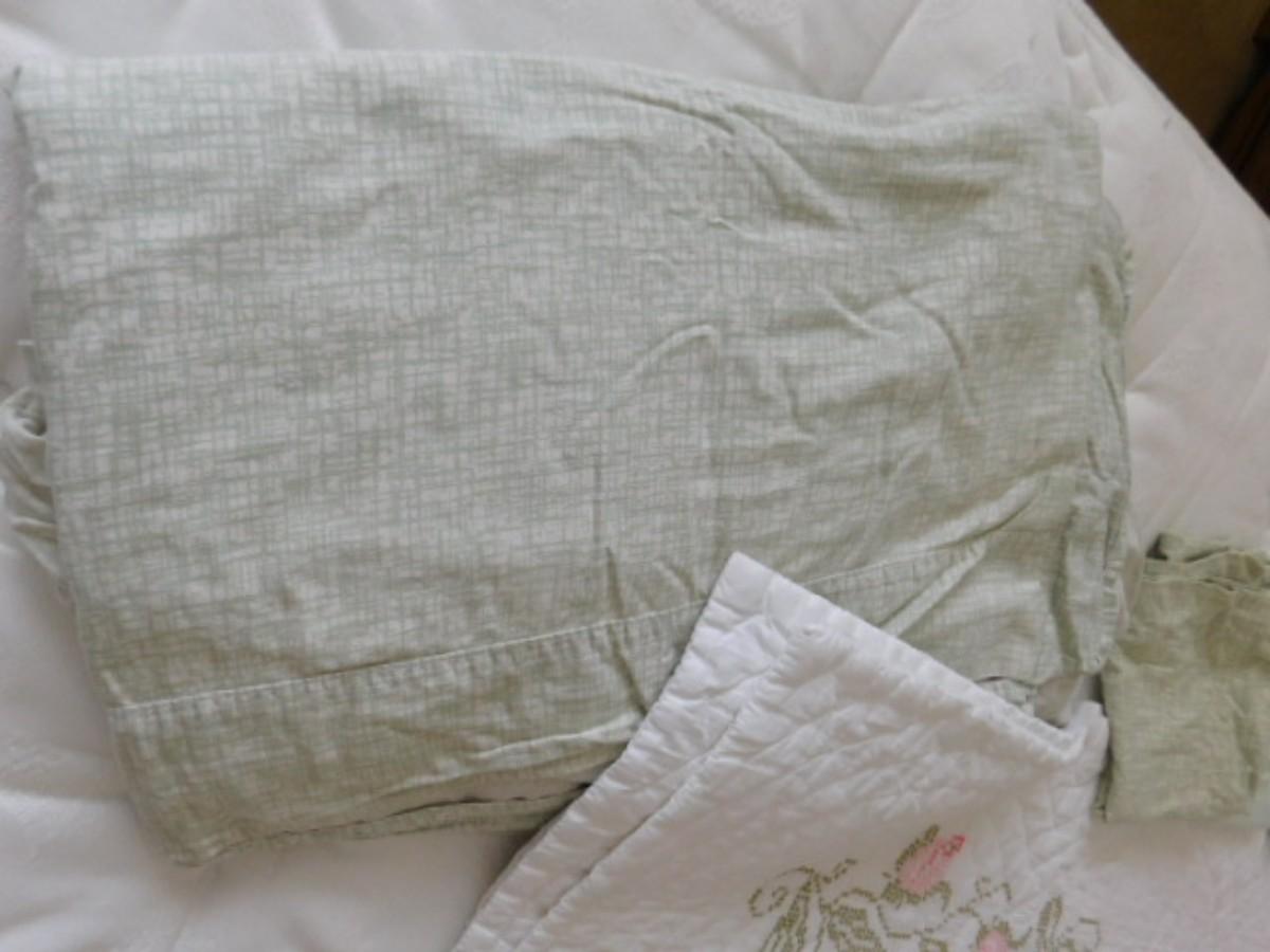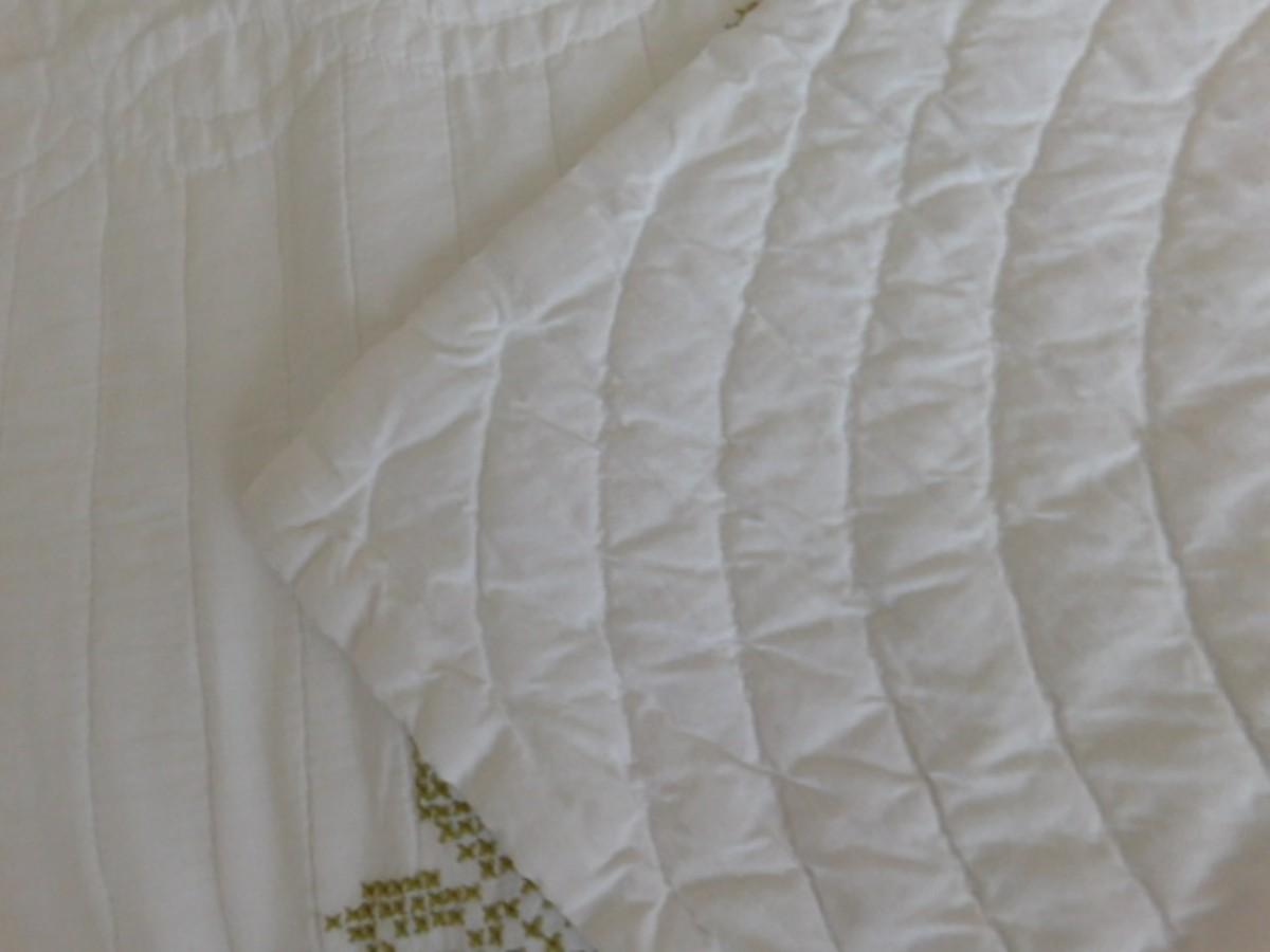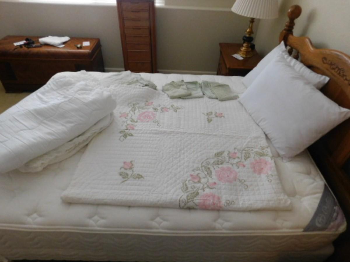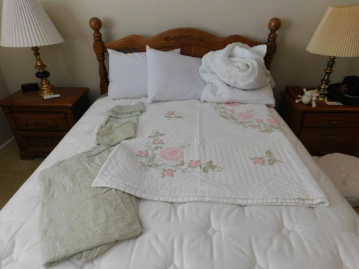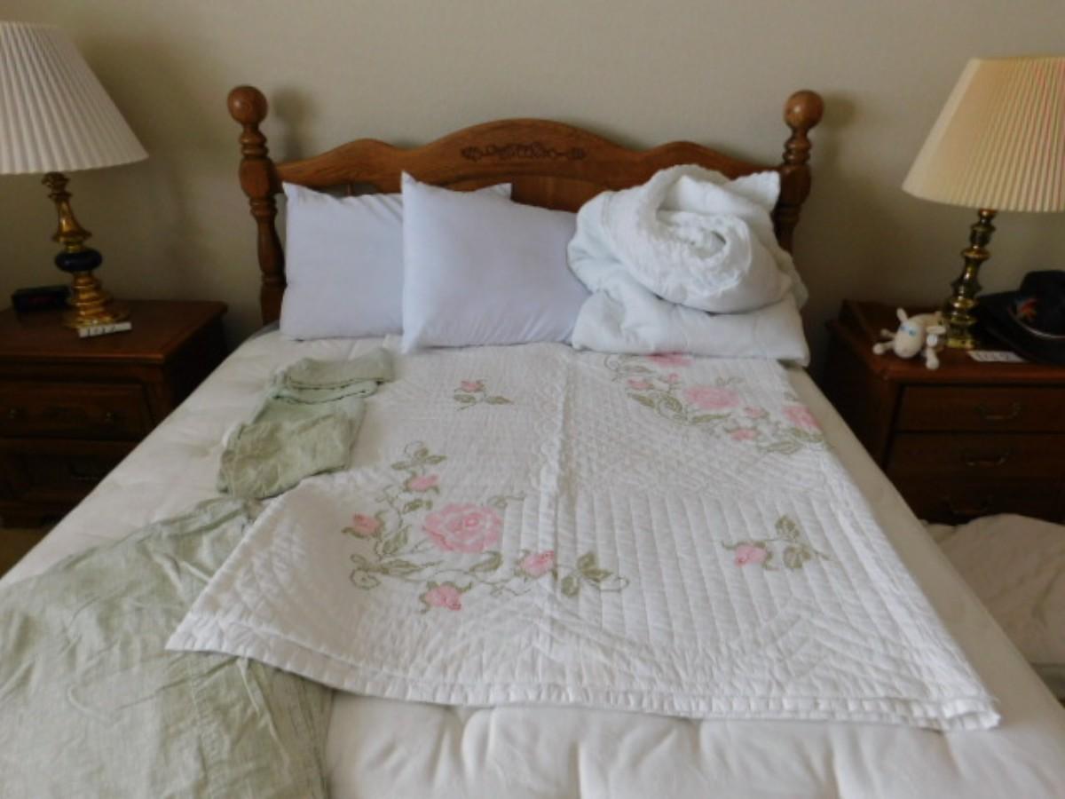 CROSS STITCHED BY HAND QUILTED BLANKET (80X92) WITH SHEETS MATTRESS PAD AND STANDARD SIZE PILLOWS