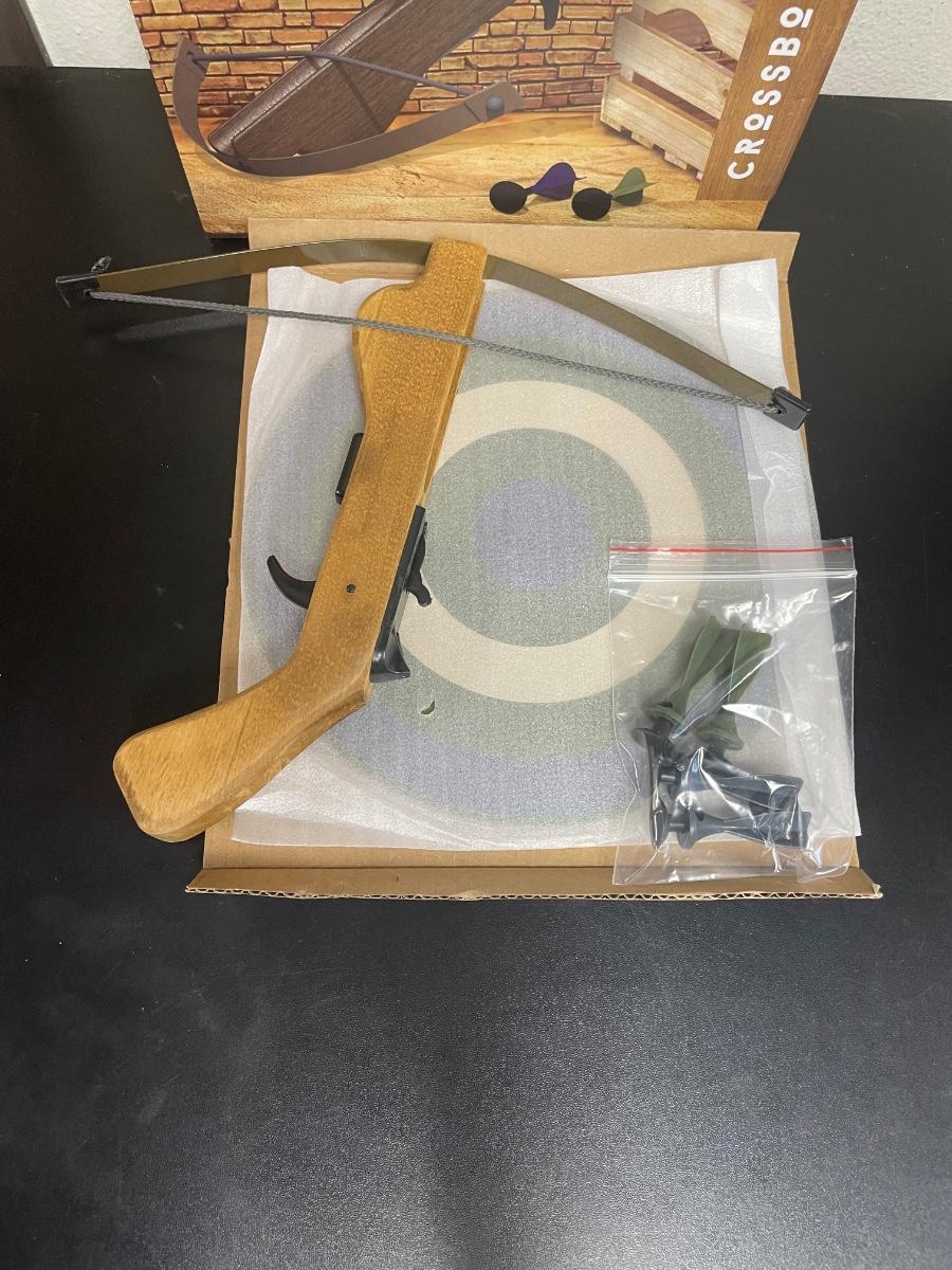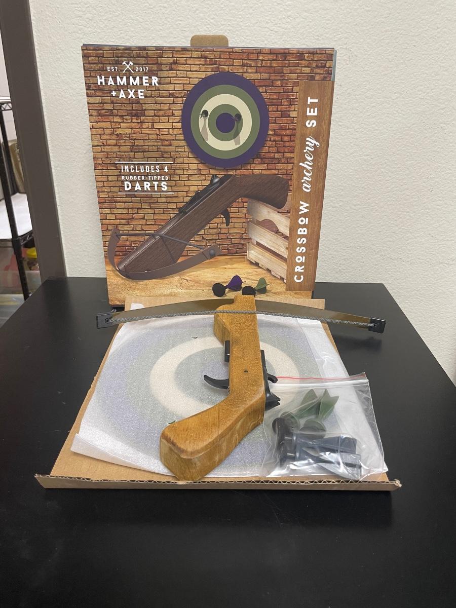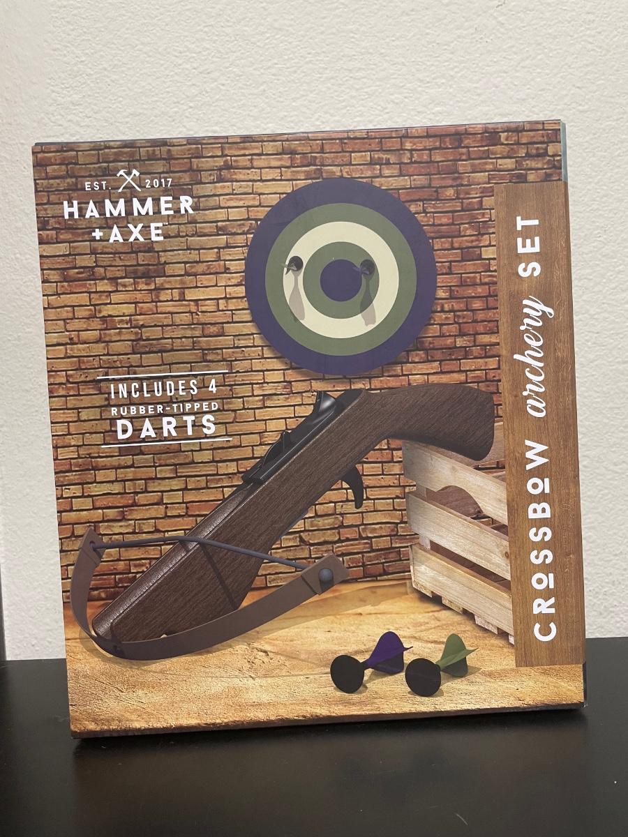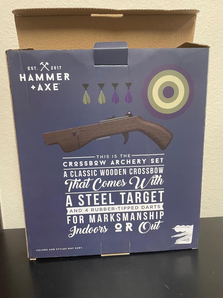 By Hammer + Axe. Game includes round metal target, 4 suction cup darts, and small wooden crossbow.